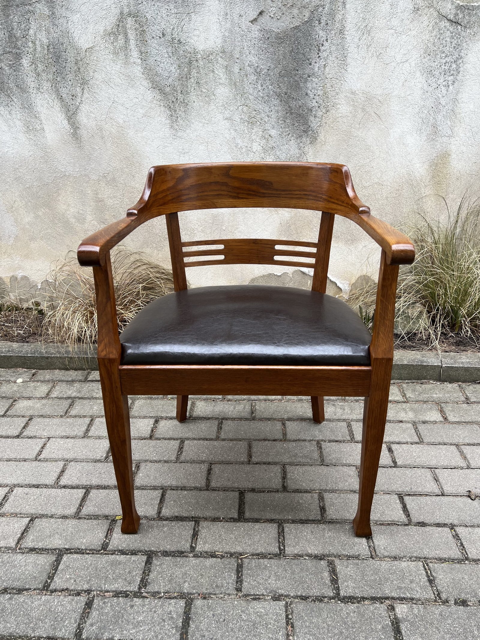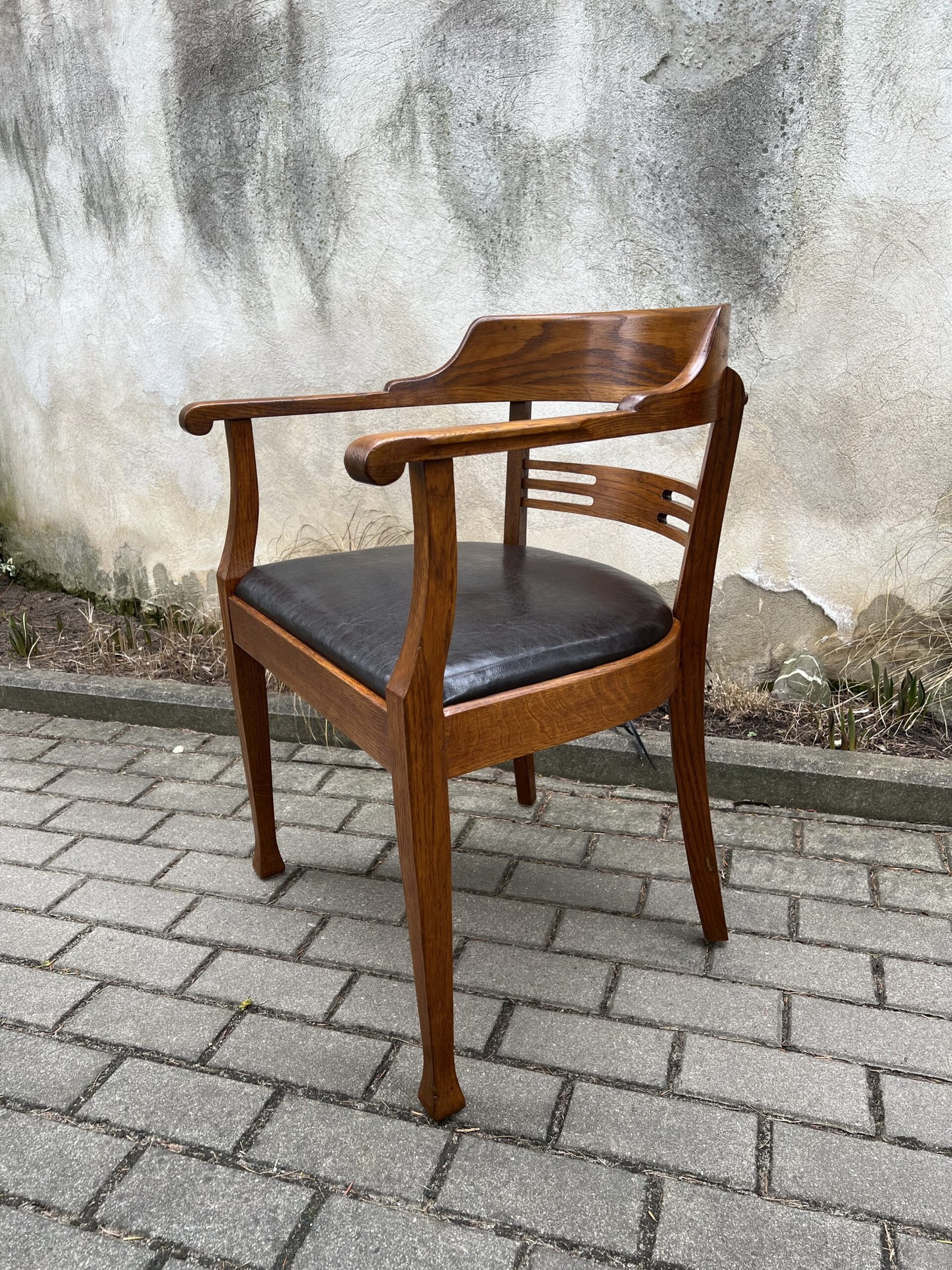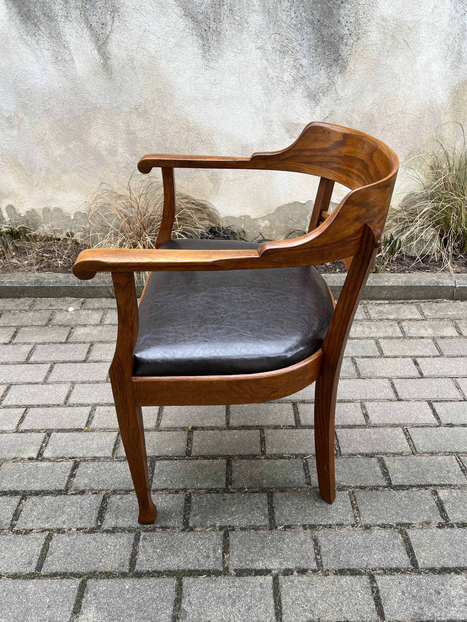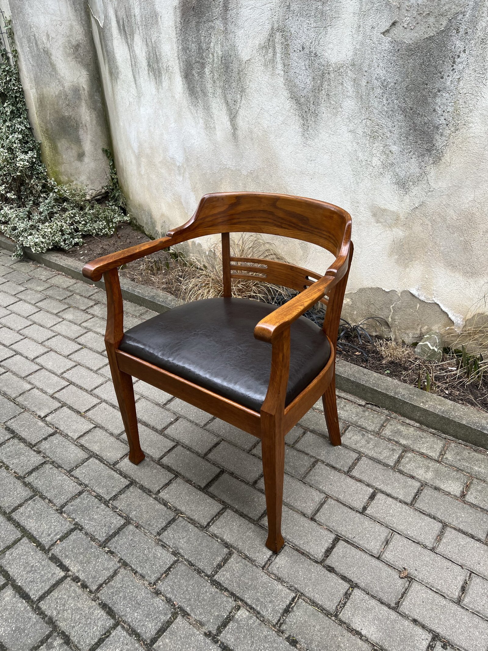 Krėslas antikvarinis, rašomojo stalo, Secesijos stiliaus, odinis. Tvirtas ir patogus, restauruotas. Darbo kėdė su porankiais. Kaina 278