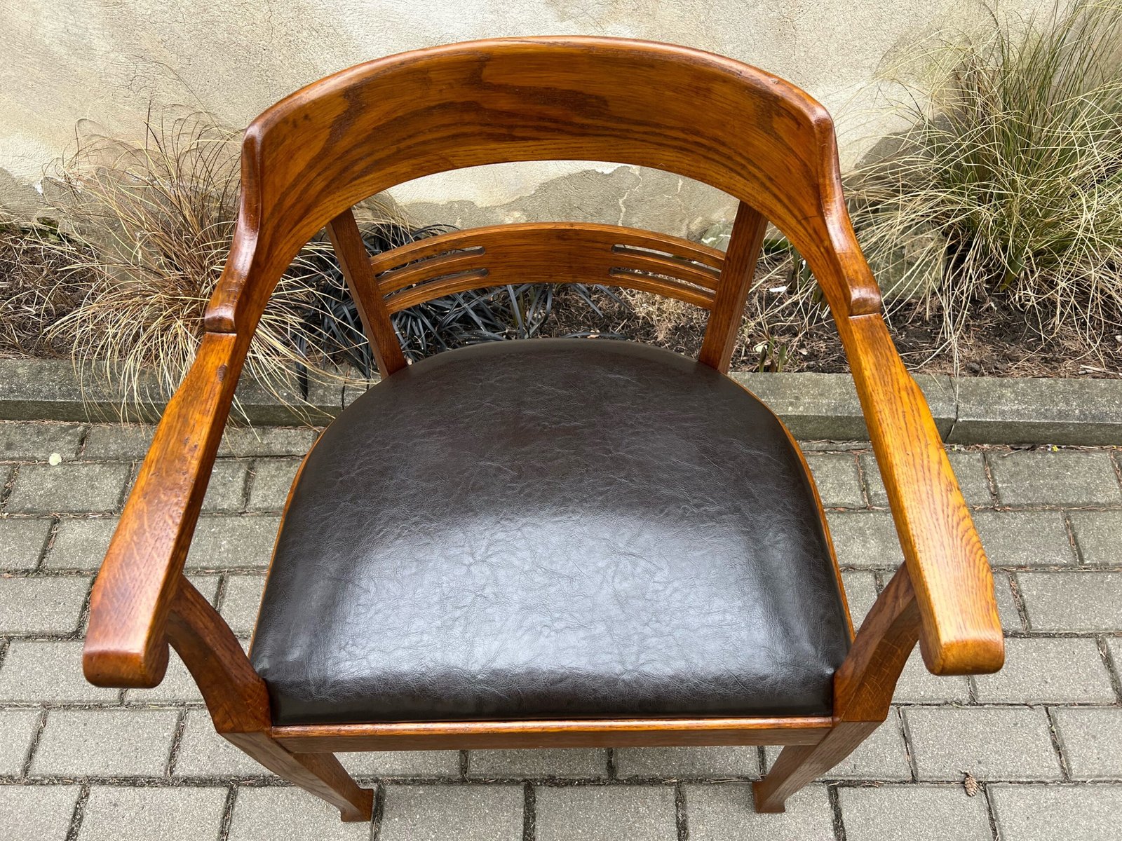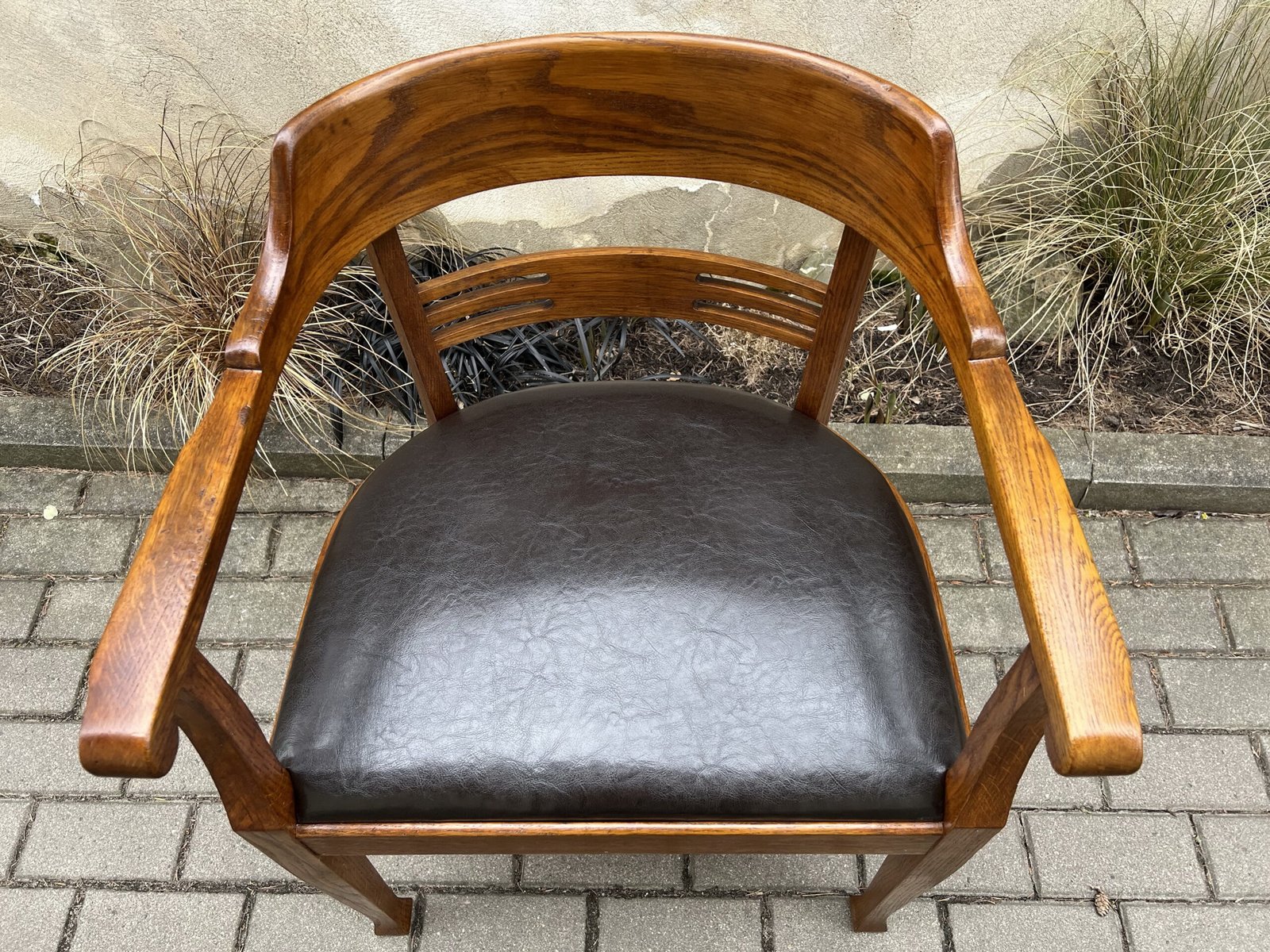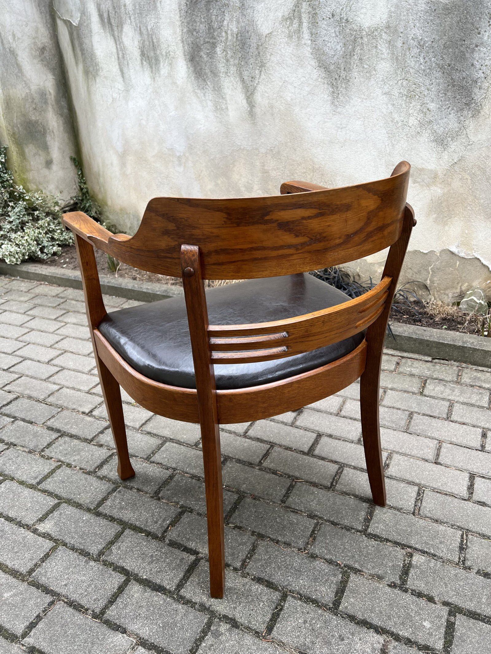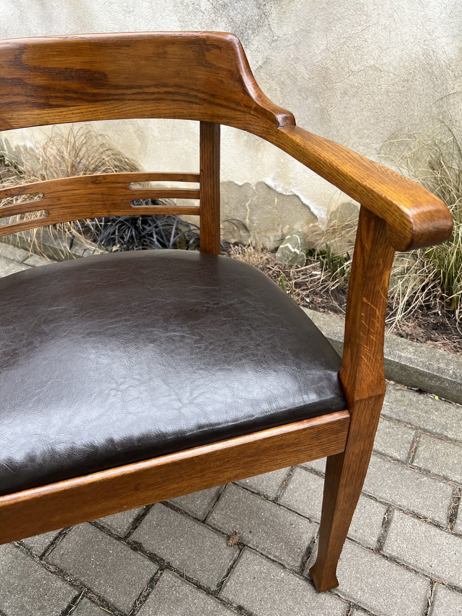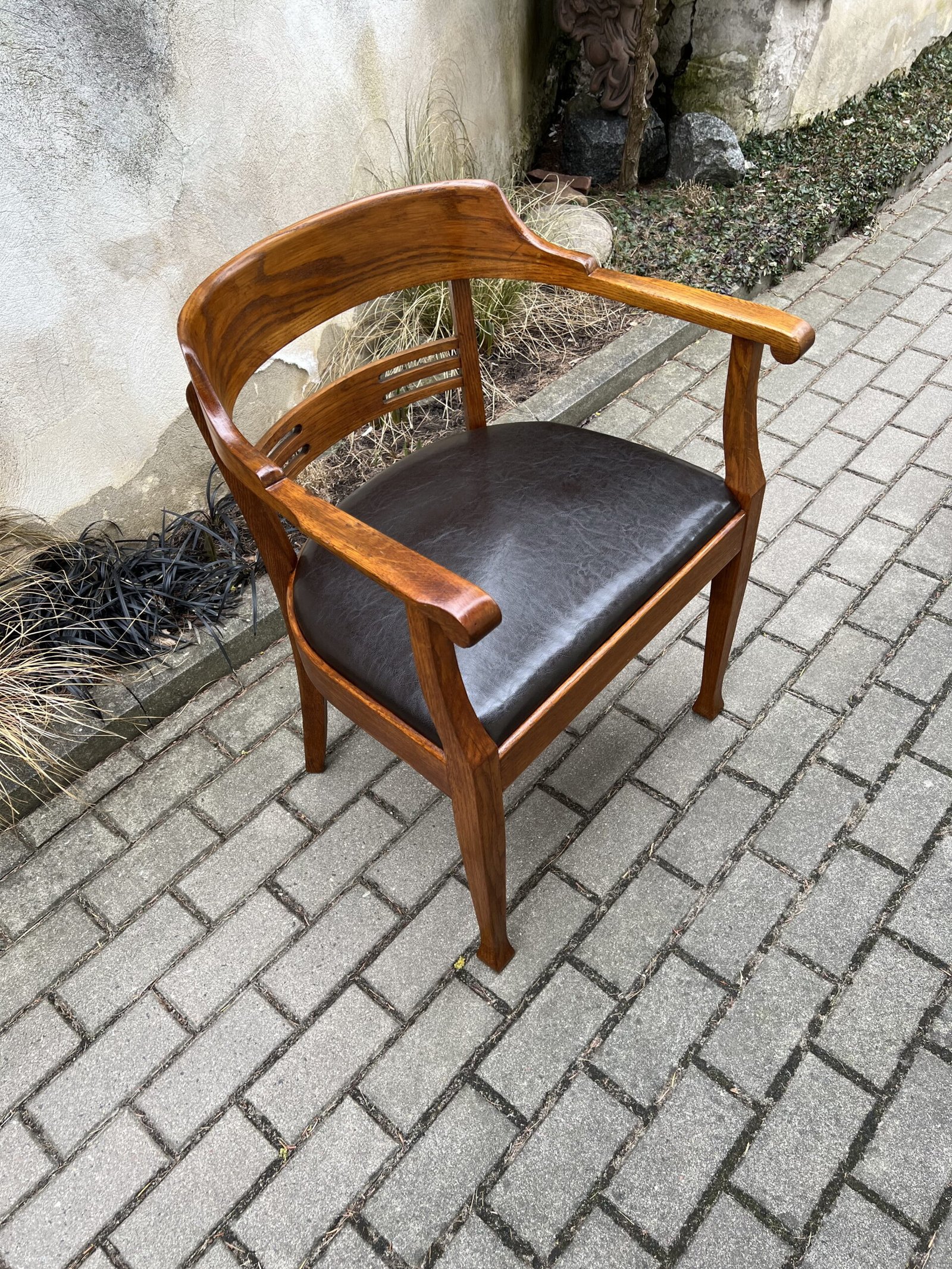Krėslas antikvarinis, rašomojo stalo, Secesijos stiliaus, odinis. Tvirtas ir patogus, restauruotas. Darbo kėdė su porankiais. Kaina 278