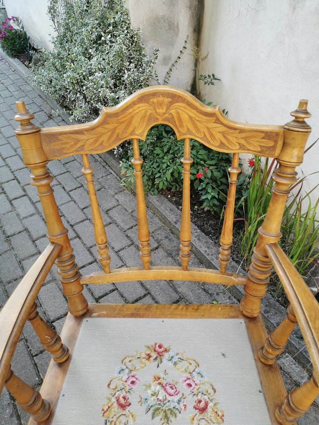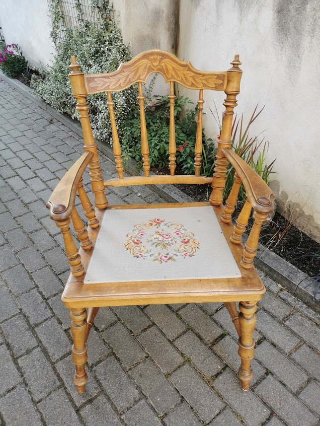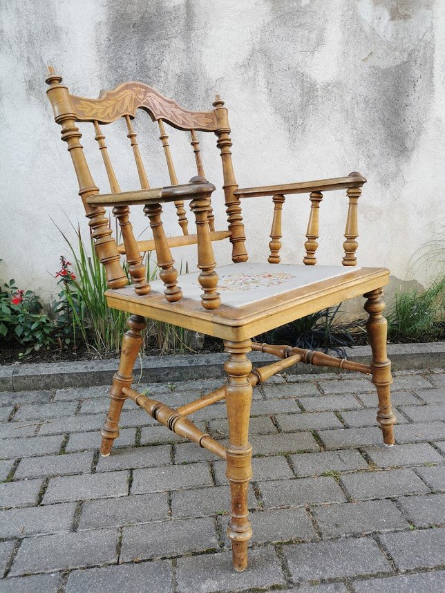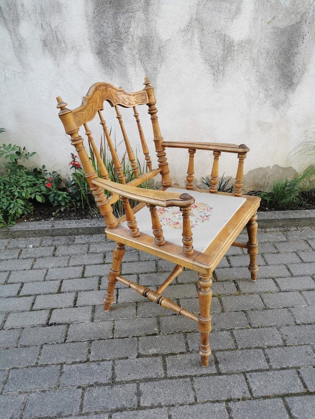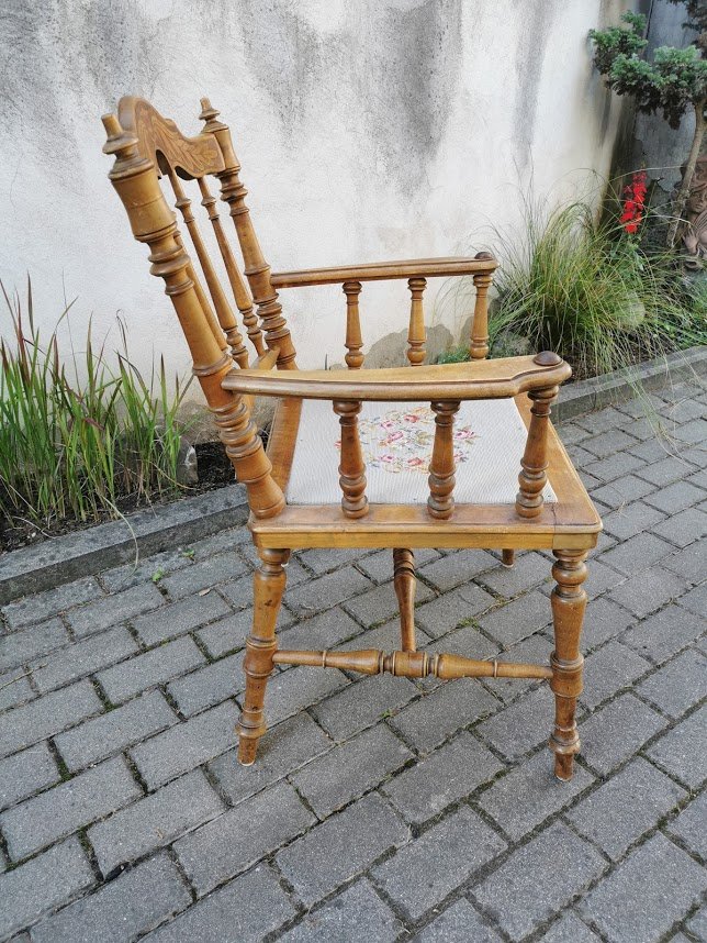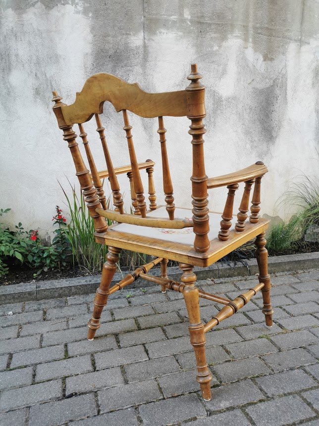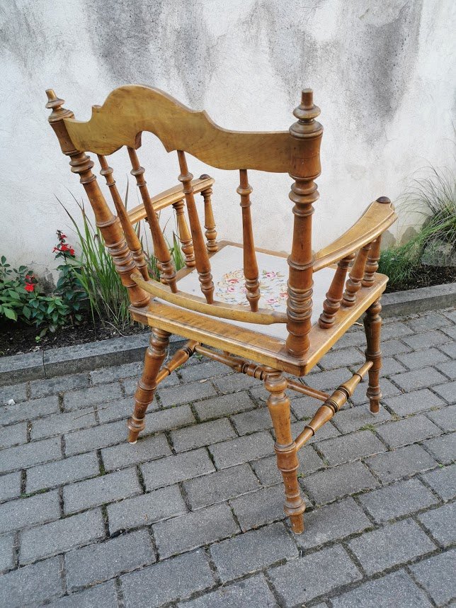 Krėslas antikvarinis, tekintas, kėdė su porankiais, darbo kambario kėdė. Kaina 88
