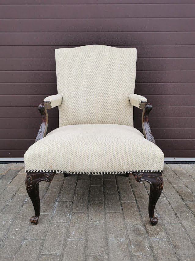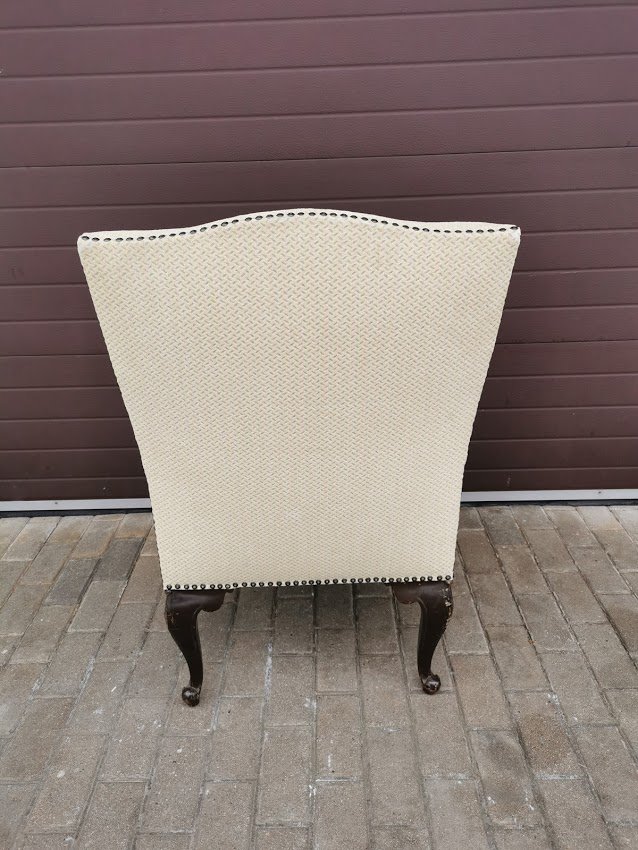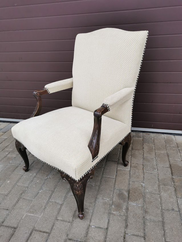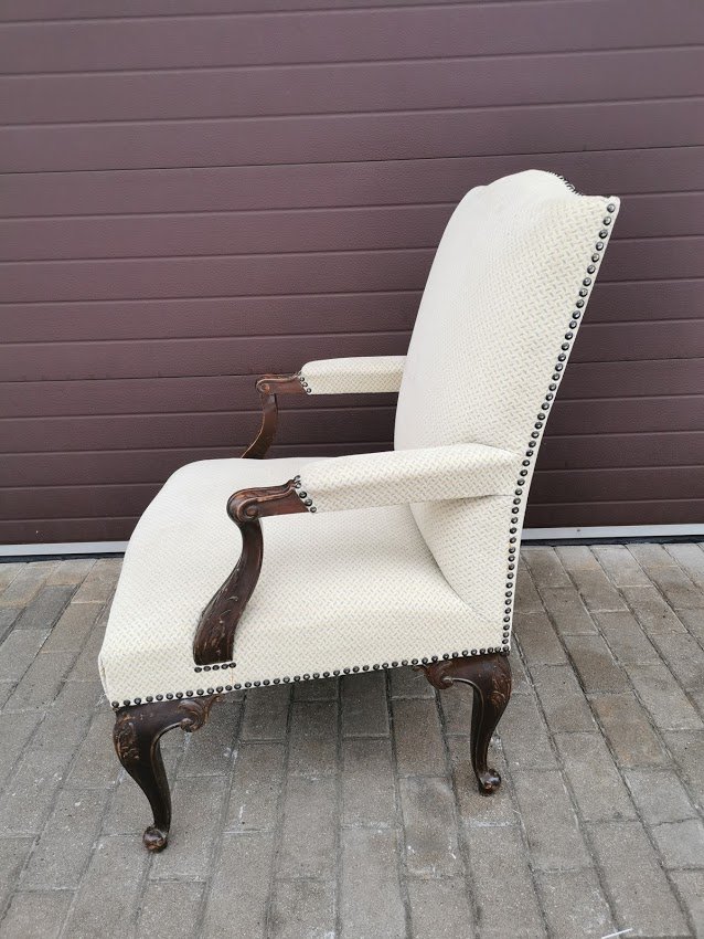 Krėslas, fotelis antikvarinis, patogus. Plotis 70 cm, gylis 70 cm, atkaltės aukštis 100 cm,, sėdimos dalies aukštis 45 cm. Kaina 147
