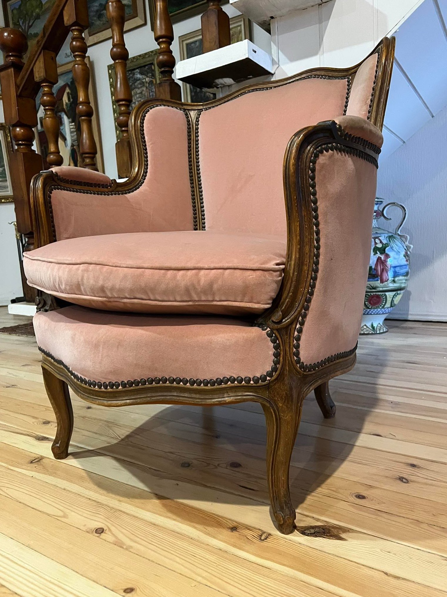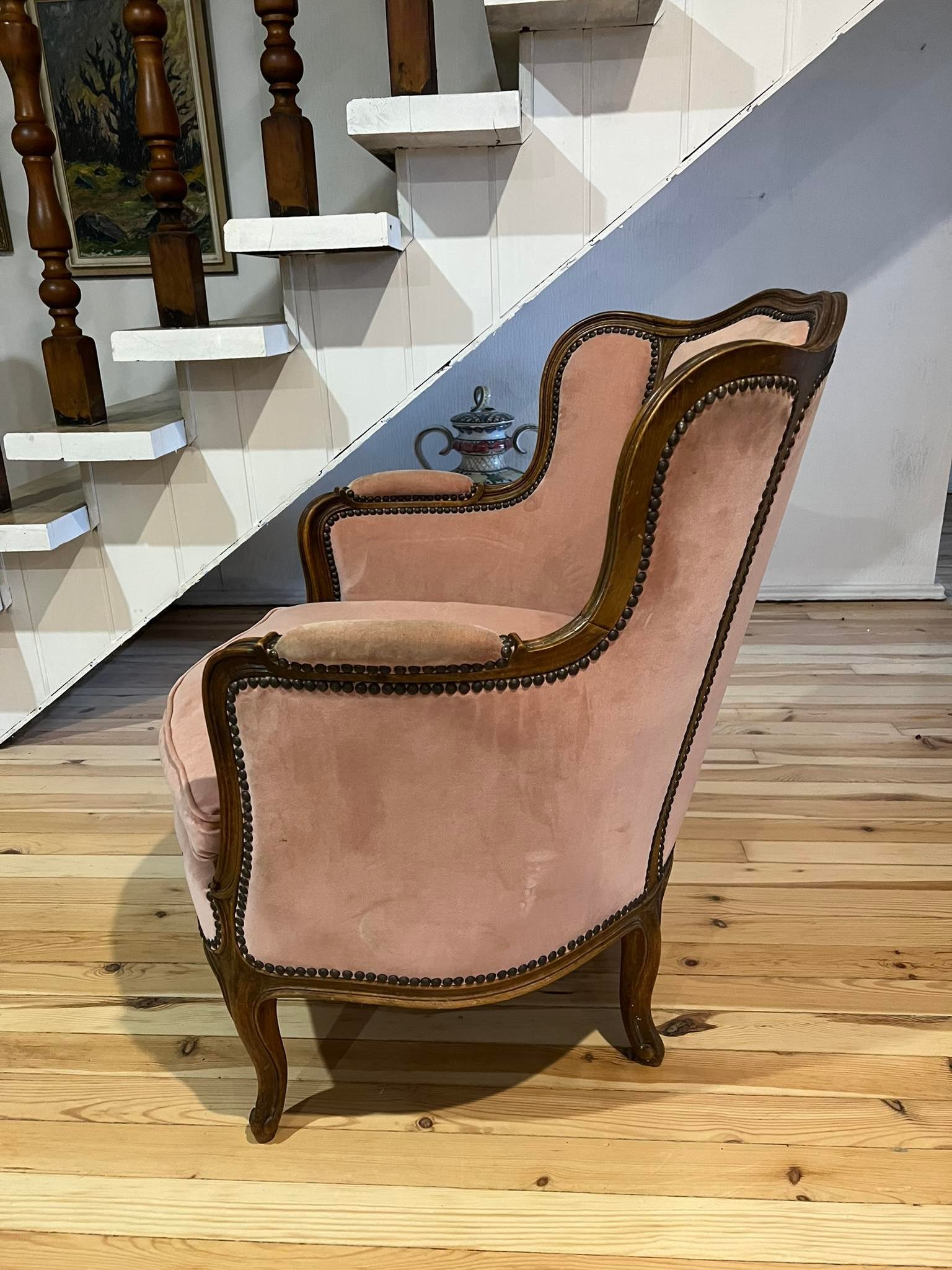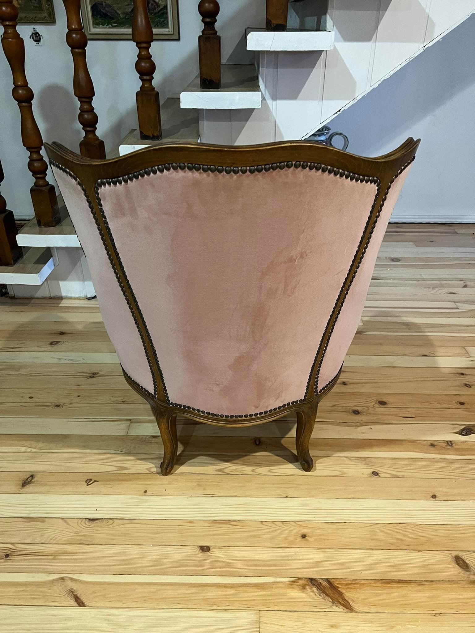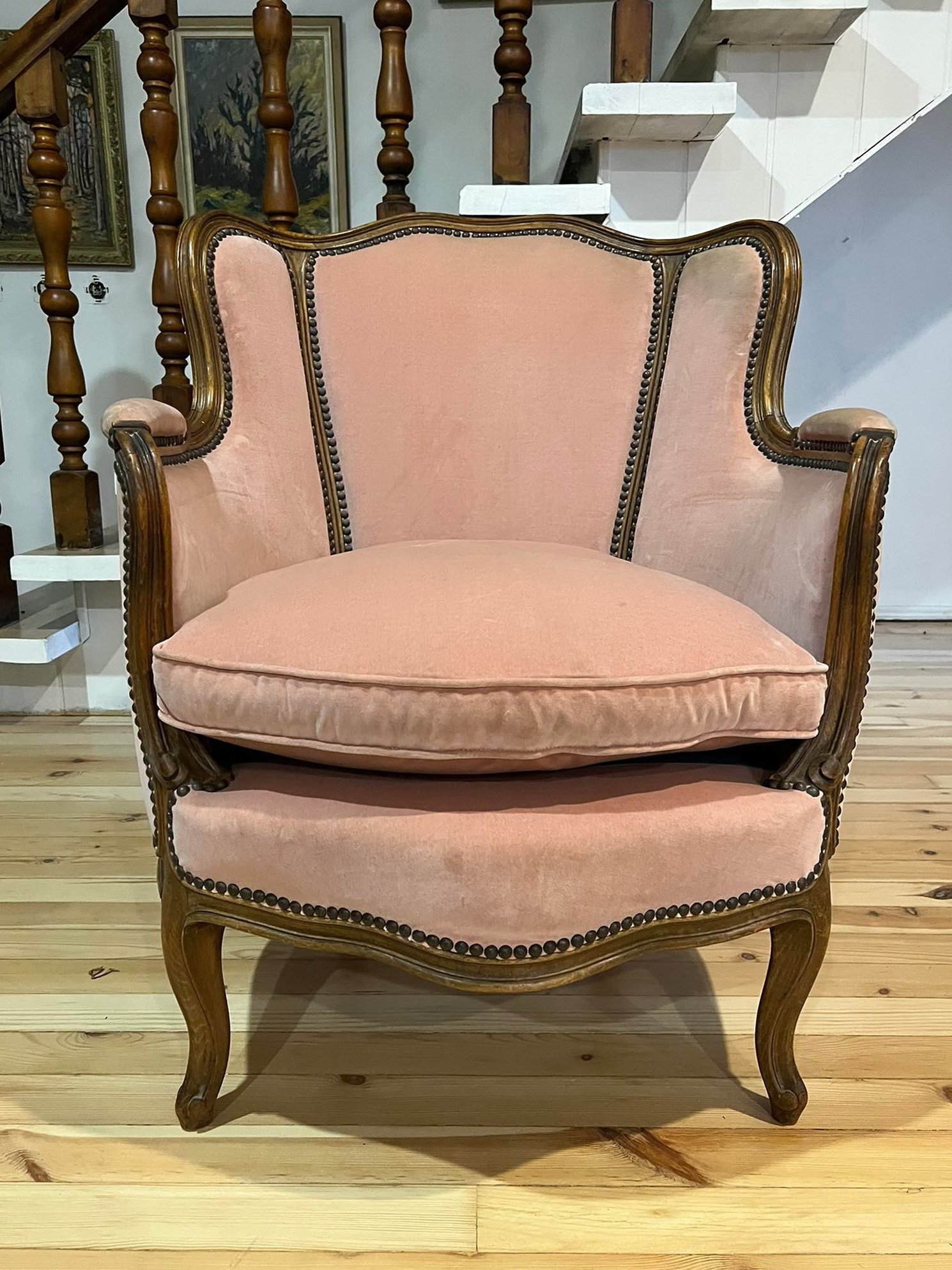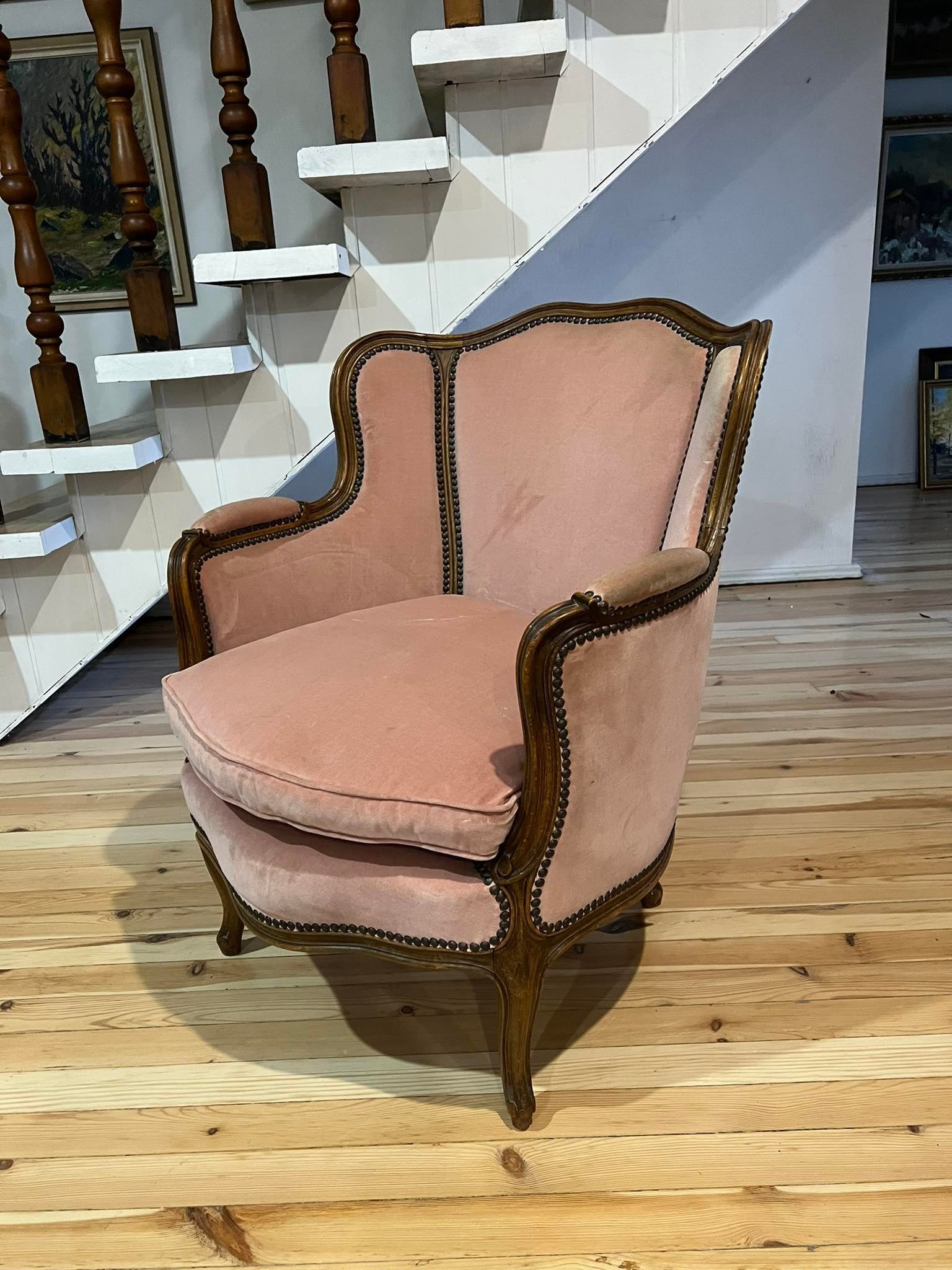Krėslas, fotelis kriauklės formos. Tvirtas ir patogus. Plotis tarp porankių 73 cm, atkaltės aukštis 88 cm, gylis 74 cm. Kaina 213