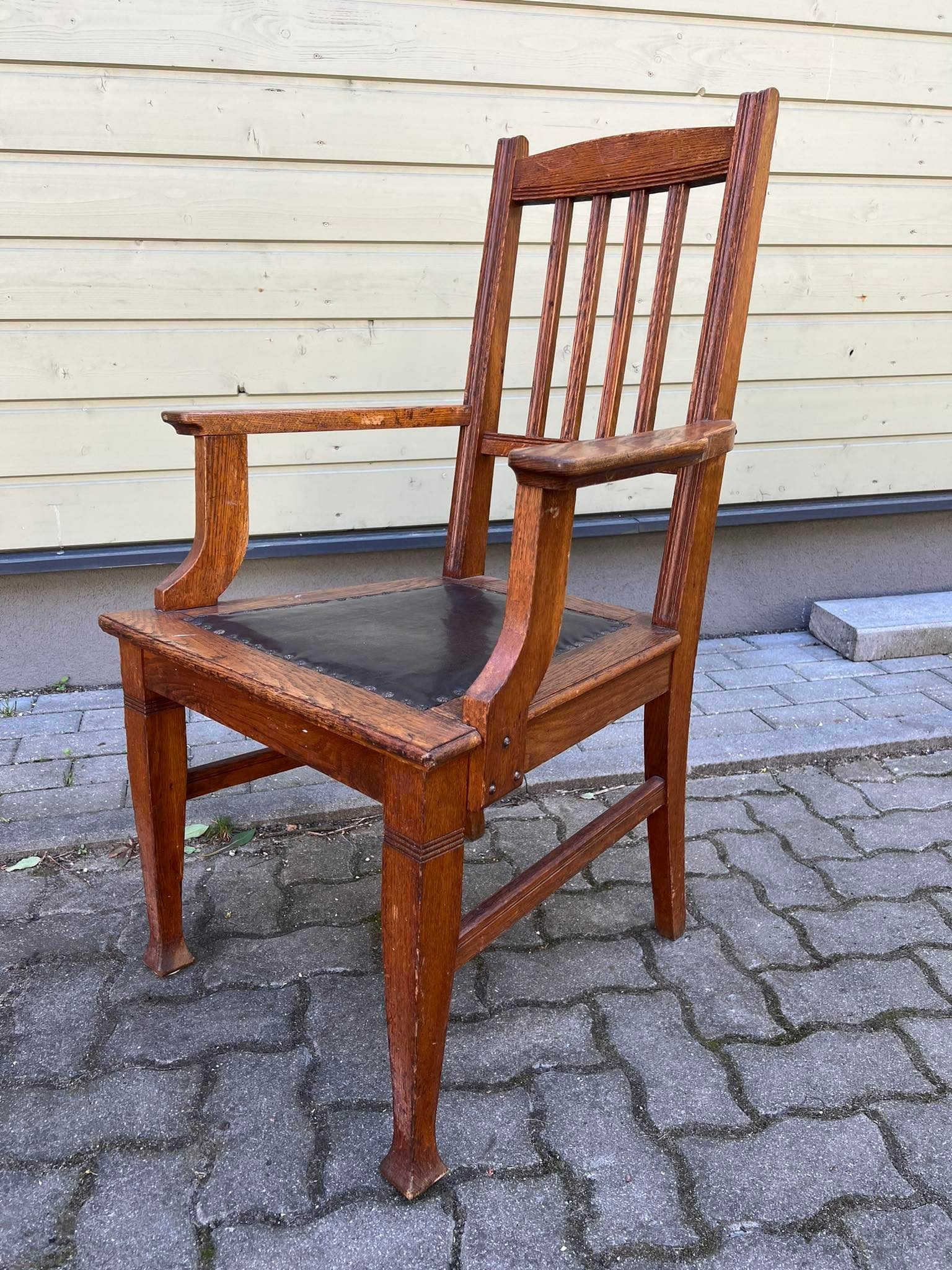 Krėslas, rašomojo stalo, darbo kambario kėdė su porankiais, odinis, antikvarinis Biedermeier stiliaus, ąžuolinis. Kaina 147