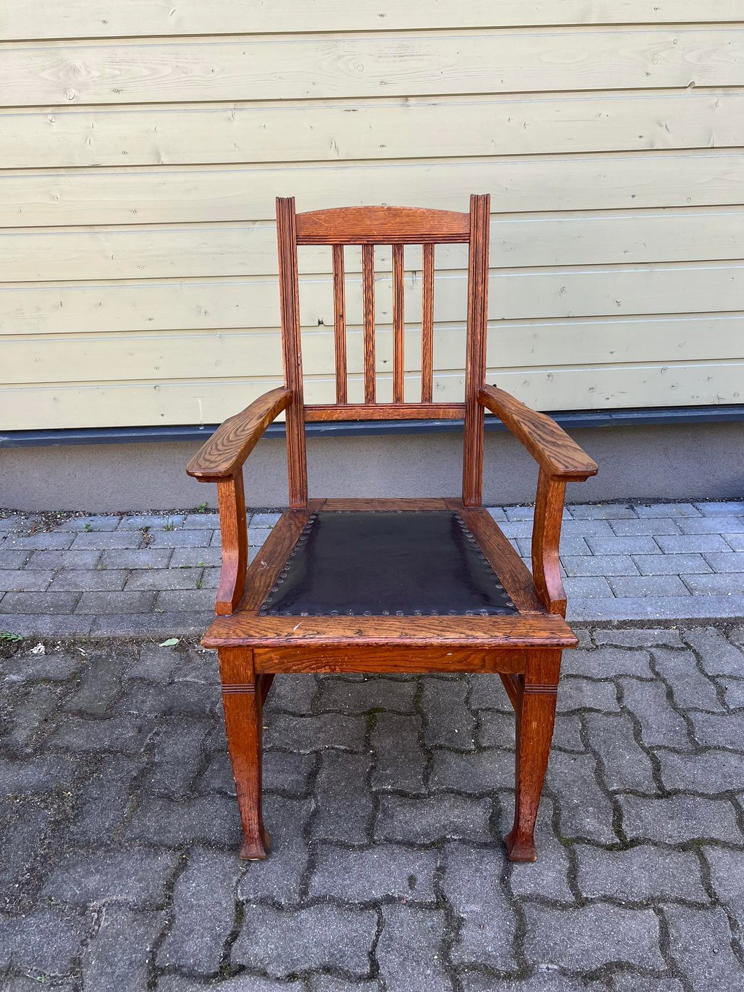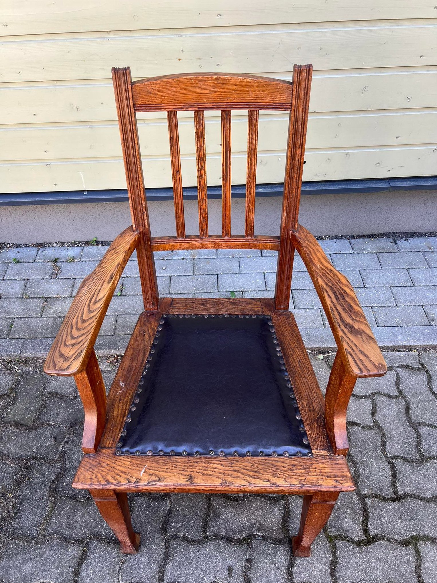 Krėslas su porankias antikvarinis Biedermeier stiliaus, ąžuolinis. Tvirtas ir patogus. Atkaltės aukštis 100, sėdimosios dalies aukštis 46 cm. Išorinis plotis tarp porankių 61, vidinis 47 cm. Kaina 147