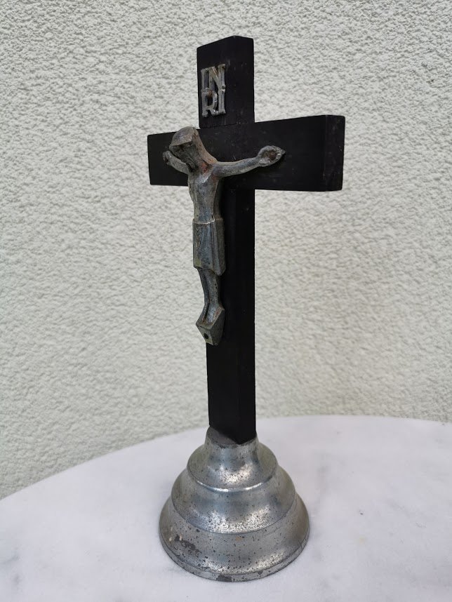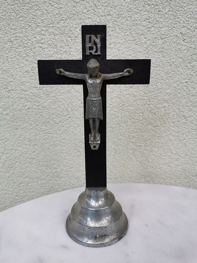Kryžius pastatomas, nukryžiuotasis antikvarinis, metalinis, pastatomas. Kaina 23