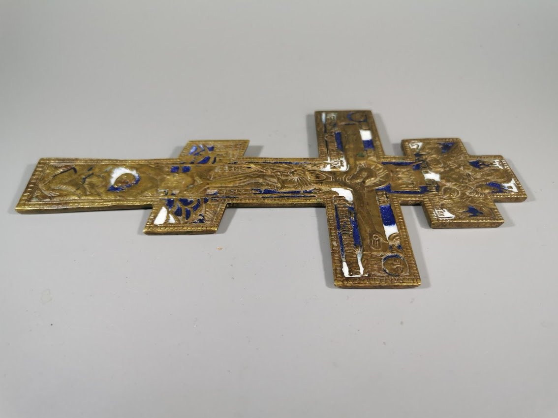 Kryžius stačiatikių, krikščionių ortodoksų, pravoslavų bronzinis, antikvarinis, puoštas dviejų spalvų emale. Dydis: 11 x 19 cm. Kaina 163