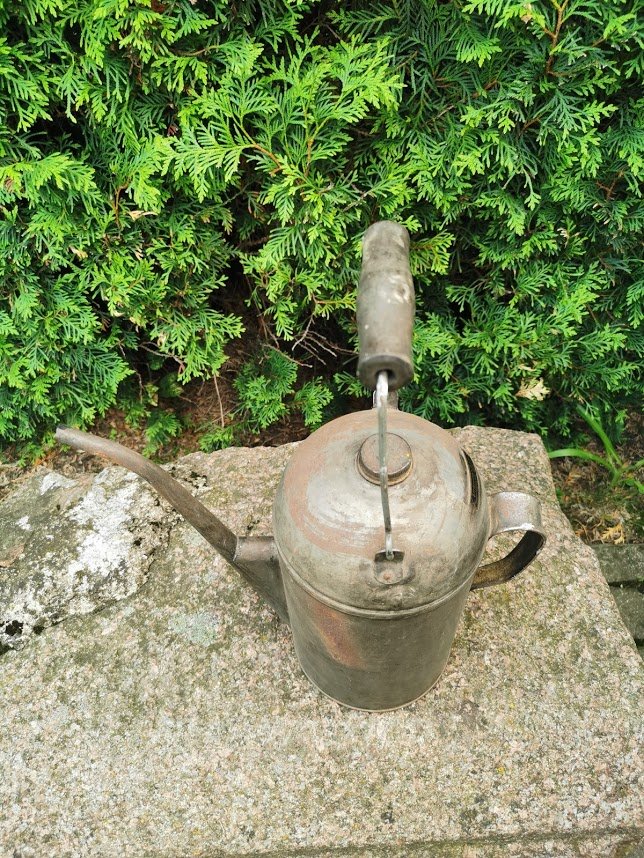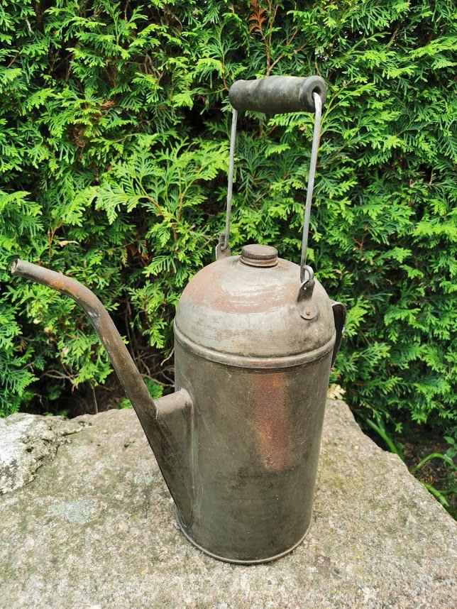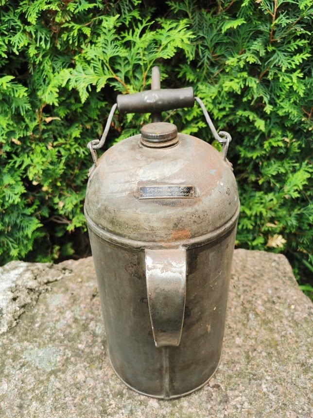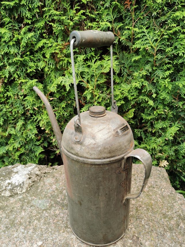 Kuro bakelis, kanistras antikvarinis su užrašu. 5 ltr. Aukštis be rankenos 30 cm. Skersmuo 15 cm. Kaina 58