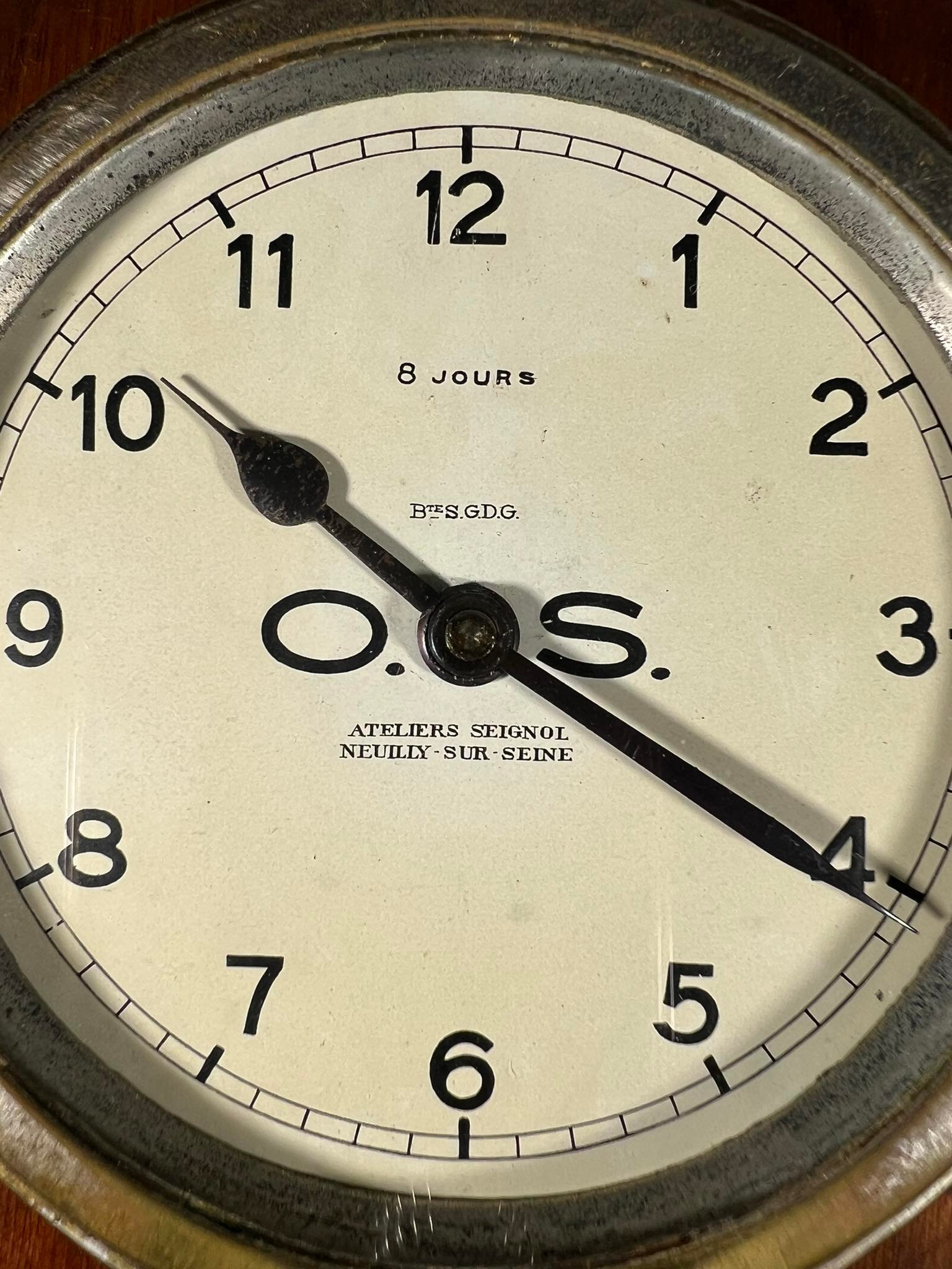 Laikrodis 8 dienų, prietaisų skydelio ATELIERS SEIGNOL PARIS, NEUILLY SUR SEINE. 1920-ųjų BUGATTI. Veikiantis. Kaina 228