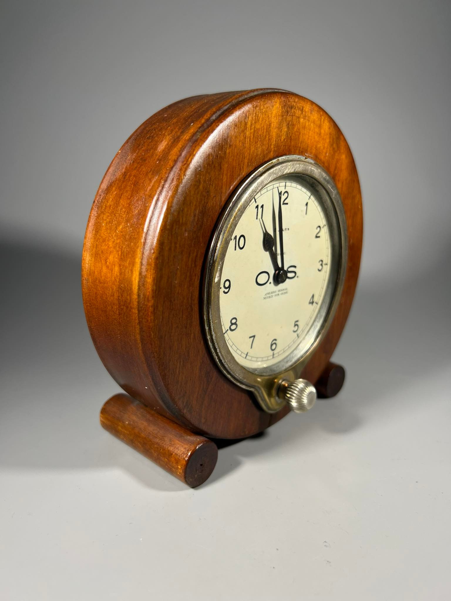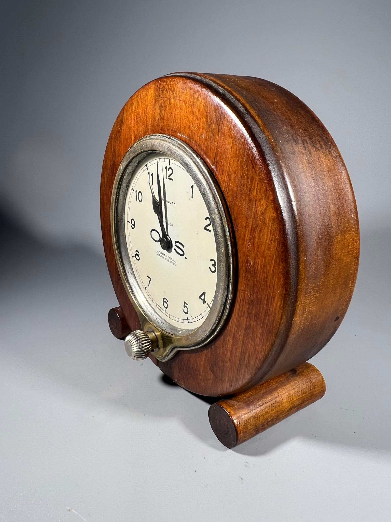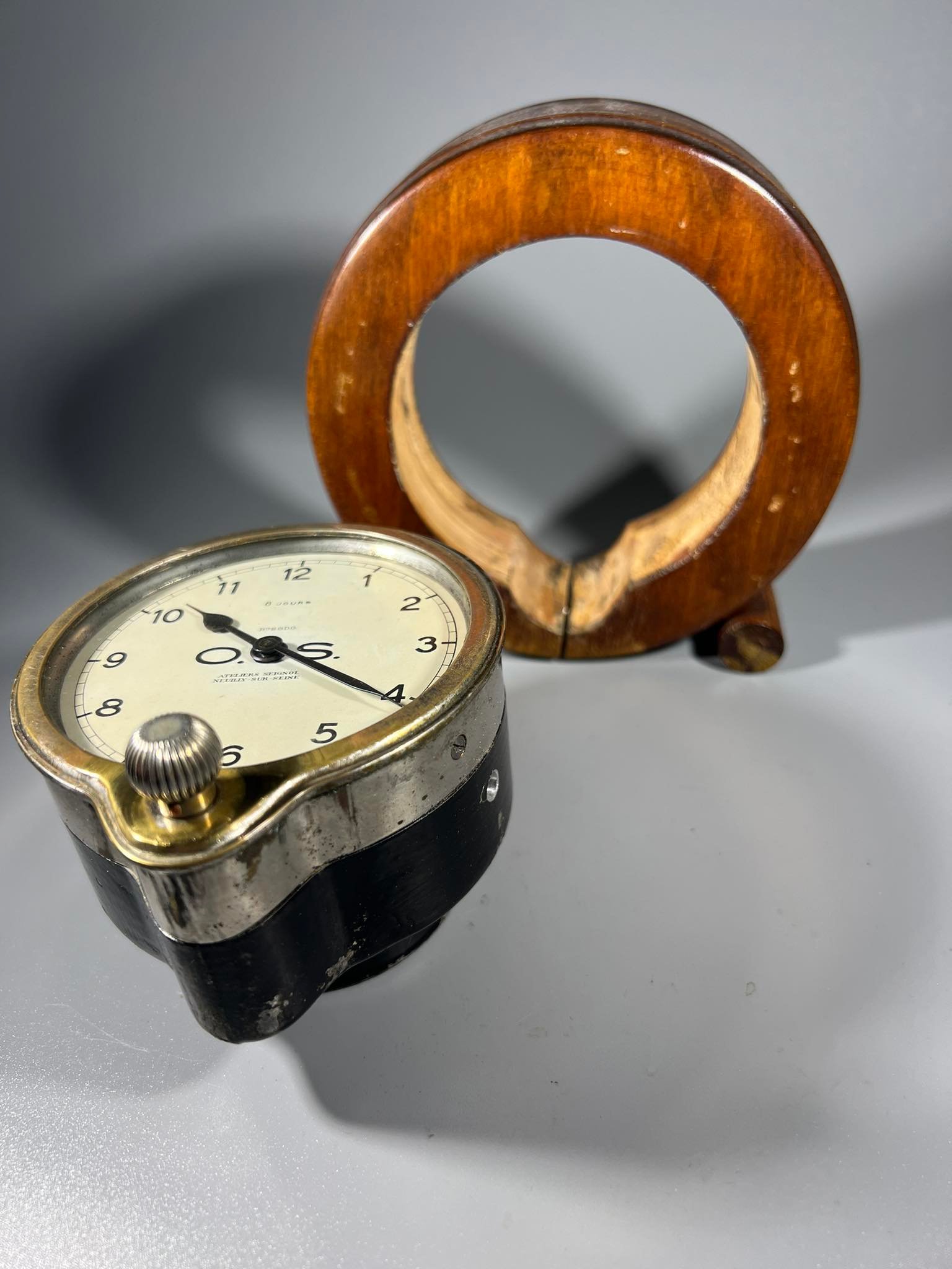 Laikrodis 8 dienų, prietaisų skydelio ATELIERS SEIGNOL PARIS, NEUILLY SUR SEINE. 1920-ųjų BUGATTI. Veikiantis. Išimamas iš medinio rėmo. Viso aukštis 14, akersmuo 13, laikrodžio skersmuo 9 cm. storis 6 cm. Kaina 228