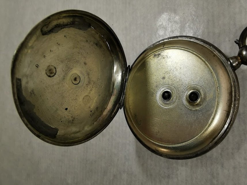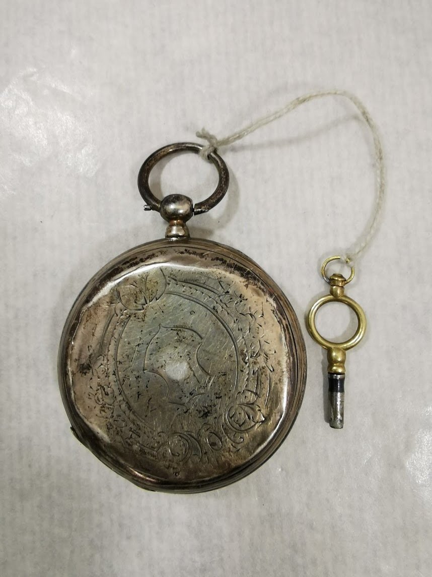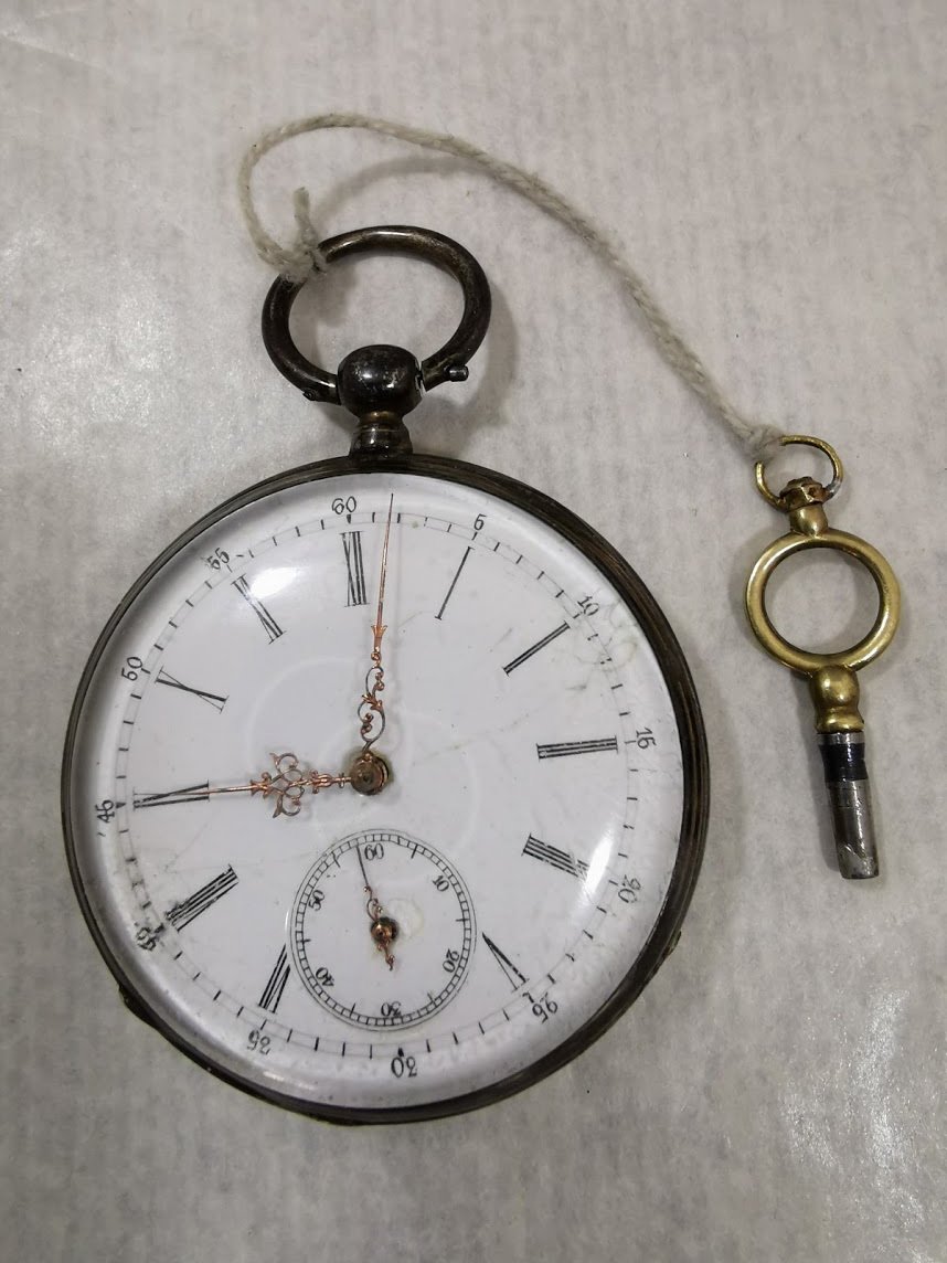 Laikrodis antikvarinis, sidabrinis, kišeninis su rakteliu. Veikiantis, patikrintas laikrodininko. Skersmuo 5 cm. Kaina 118
