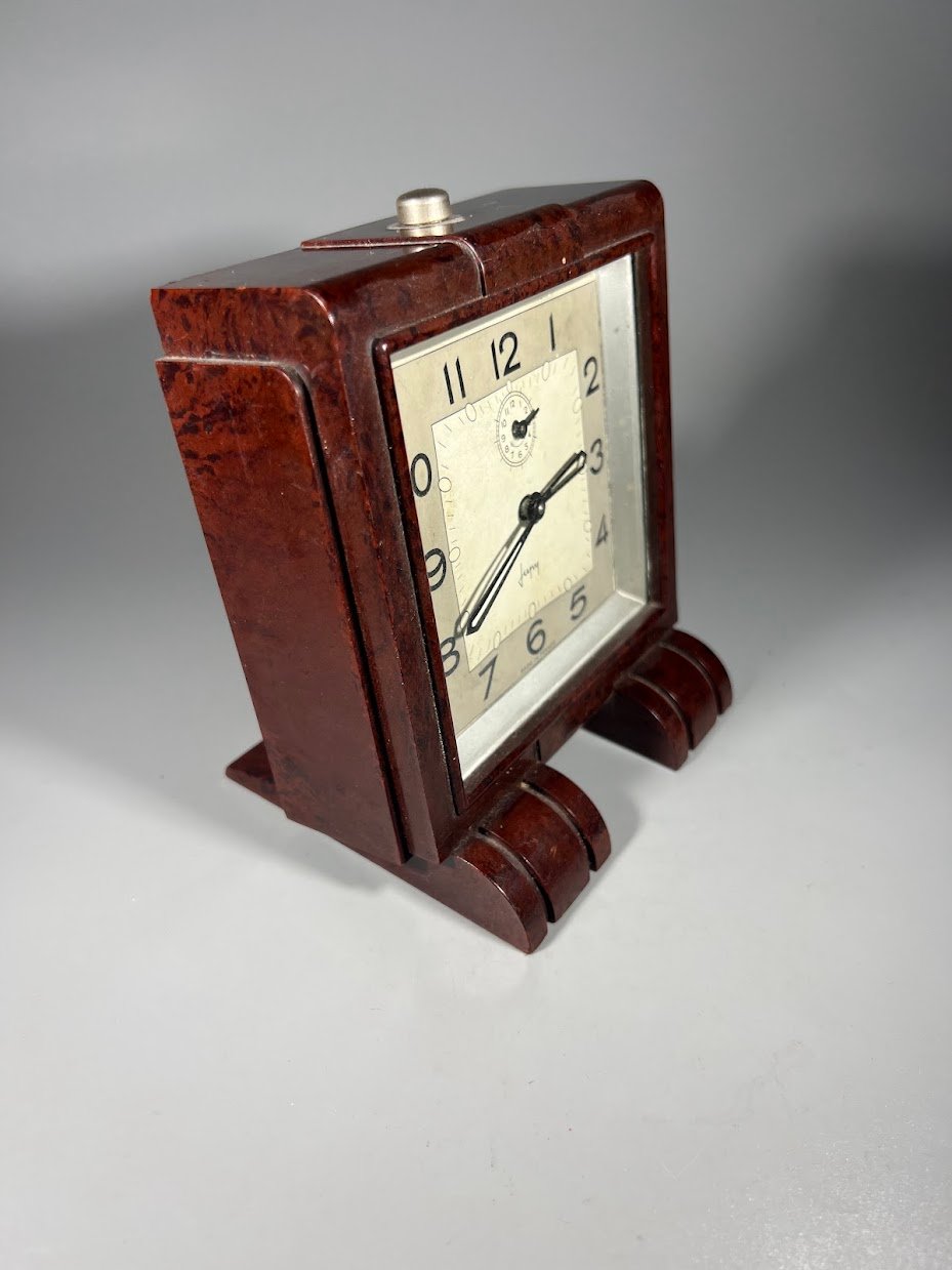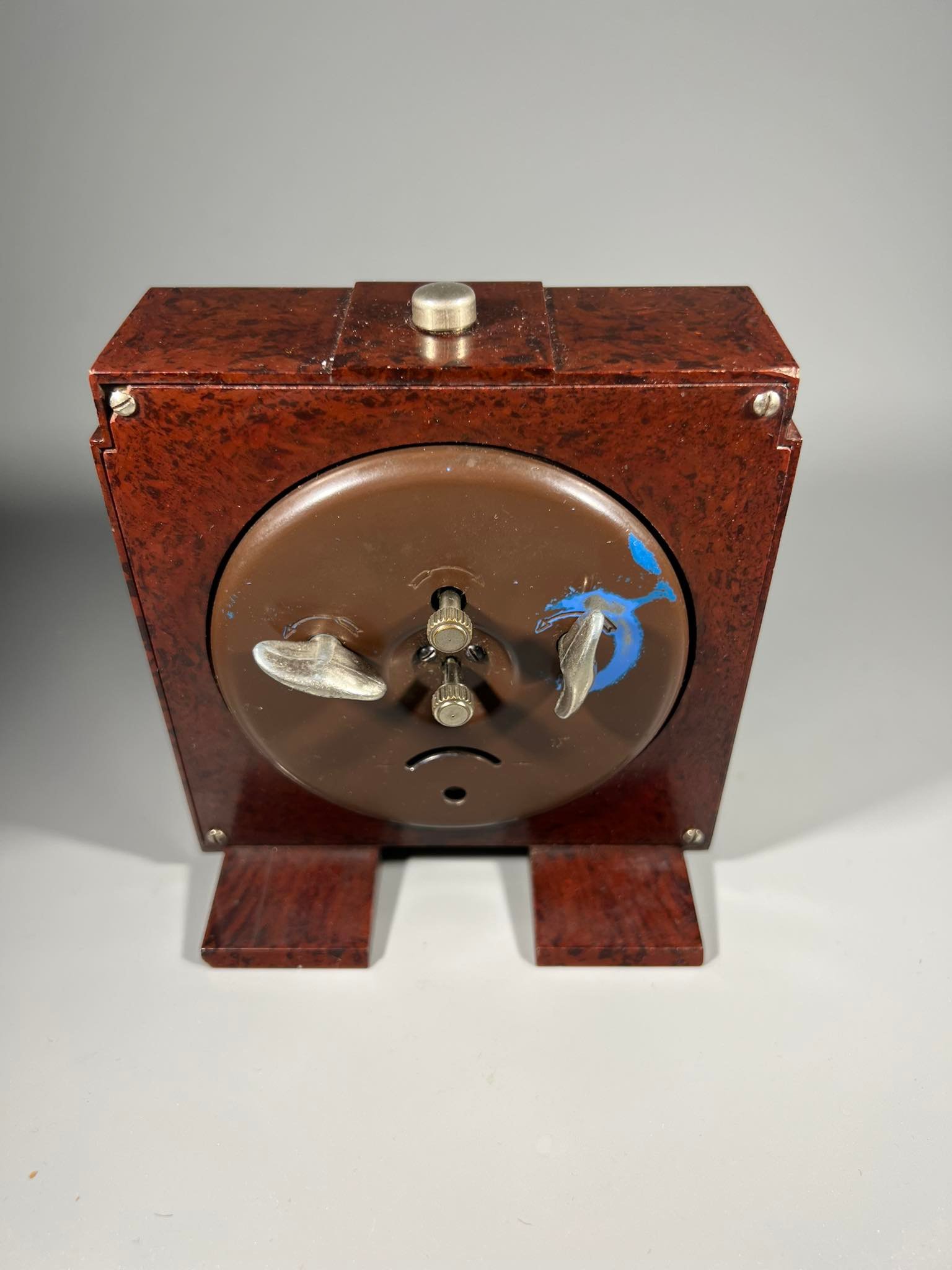 Laikrodis antikvarinis, stalinis žadintuvas, Art Deco stiliaus, tarpukario laikų, prancūziškas, bakelitinis. Veikiantis, patikrintas laikrodininko. 1930 m. Kaina 168
