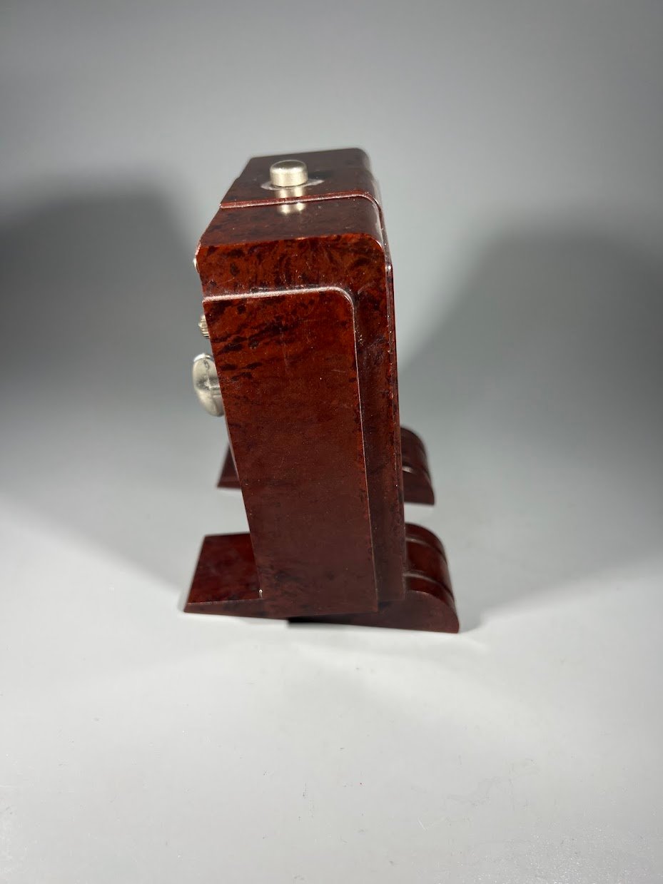 Antikvarinis Art Deco žadintuvas „Jupy“ (Prancūzija, apie 1930 m.) Autentiškas, tarpukario laikotarpio prancūziškas stalinis žadintuvas. Tai puikus Art Deco stiliaus pavyzdys, pasižymintis griežtomis geometrinėmis formomis ir būdingu to meto dizainu. Pagrindinės savybės: Kilmė: Prancūzija (gamintojas „Jupy“). Laikotarpis: apie 1930 m. (tarpukaris). Medžiaga: Korpusas pagamintas iš bakelito – ankstyvojo plastiko, vertinamo kolekcininkų dėl savo spalvos ir tekstūros (marmurinio rudo rašto). Būklė: Puikiai išlaikytas, veikiantis. Mechanizmą patikrino ir sureguliavo profesionalus laikrodininkas. Dizainas: Klasikinis Art Deco stilius su pakopiniu pagrindu („skulptūriškomis kojelėmis“), būdingas prancūziškai mokyklai. Kodėl verta rinktis šį laikrodį? Tai ne tik funkcionalus prietaisas, bet ir išskirtinė interjero detalė arba vertinga dovana antikvaro mėgėjui. Bakelitiniai daiktai laikui bėgant tampa vis retesni, todėl tai yra ir puiki investicija.