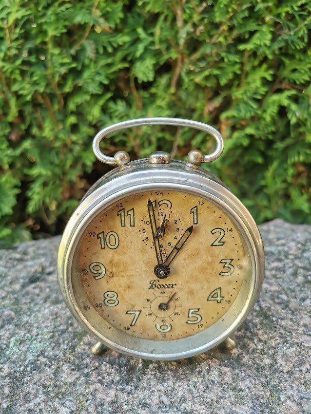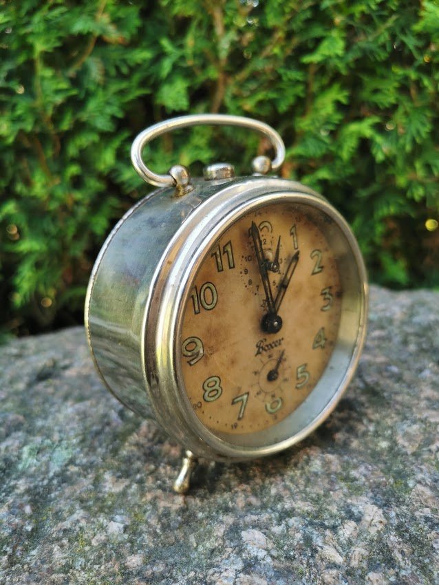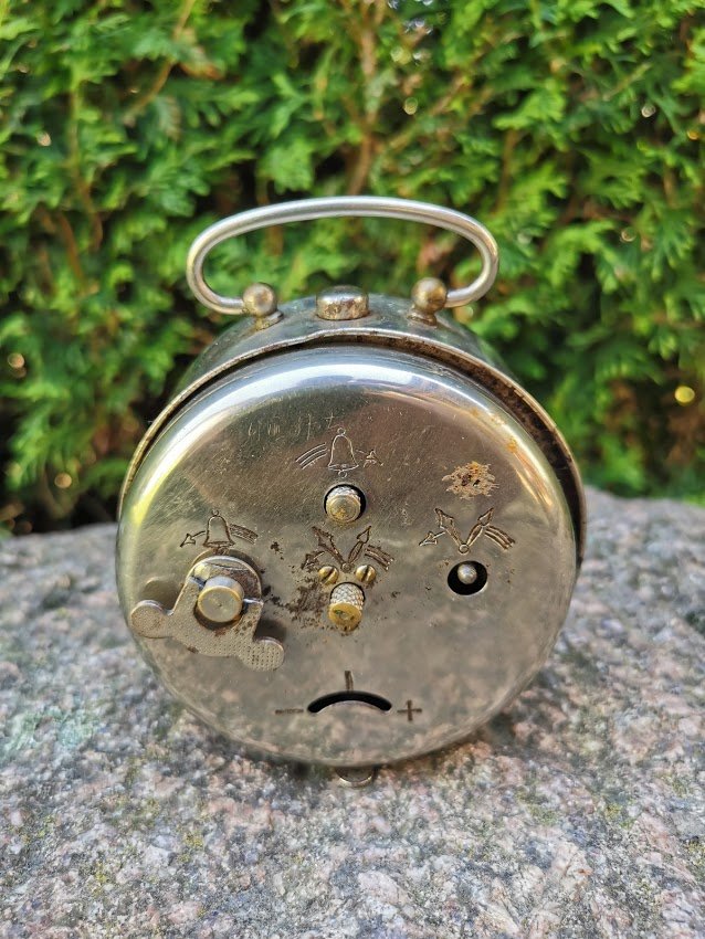 Laikrodis antikvarinis, tarpukario laikų. Aukštis be rankenėlės 10 cm. Neveikiantis. Kaina 28