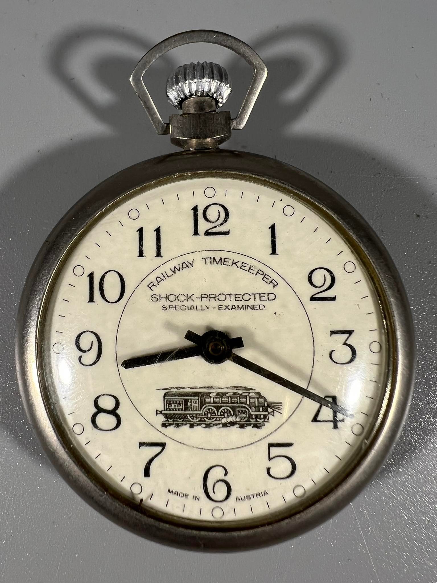Laikrodis kišeninis antikvarinis Railway Timekeeper. Shock-protected. Specially-examined. Made in Austria. Neveikiantis. Kaina 21
