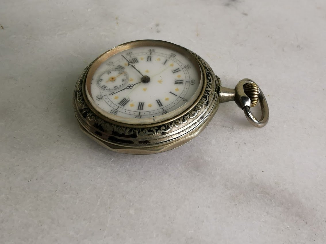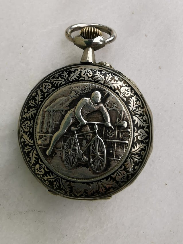 Laikrodis kišeninis, antikvarinis su reljefiniu dviratininko atvaizdu. Veikiantis. Kaina 157