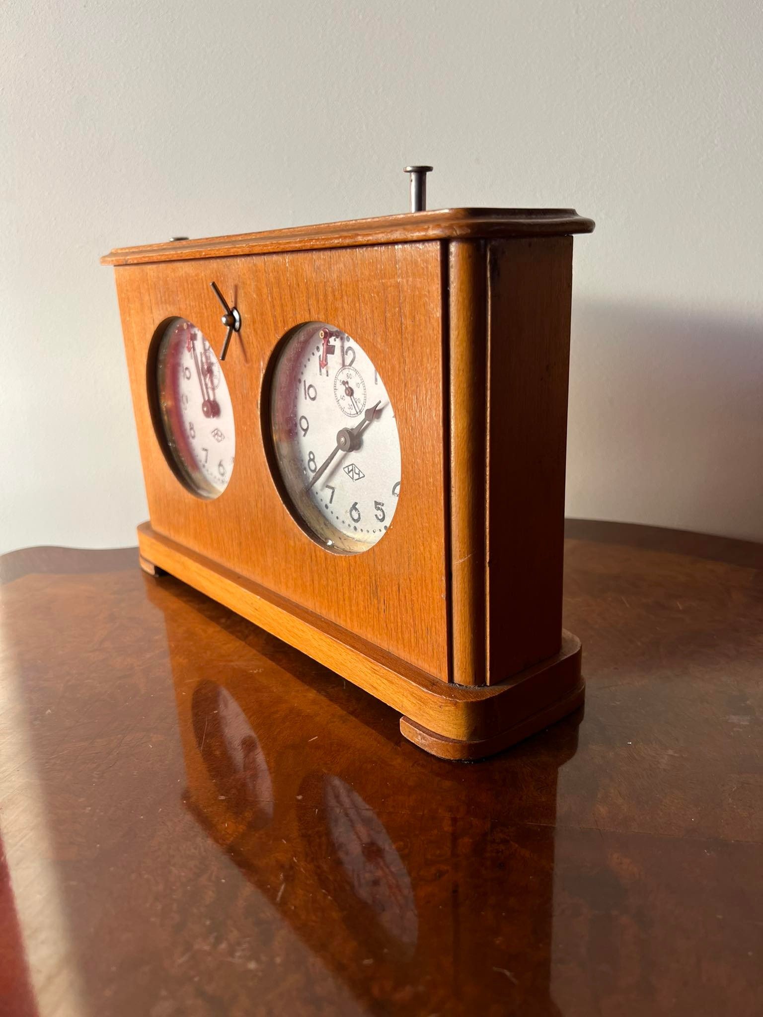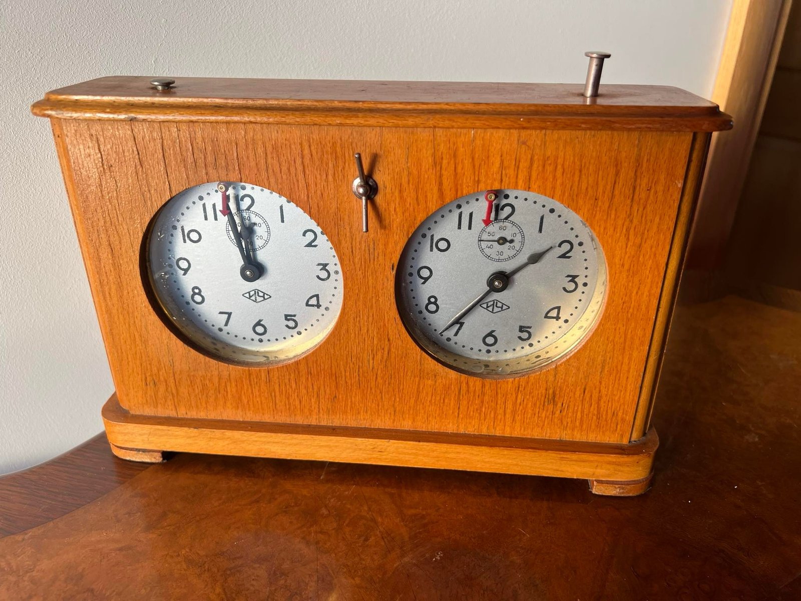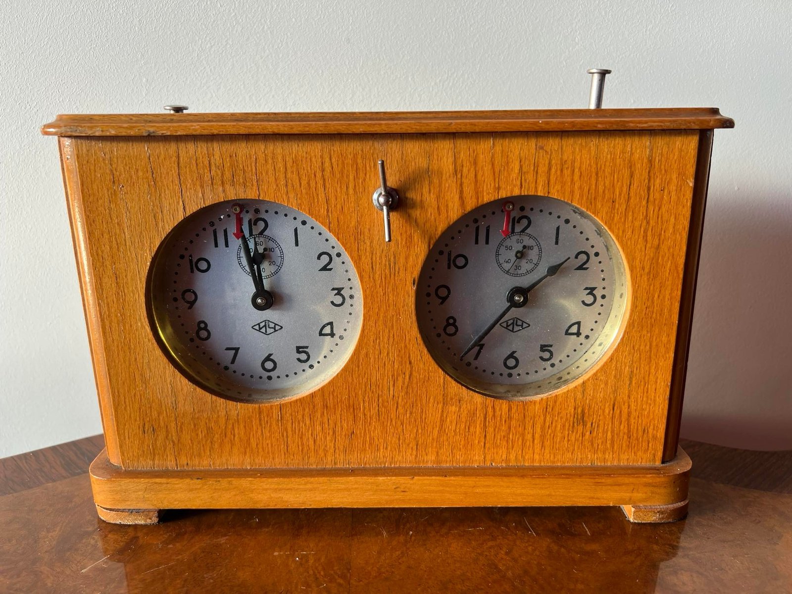 Laikrodis šachmatų tarybinis ЧАС 2 З-Д МОСКВА. 1950 m. Veikiantis, patikrintas laikrodininko. Medinis korpusas. Aukštis 19, ilgis 82, plotis 7 cm. Kaina 122