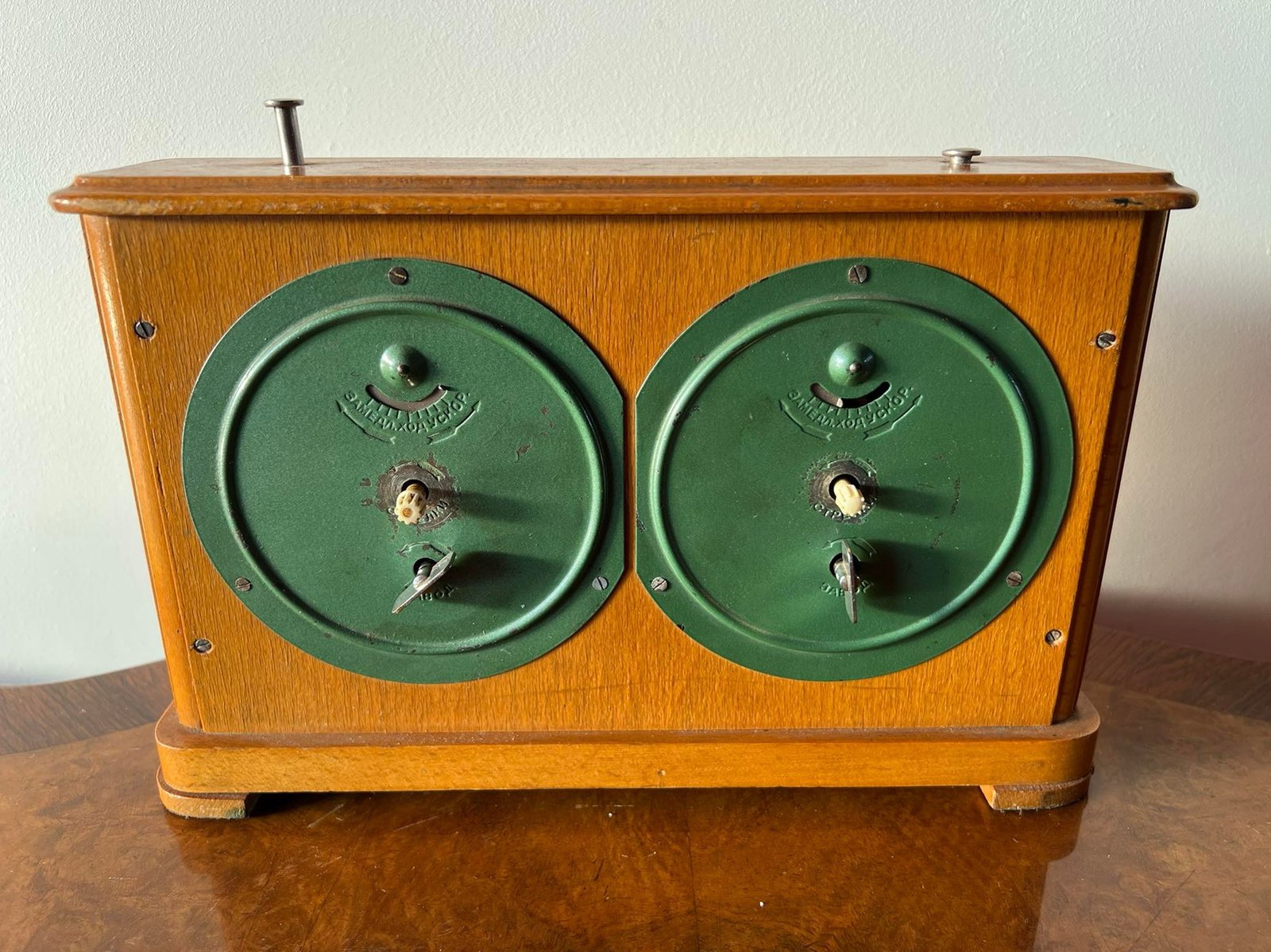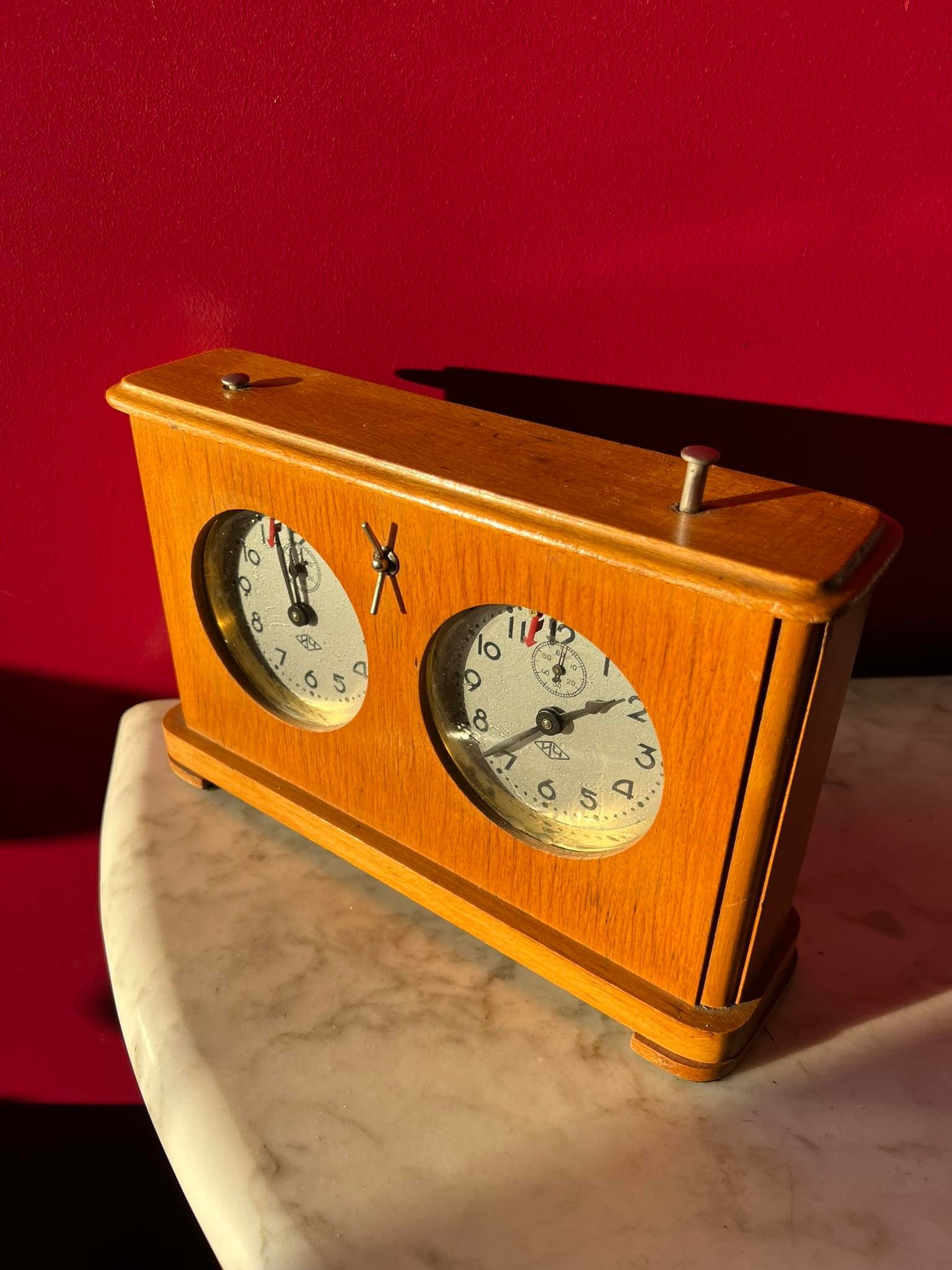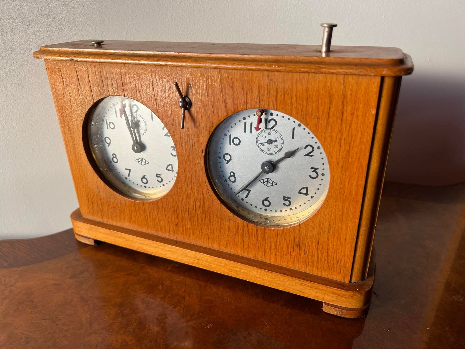 Laikrodis šachmatų tarybinis ЧАС 2 З-Д МОСКВА. 1950 m. Veikiantis, patikrintas laikrodininko. Medinis korpusas. Aukštis 19, ilgis 82, plotis 7 cm. Kaina 122