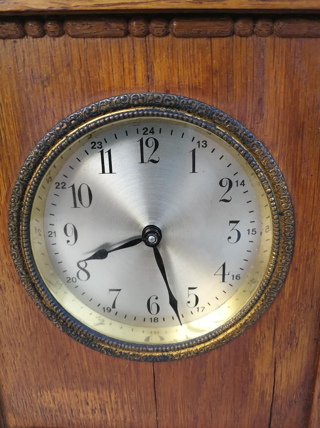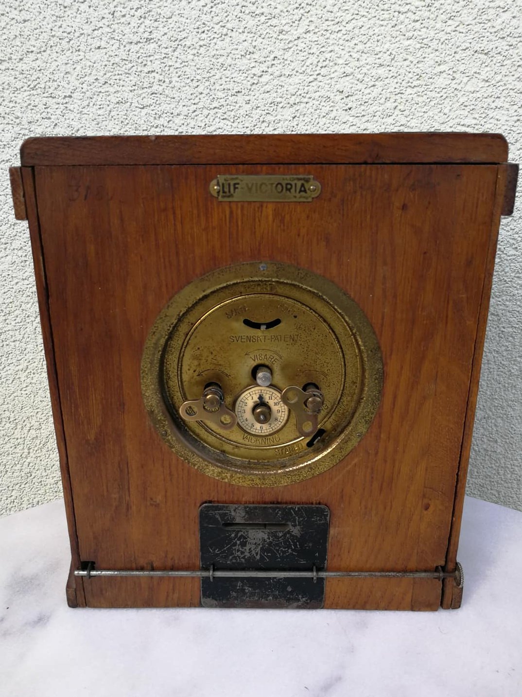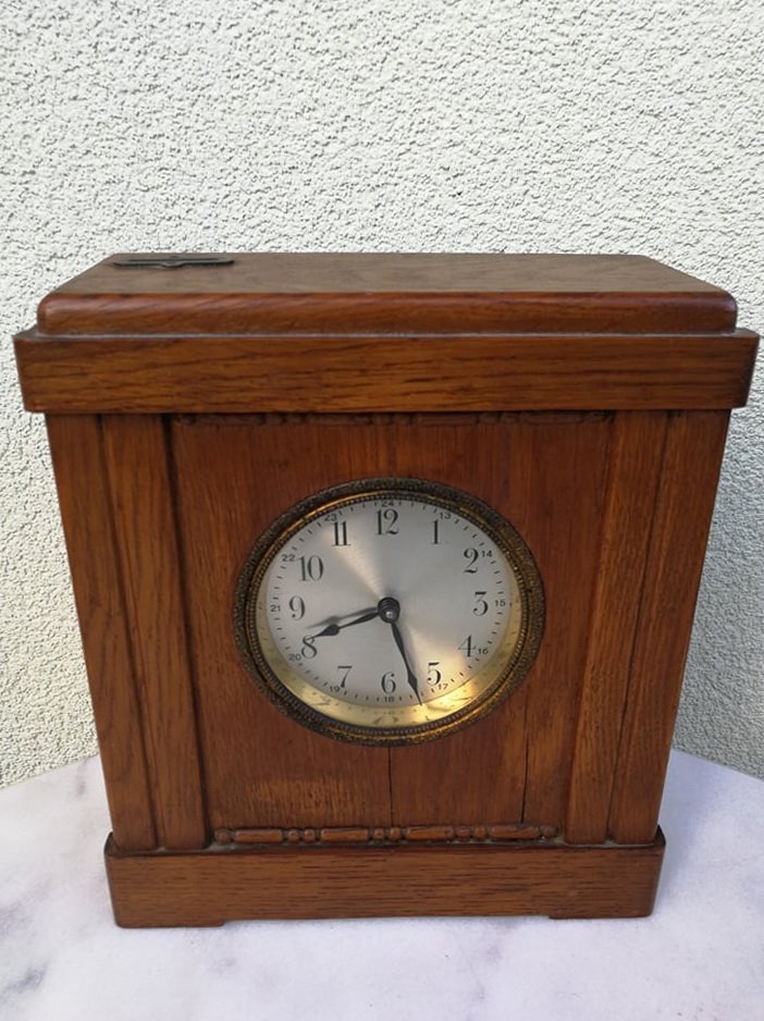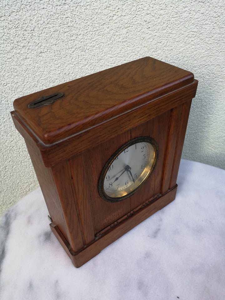 Laikrodis, taupyklė, žadintuvas, antikvarinis. Veikiantis Aukštis 27, ilgis 21, plotis 8 cm. Kaina 93