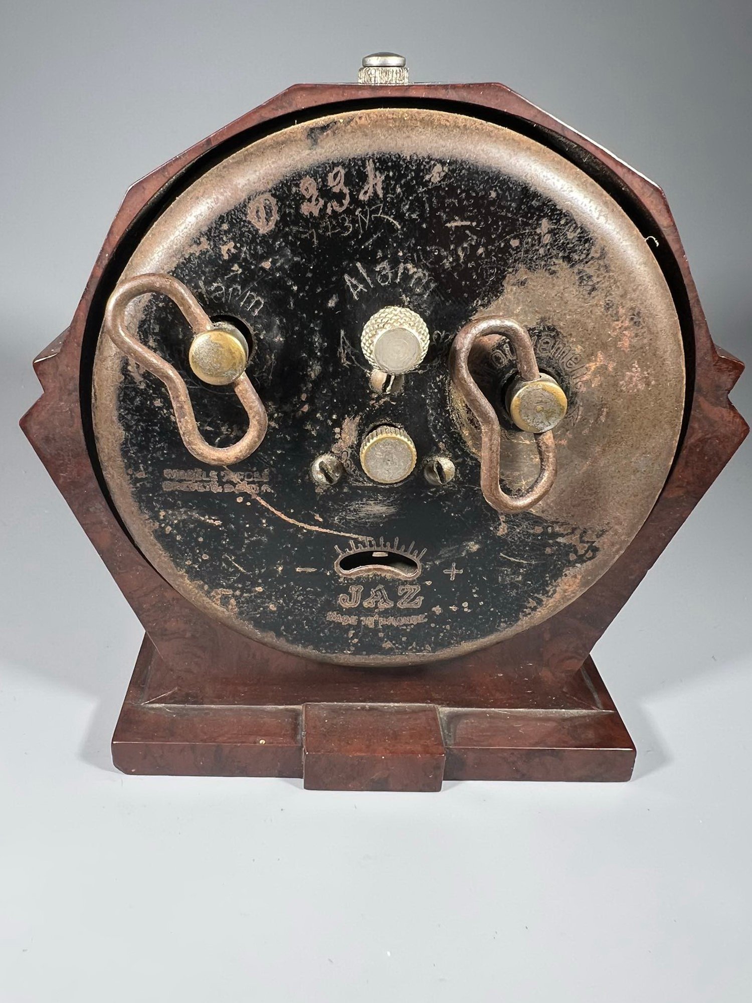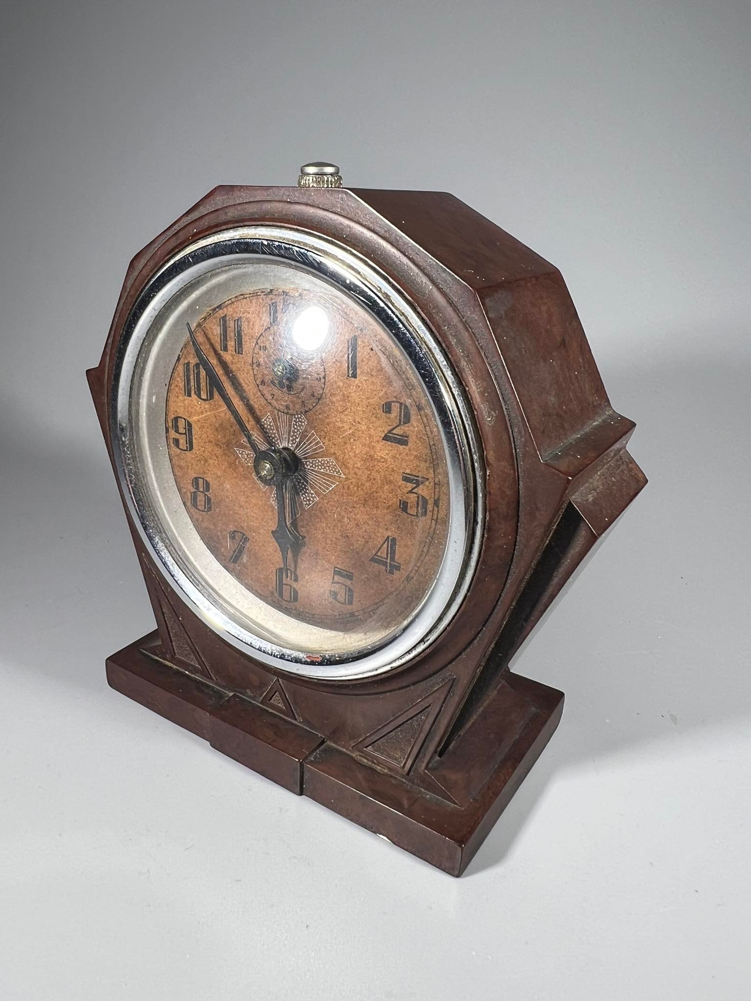 Laikrodis, žadintuvas ART DECO stiliaus, antikvarinis, tarpukario laikų, balekitiniu korpusu, prancūziškas. Veikiantis. Kaina 93