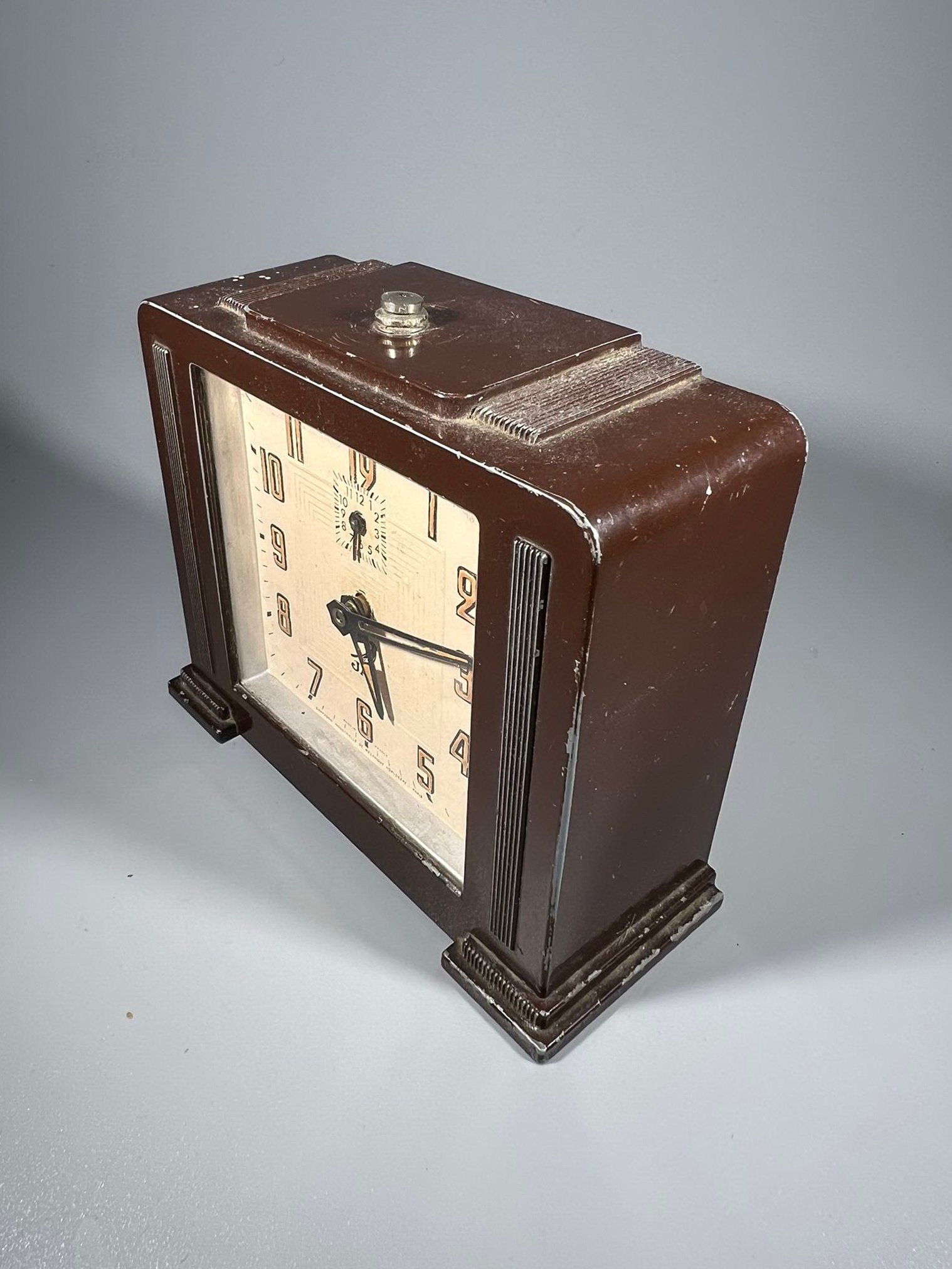 Laikrodis žadintuvas Art Deco stiliaus, metaliniu korpusu, antikvarinis, tarpukario laikų JAZZ. Made in France. Veikiantis, patikrintas laikrodininko. Aukštis 11, ilgs 13, plotis 5 cm, Svoris 800 g. Kaina 158