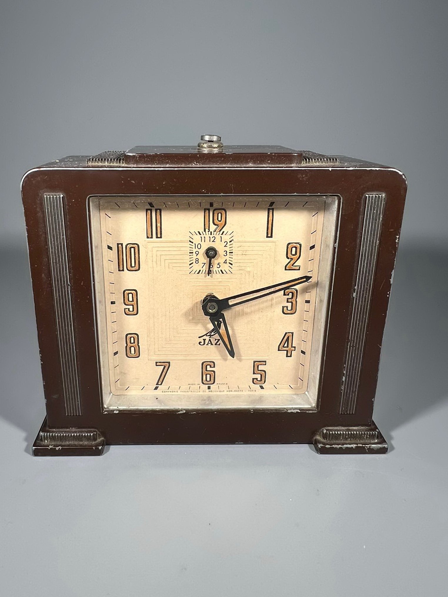 Laikrodis žadintuvas Art Deco stiliaus, metaliniu korpusu, antikvarinis, tarpukario laikų JAZZ. Made in France. Veikiantis, patikrintas laikrodininko. Kaina 158
