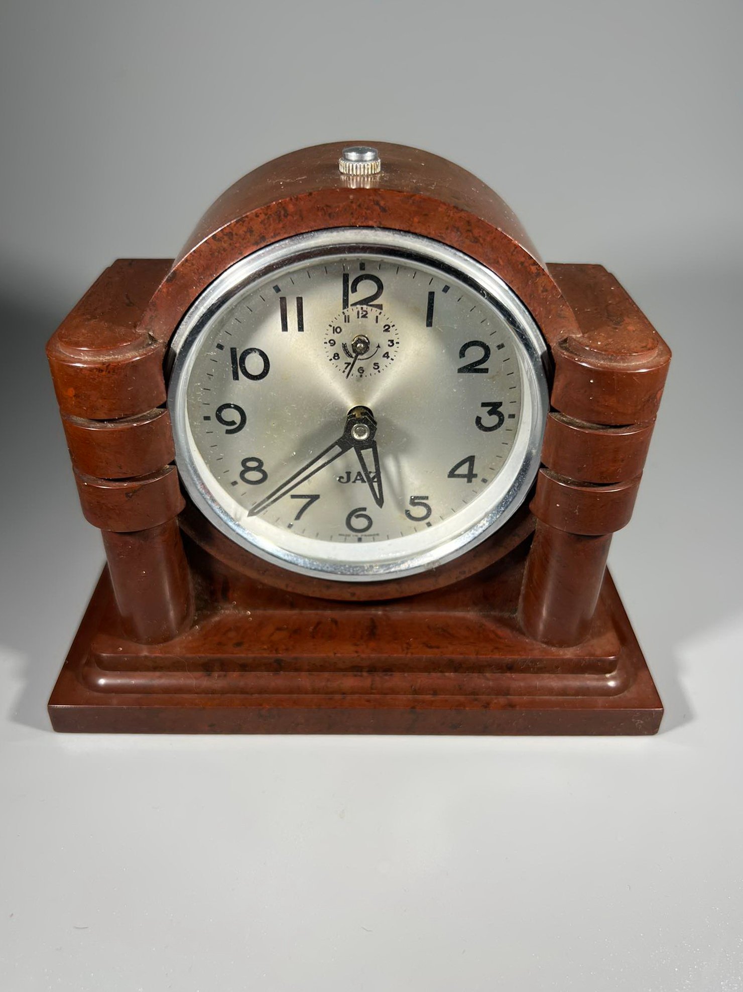 Laikrodis, žadintuvas JAZZ, antikvarinis, Art Deco stiliaus, tarpukario laikų, prancūziškas. Veikiantis. Kaina 178