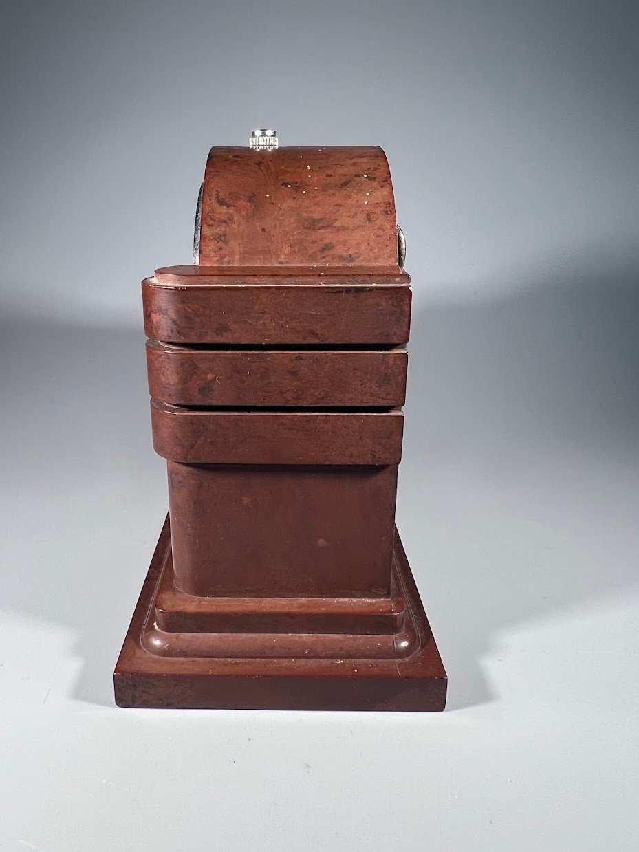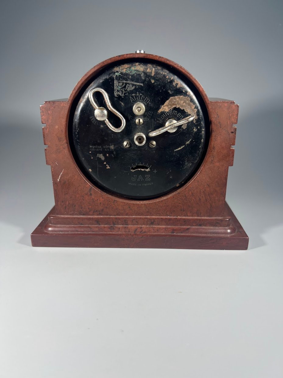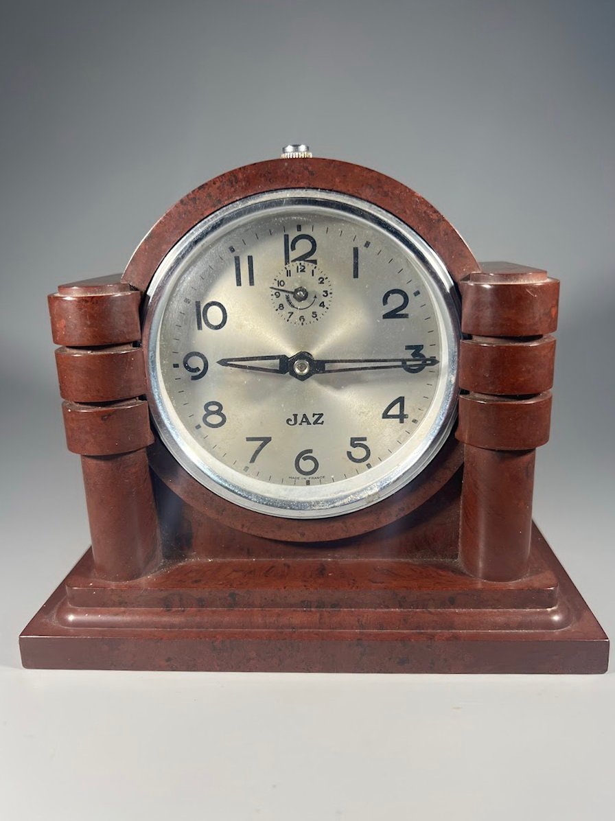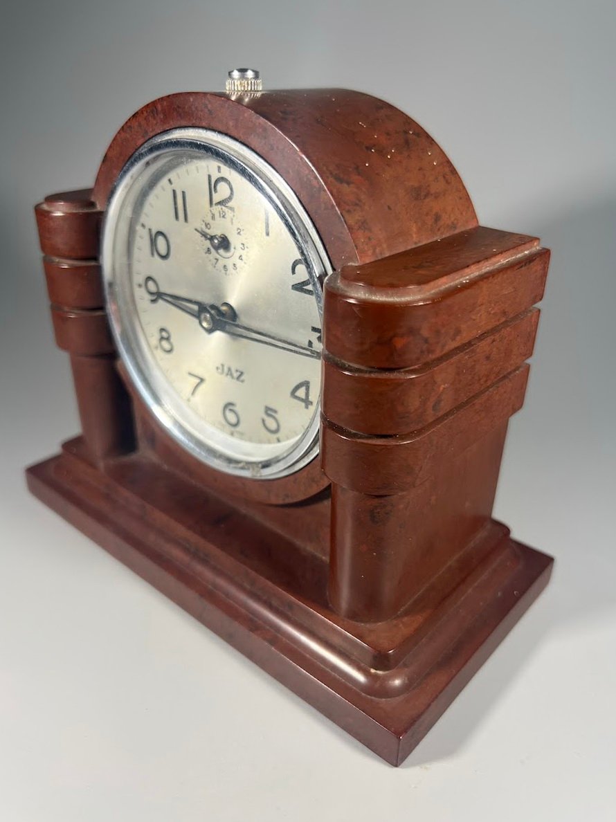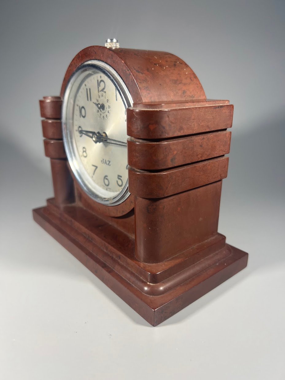 Korpusas pagamintas iš bakelito – ankstyvosios plastiko rūšies, kuri dažniausiai būdavo rudos arba juodos spalvos ir vertinama dėl savo blizgesio bei ilgaamžiškumo. Pagamintas Prancūzijoje. „Jaz“ yra garsi prancūzų laikrodžių markė, žinoma dėl savo stilingų stalinių laikrodžių. Įmonė buvo įkurta 1919 m. Paryžiuje. Jos tikslas buvo konkuruoti su tuo metu rinkoje dominavusiais vokiškais laikrodžiais.