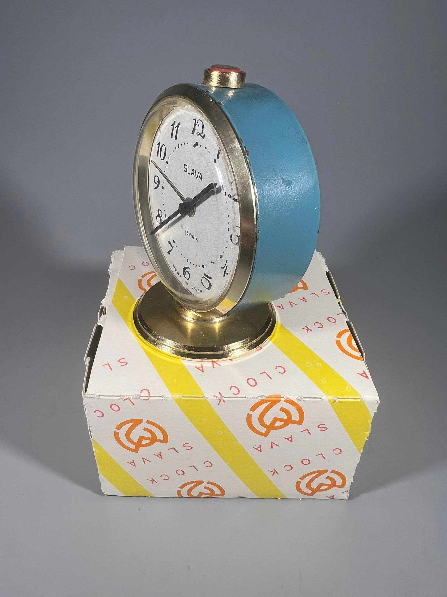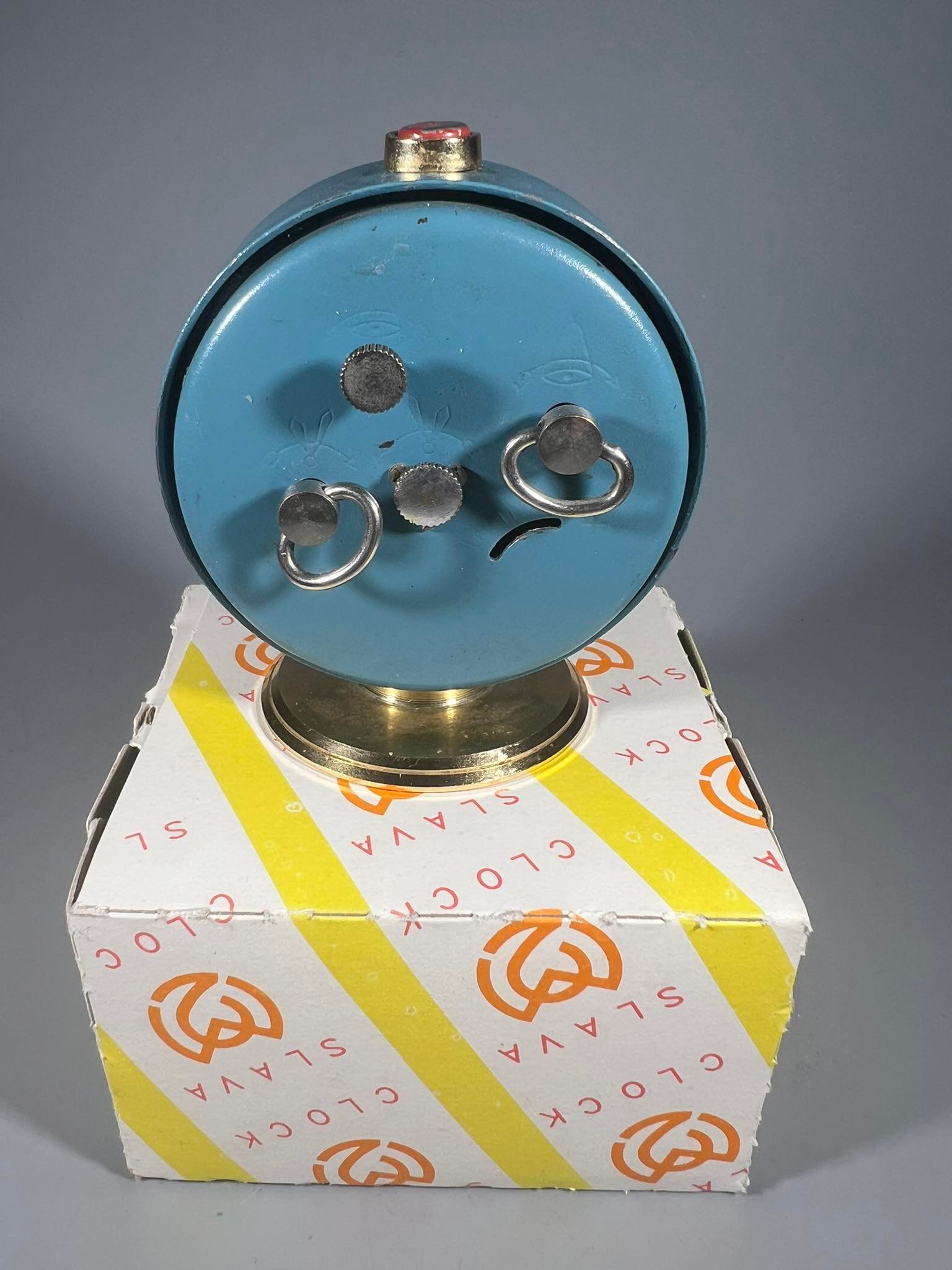 Laikrodis žadintuvas SLAVA su dėžute, pastatomas sovietinis, tarybinių laikų skirtas eksportui. Veikiantis. Aukštis 8 cm. Kaina 28
