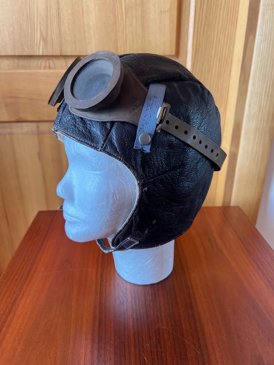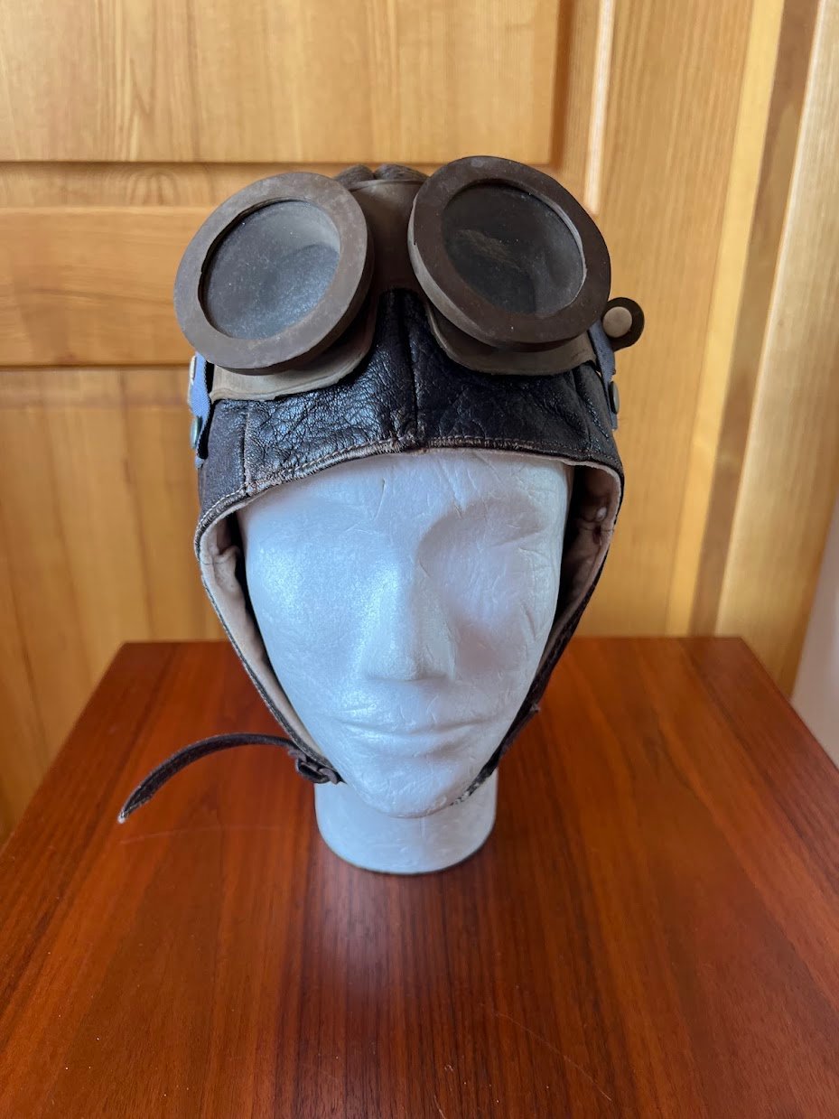 Lakūno, piloto, motociklisto, motociklininko kepurė odinė, originali, antikvarinė kepurė su lakūno akiniais ir stovu. Kaina 128 už viską