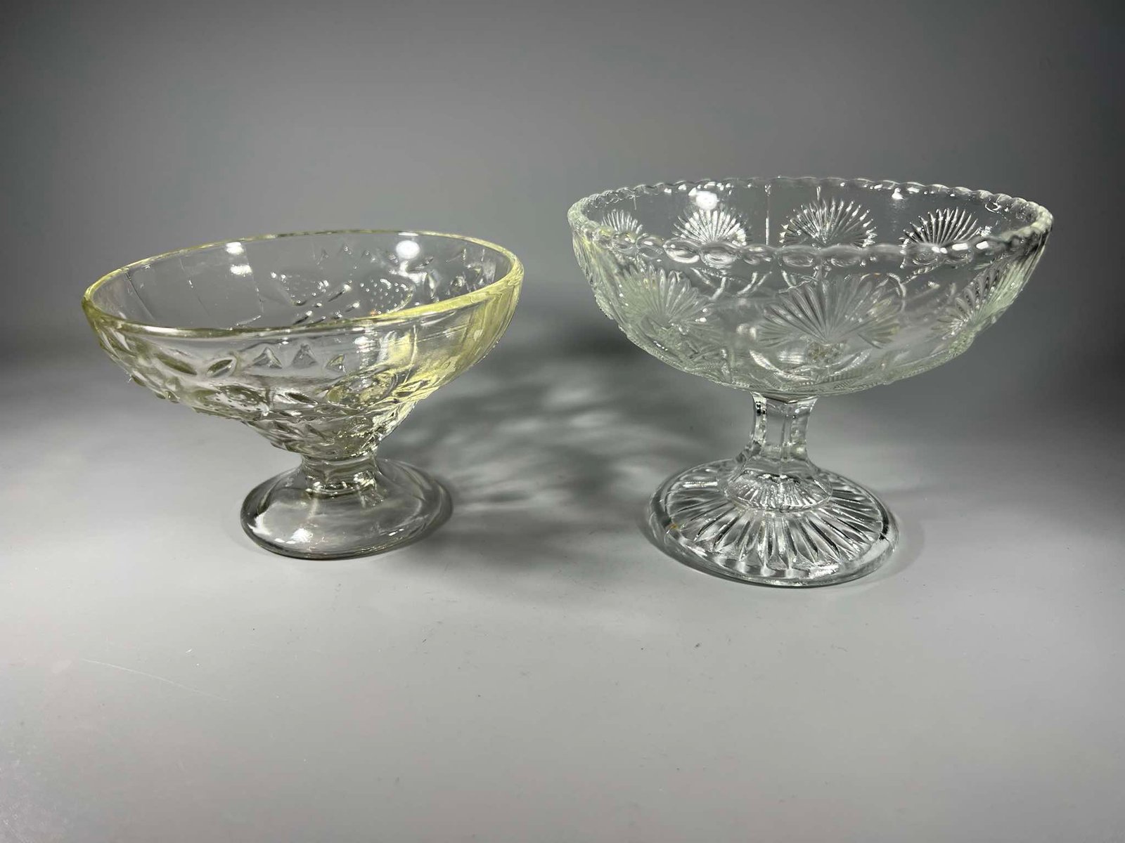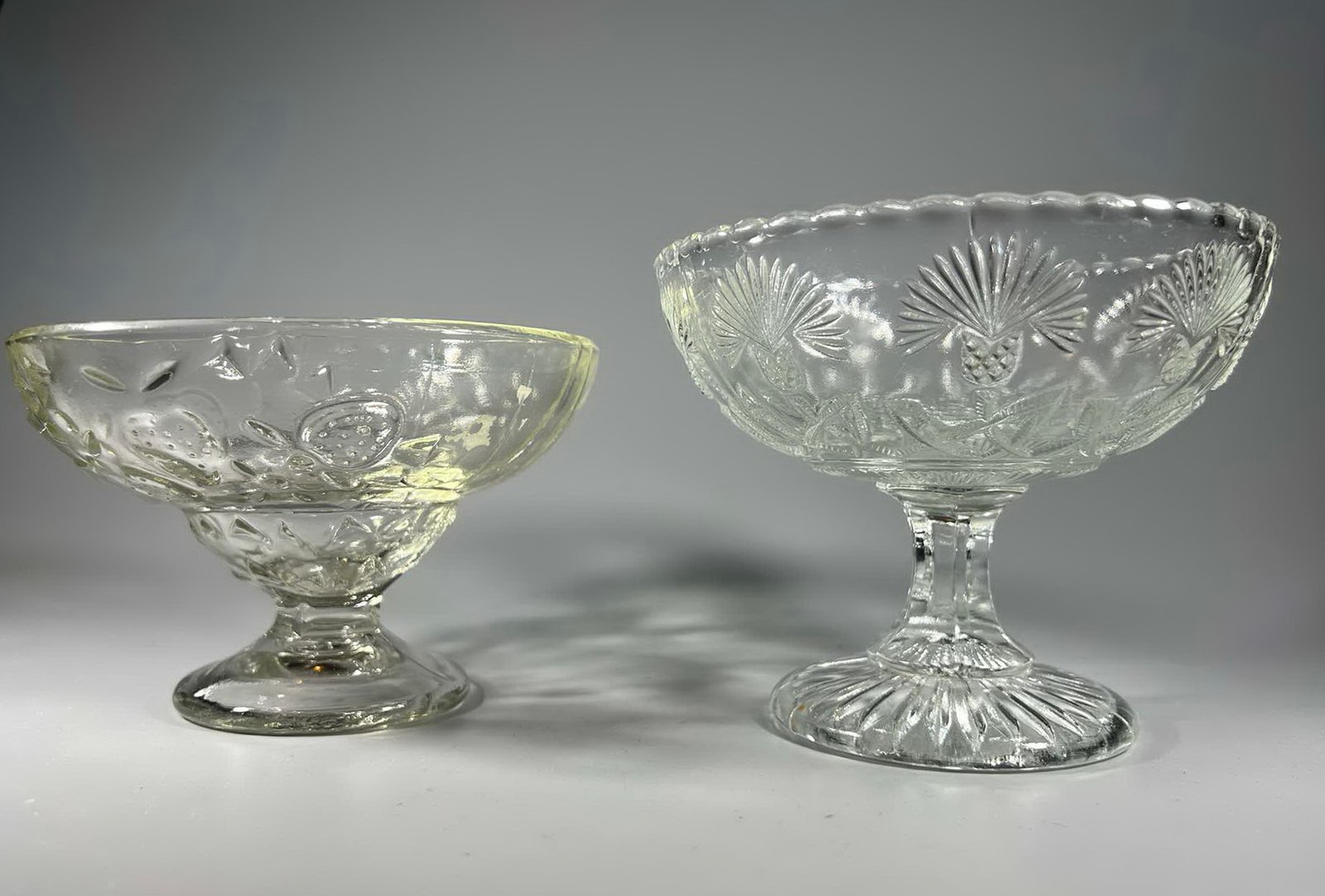 Ledainės, saldaininės reljefinio stiklo sovietinės, tarybinių laikų. 2 vnt. Didesnės aukštis 10, skersmuo 12,5 cm. Mažesnė 8,5, skersmuo 12 cm. Kaina po 13