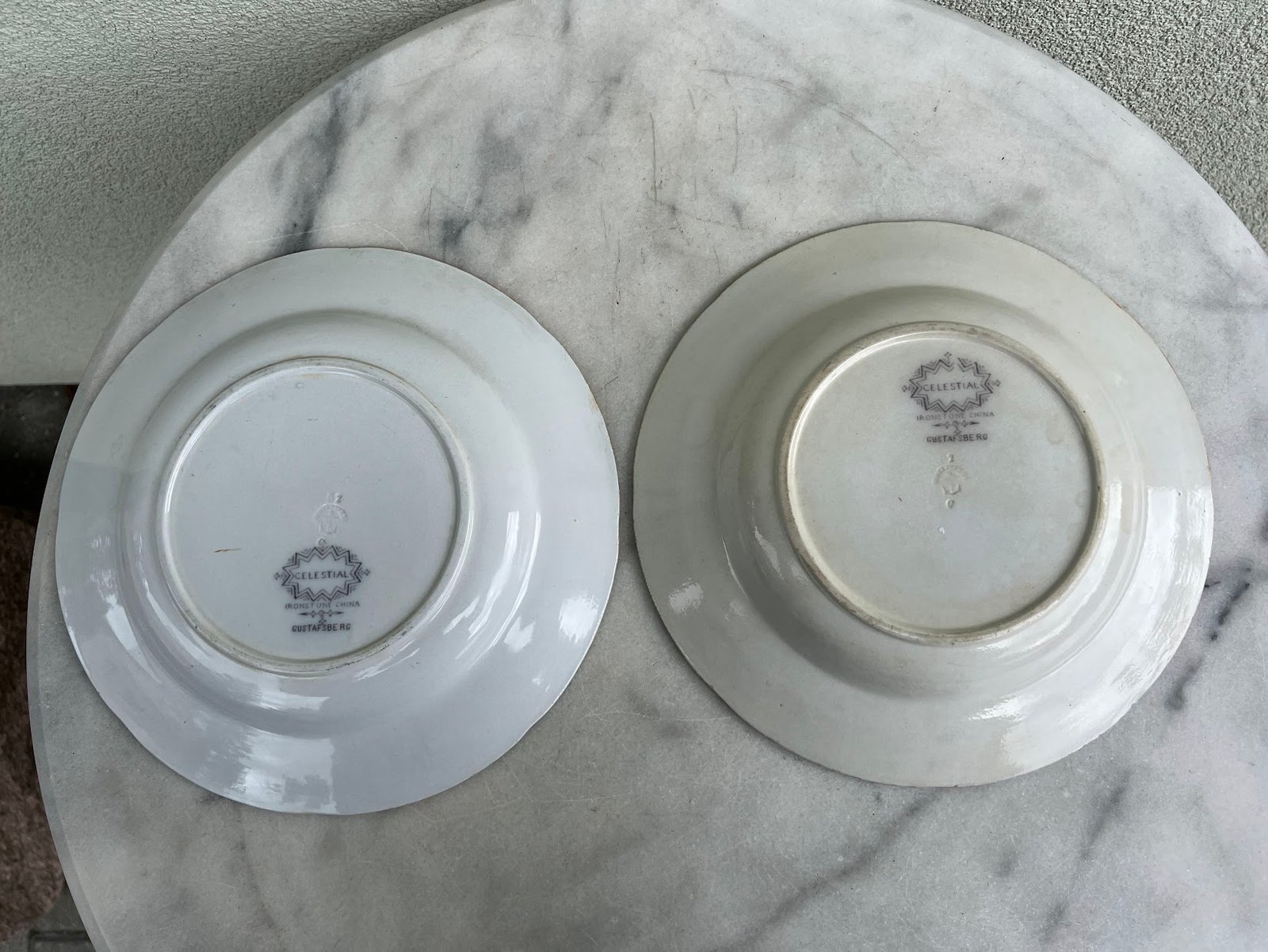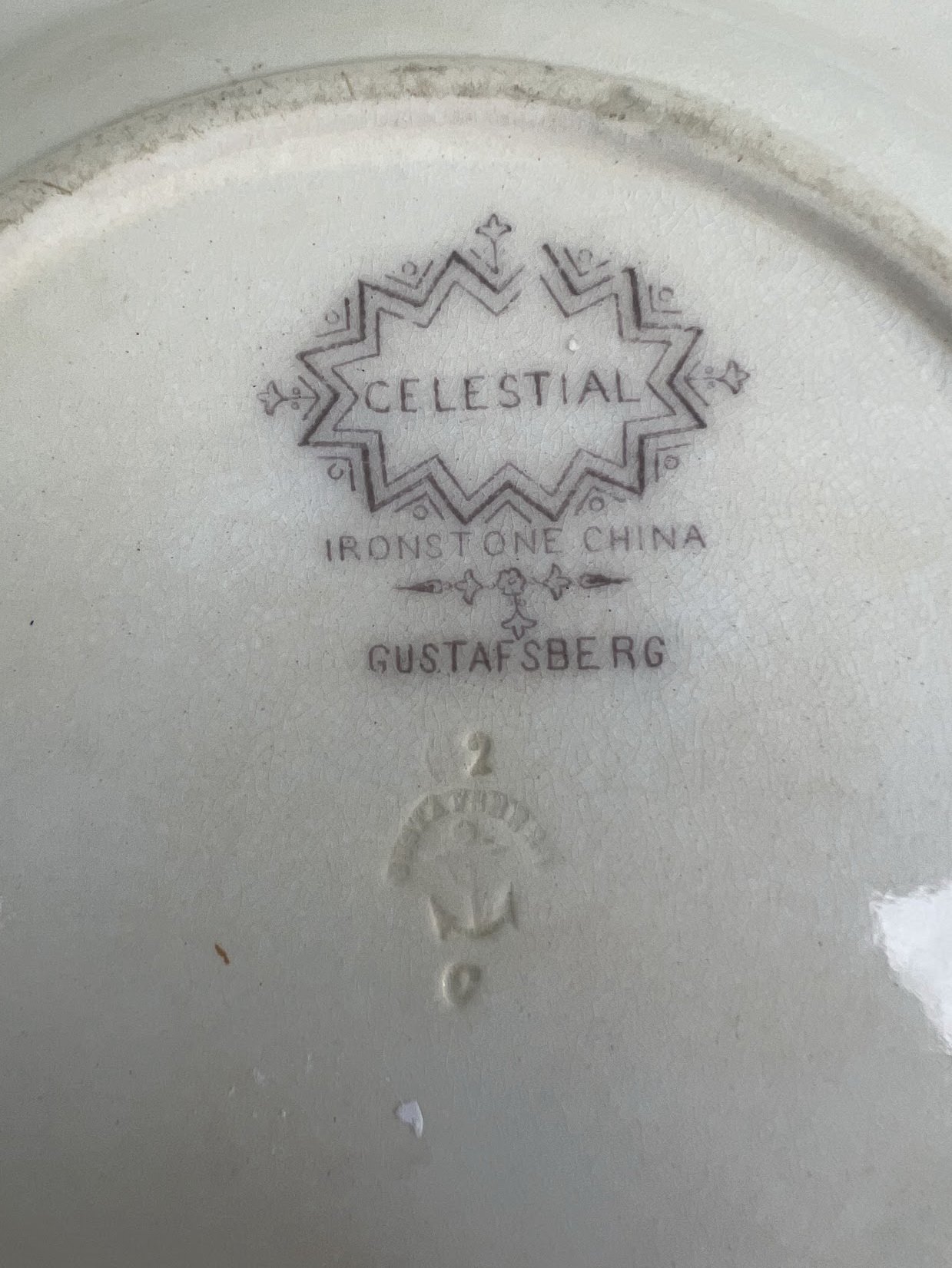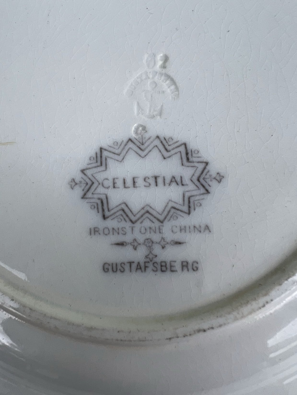 Gili lėkštė, priklausanti Gustafsbergo tarnybai Celistial su kinišku motyvu. Motyvą sudaro trys vyriškos figūros viduryje, iš kurių viena sėdi kėdėje, viena stovi už nugaros su skėčiu ir viena stovi prie raštuoto sulankstomo širmos ir laiko kardą. Fone tvora, vaismedis ir nendrės. Pirmame plane ir aplink kraštą gėlių raštas ir langelis. Gustavsberg gamyklos buvo įkurtos 1825 m. Värmdön mieste, už Stokholmo. 1937 m. Gustavsberg įsigijo Kooperativa förbundet, kuri 1987 m. pardavė didžiąją dalį namų ūkio ir artefaktų skyrių suomių Wärtsilä, todėl buvo įkurta nauja įmonė Rörstrand – Gustavsberg HB..