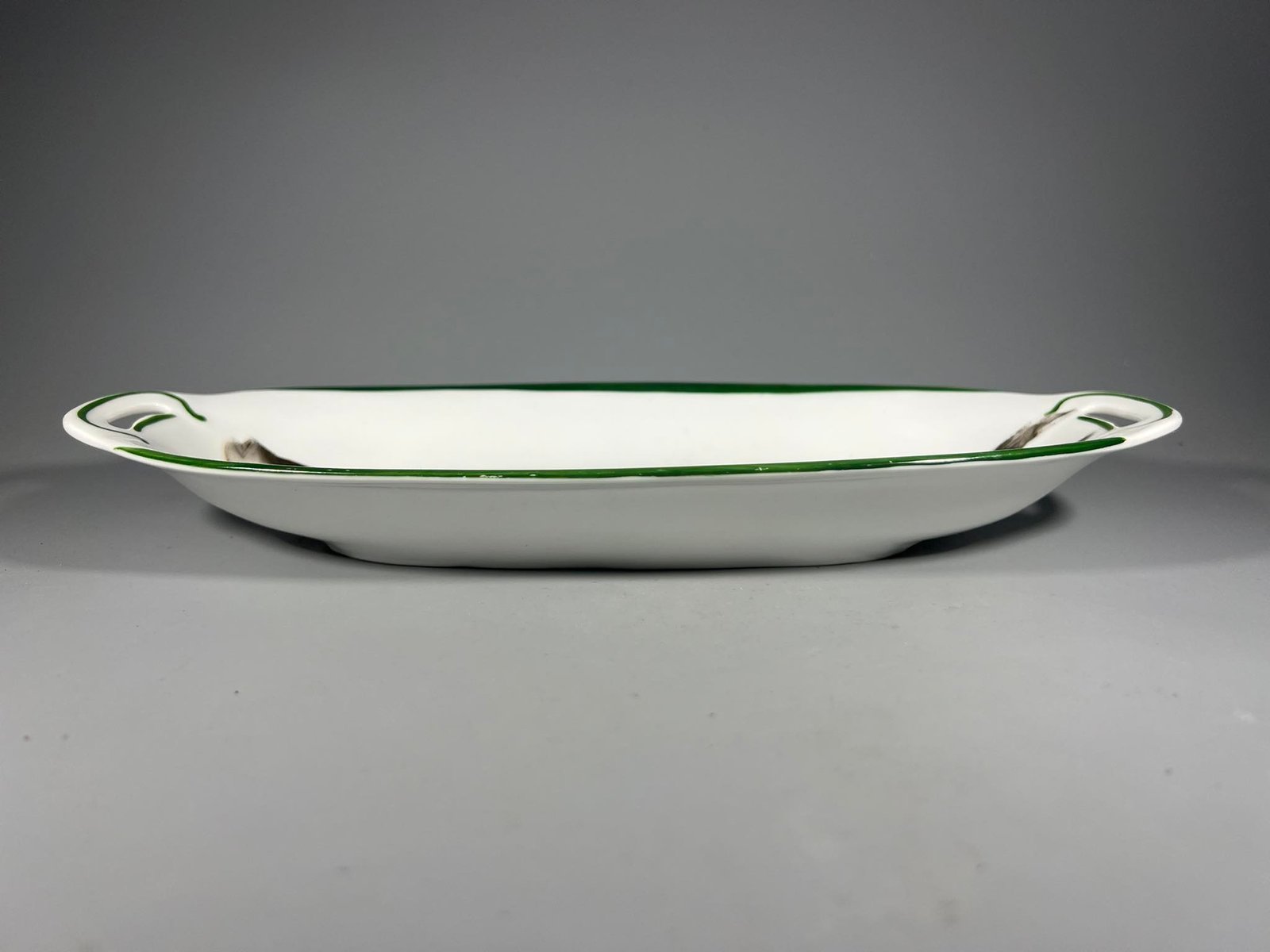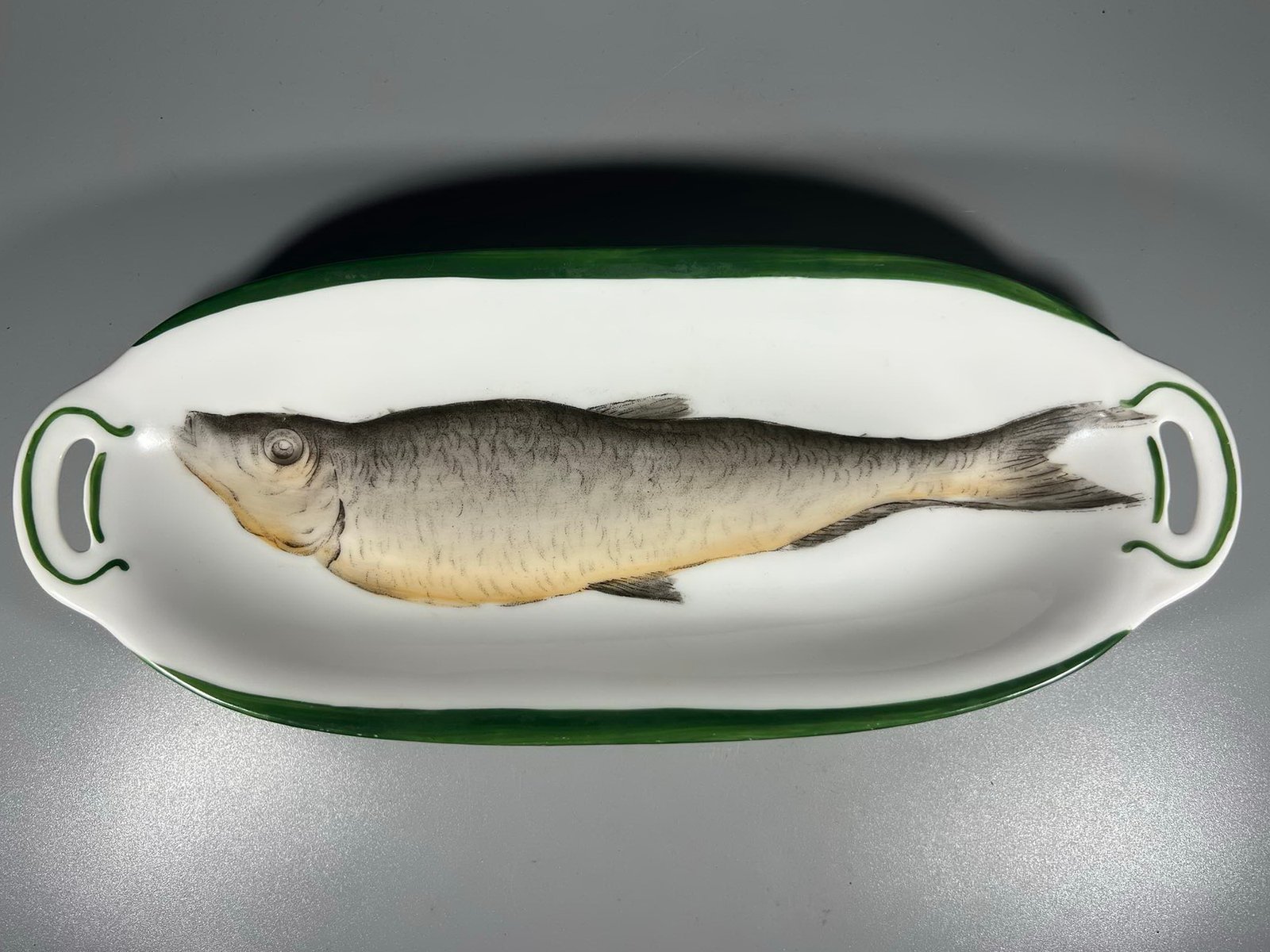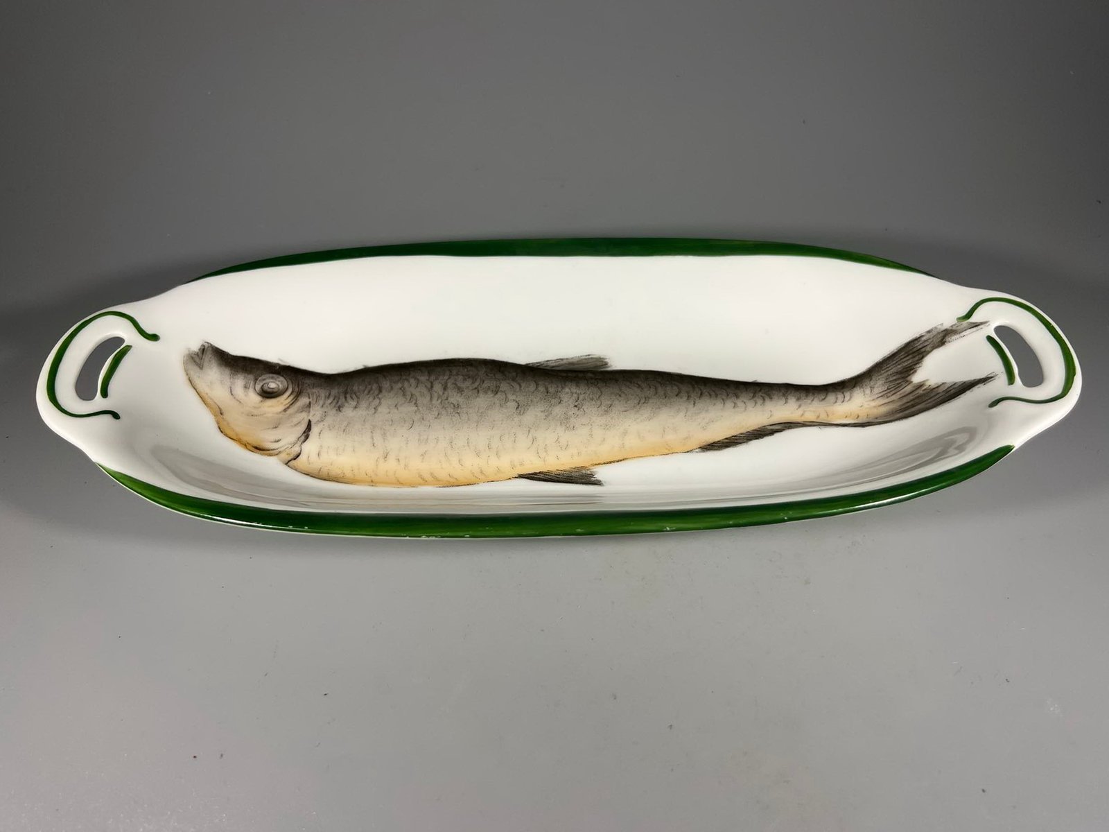 Lėkstė gili puošta žuvimi porcelianinė, antikvarinė. Beyer & Bock B, 1905-1931 m. Ilgis 28, plotis 12, aukštis 4 cm. Kaina 33