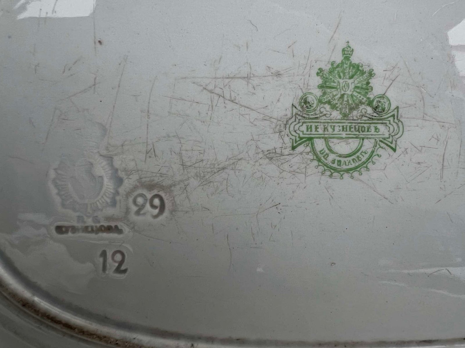 Lėkštė Kuznecov, antikvarinė, apvali, porcelianinė, carinės Rusijos imperijos laikų. 1878 – 1890 m. Puošta ornamentika bei gėlių motyvais. Aukštis 4, ilgis 32, plotis 24 cm. Kaina 58