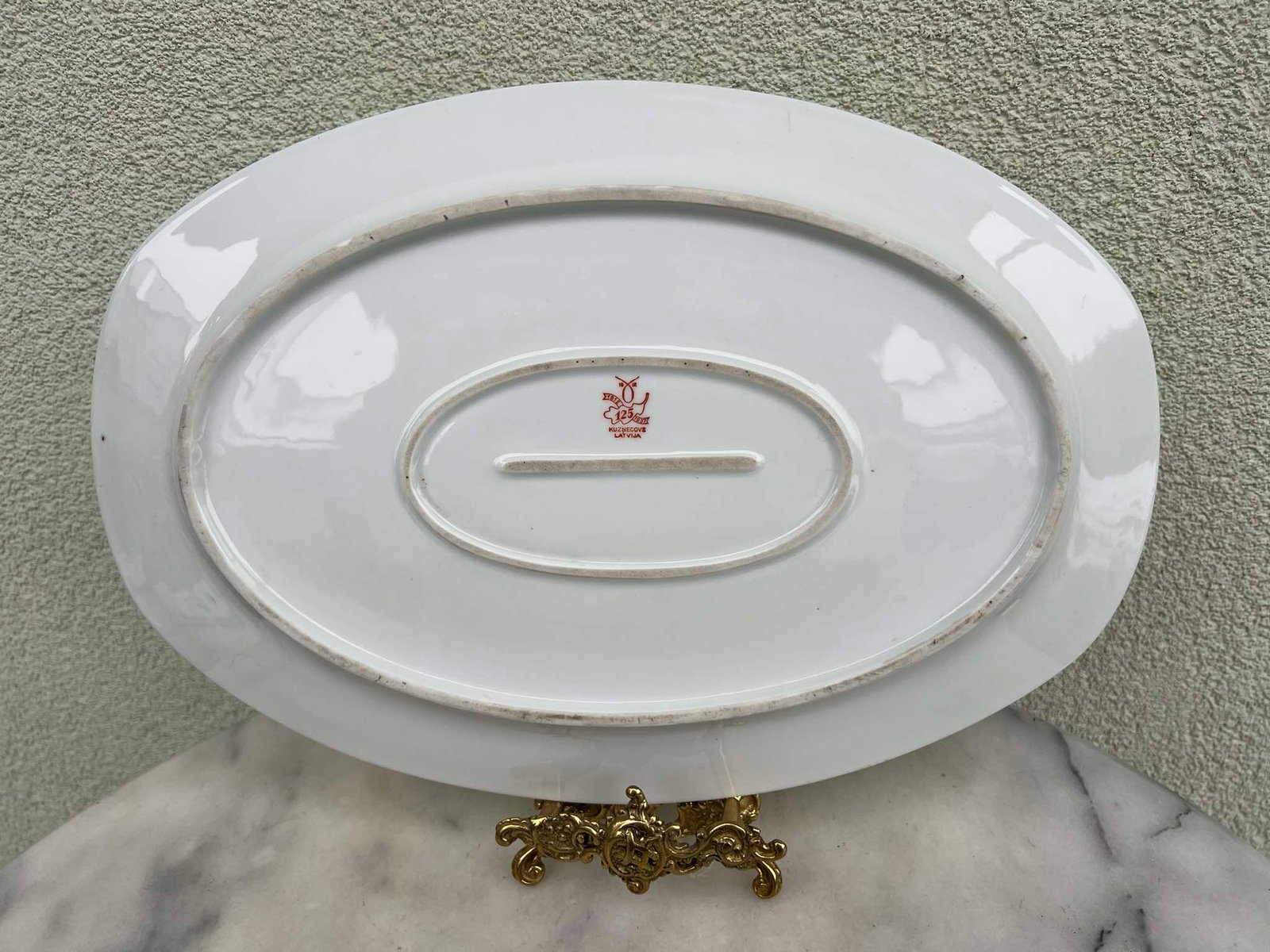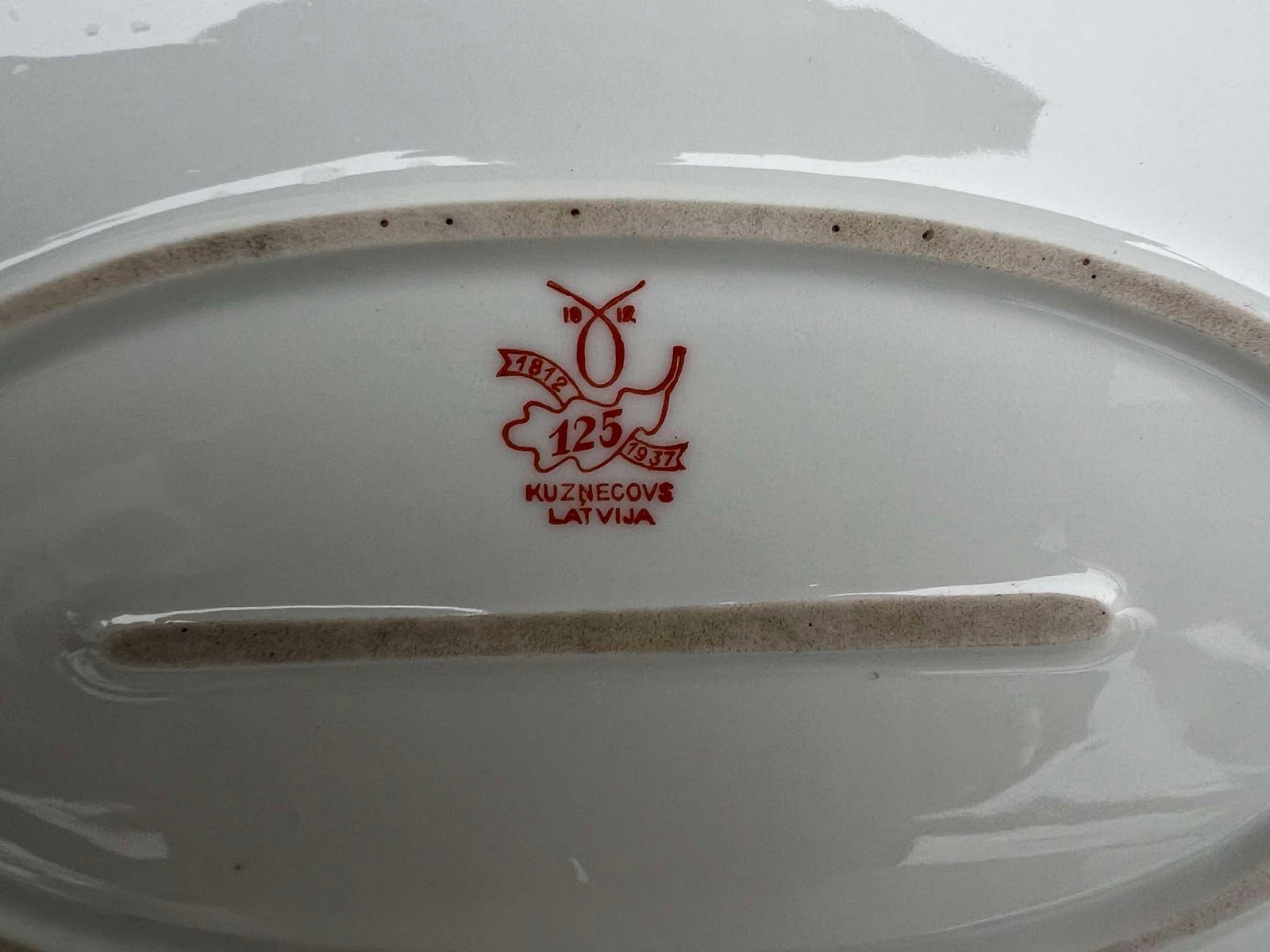 Lėkštė Kuznecovs Latvia, 1812-1937, 125, porcelianinė antikvarinė. Dydis: 26 x 39 cm. Jubiliejinė – 125 metai Kuznecov porceliano fabrikui. Kaina 22