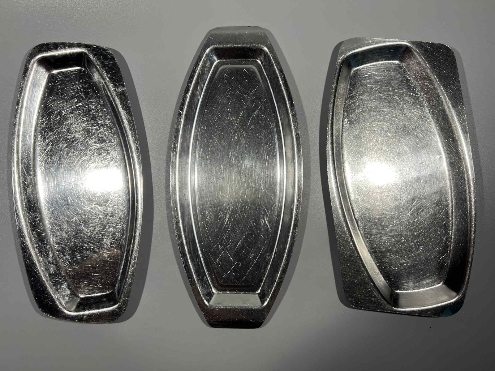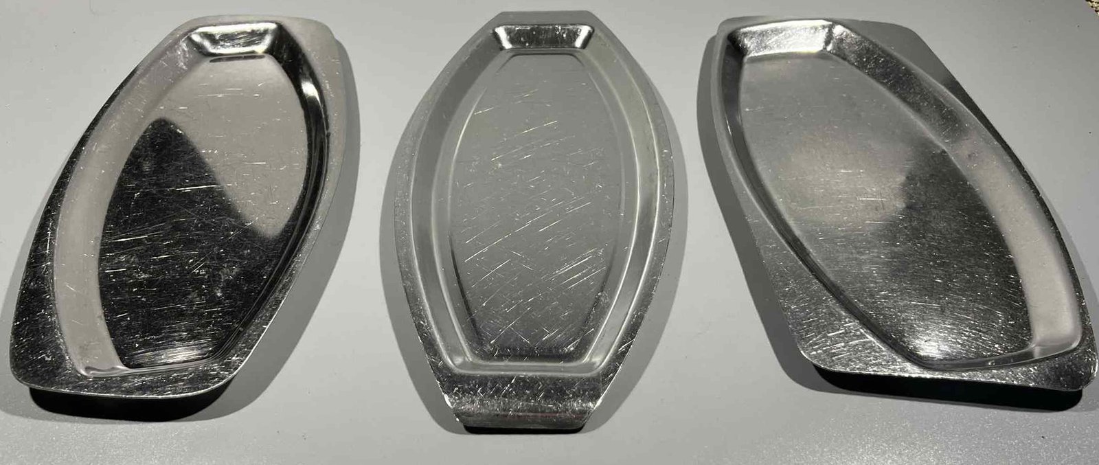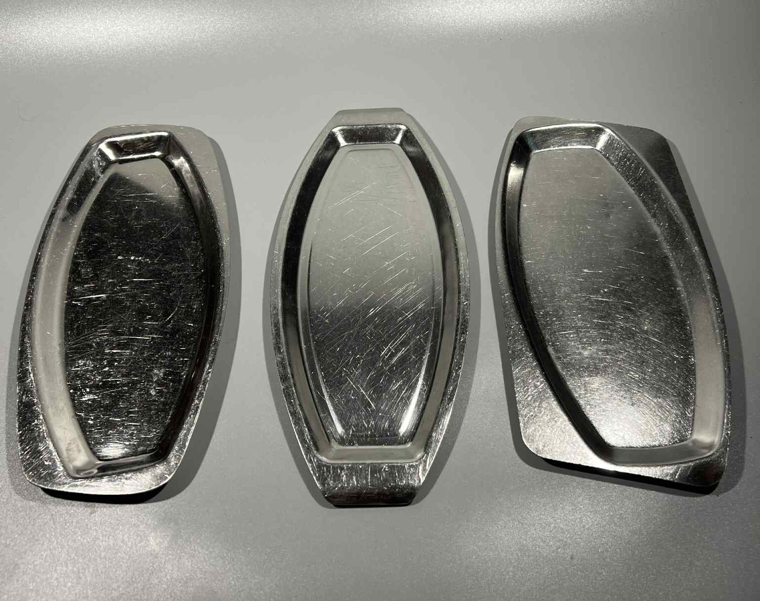Lėkštės metalinės, nerūdijančio plieno, neržaveikos sovietinės, tarybinių laikų, keturkampės. Ilgis 30, plotis 13,5, aukštis 1 cm. Pirmųjų 33 vnt. Antrųjų 14 vnt. Trečiųjų 2 vnt. Kaina po 13