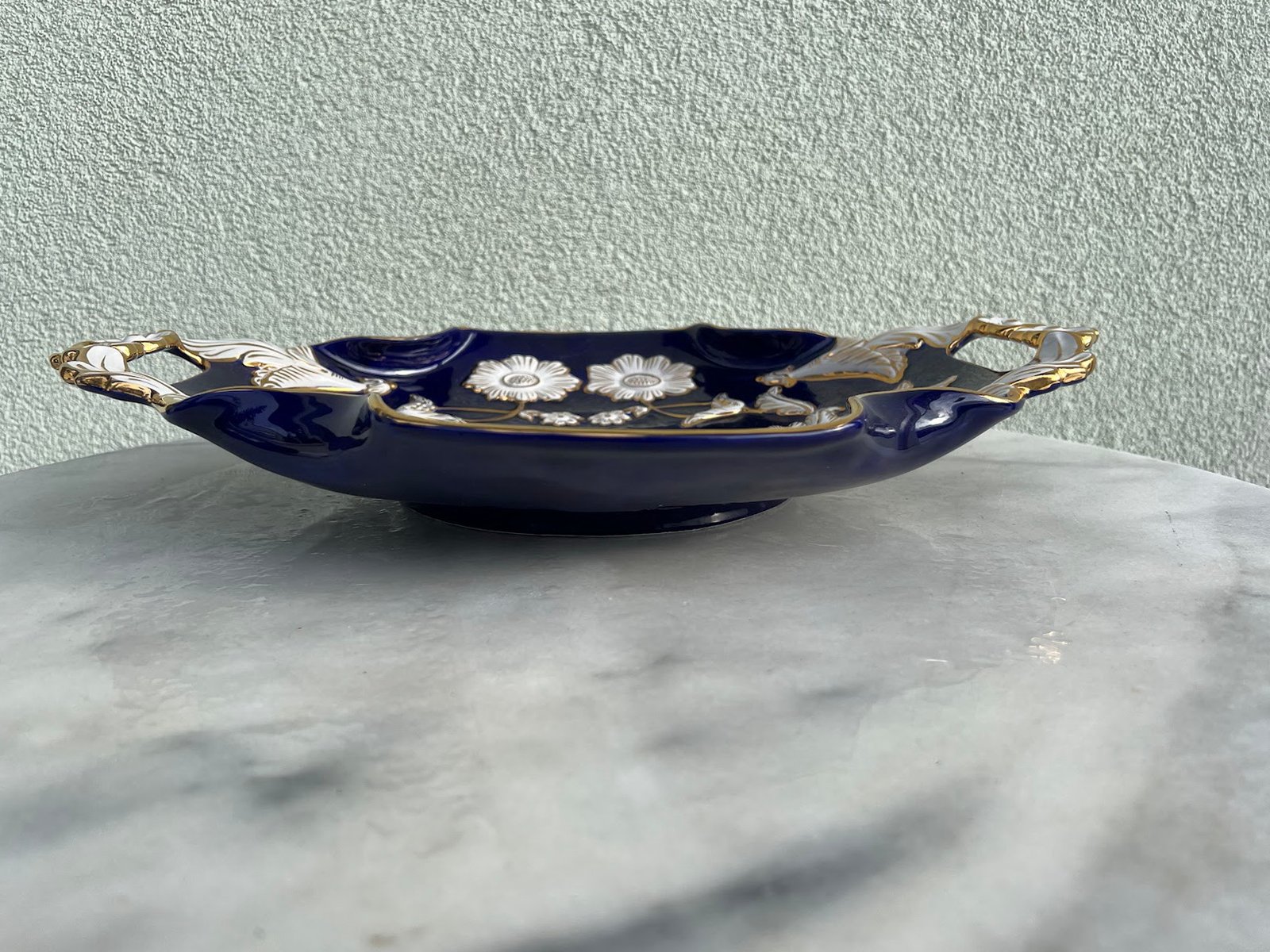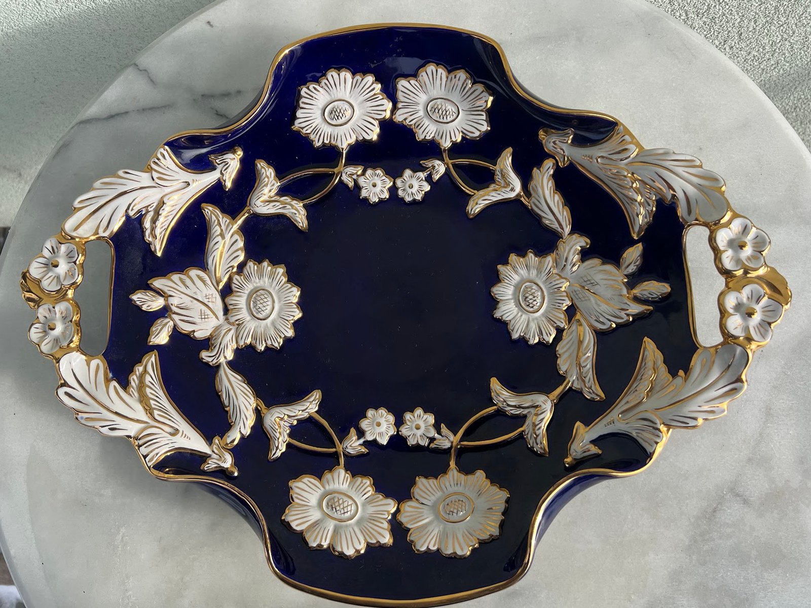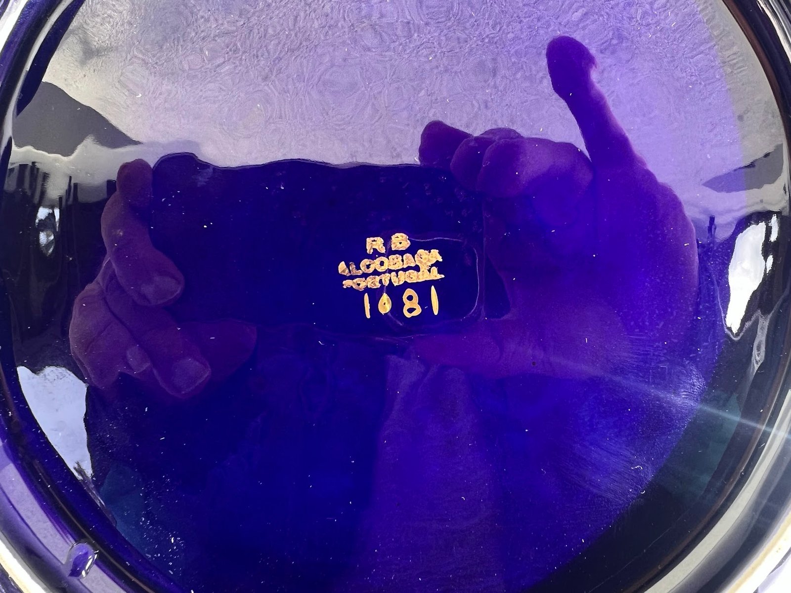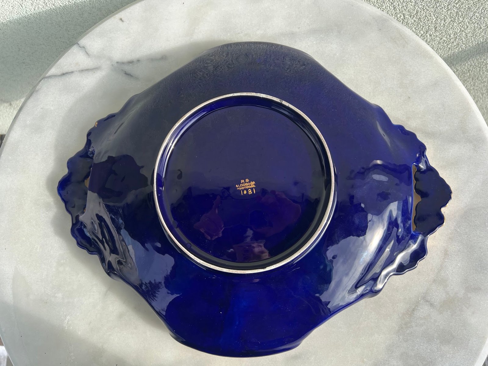 Tai prabangi ir didelė kobalto mėlynumo lėkštė arba dubuo su rankenėlėmis, gausiai dekoruotas auksuotomis gėlėmis ir reljefiniais krašteliais. Gamintojas: RB Alcobaça (Raul da Bernarda & Filhos). Tai viena seniausių ir garsiausių Portugalijos keramikos gamyklų, įsikūrusi Alko-basos (Alcobaça) mieste Portugalijoje. Modelio numeris: 1081 (ranka įrašyti skaičiai apačioje nurodo konkretų formos ar dizaino numerį).