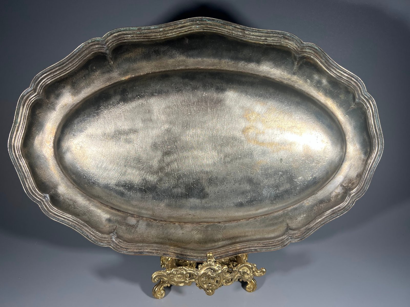 Serviravimo lėkštė, sidabruota, antikvarinė. 1939 m. Priklausė tarpukario kauniečių šeimai, inicialai V S. 1939 I 5. Dydis 23 x 35 cm. Kaina 18