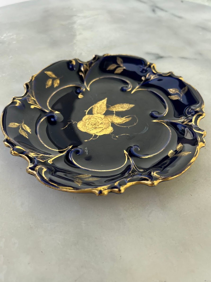 Lėkštė porcelianinė, kobaltas, auksavimas, Jlmenau Graf von Henneberg, Vokietija. Kaina 28