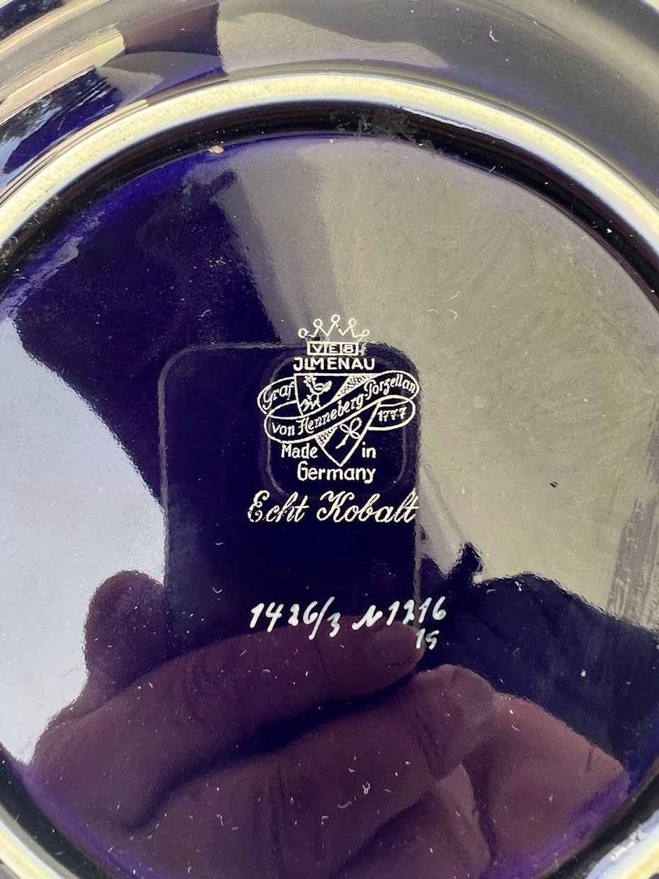 Gamintojas: „Jlmenau Graf von Henneberg Porzellan“ (Vokietija). Medžiagos: Porcelianas, dekoruotas „Echt Kobalt“ (tikro kobalto) mėlyna spalva ir aukso ornamentais. Dizainas: Indas turi banguotus kraštus bei reljefinius, iškilius gėlių motyvus. Laikotarpis: Šio tipo gaminiai dažniausiai datuojami 1930–1950 m.. Kai kurie panašūs indai buvo gaminami ir vėlesniu VDR (Vokietijos Demokratinės Respublikos) laikotarpiu. Paskirtis: Dažniausiai įvardijamas kaip dekoratyvinė lėkštė, saldaininė ar serviravimo indas.