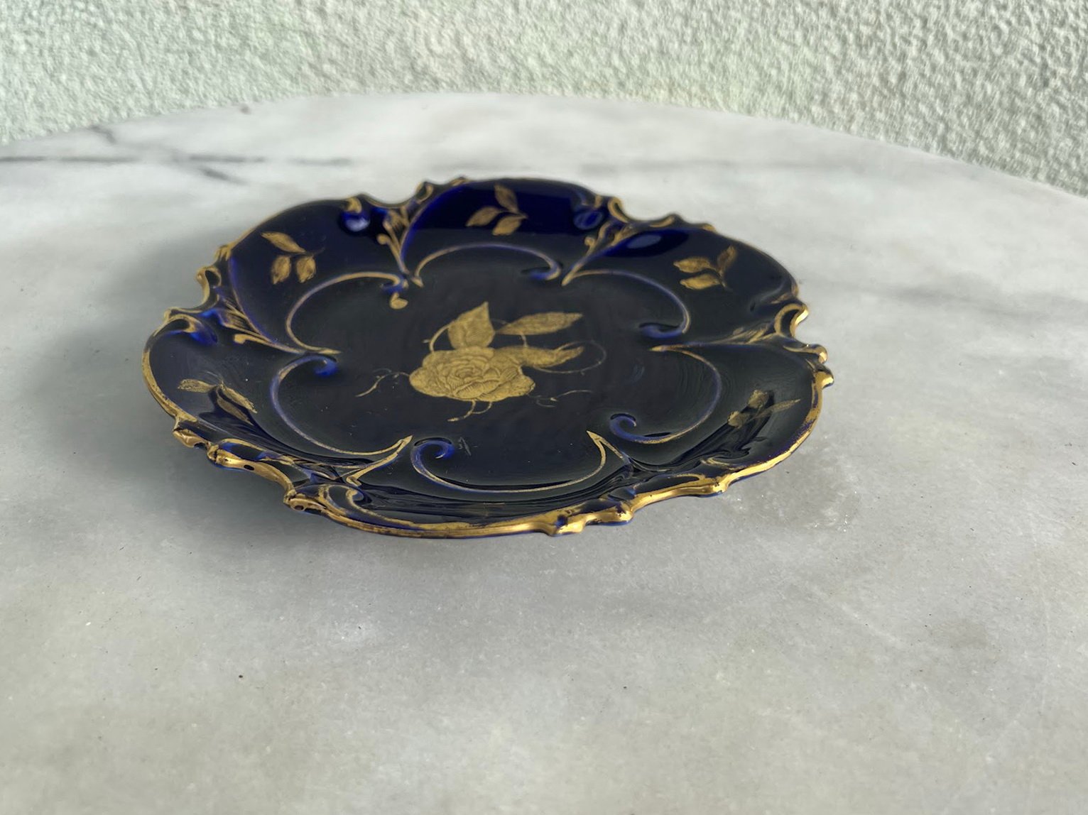 Lėkštė porcelianinė, kobaltas, auksavimas, Jlmenau Graf von Henneberg, Vokietija. Skersmuo 17 cm. Kaina 28