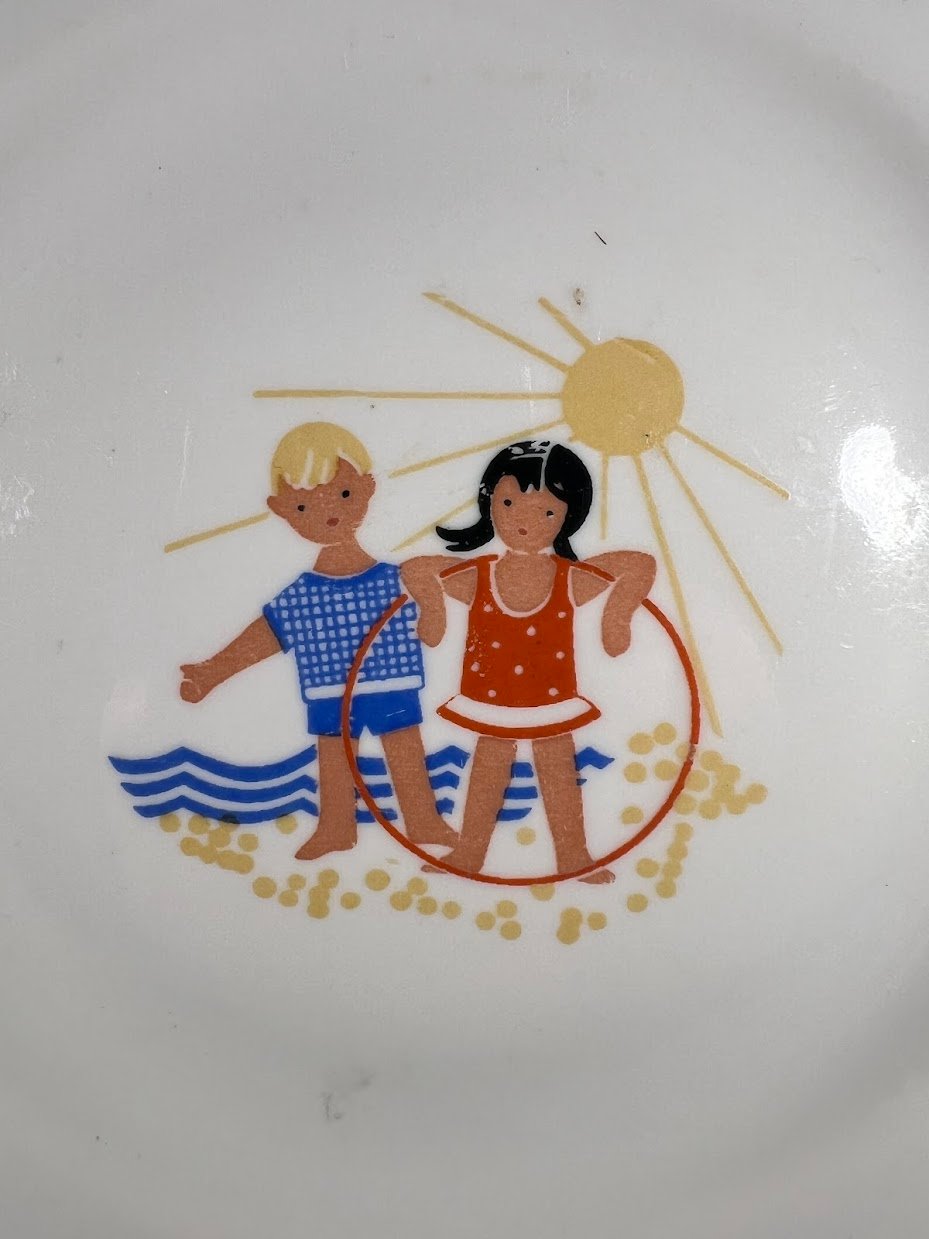 Lėkštė porcelianinė, latviška, vaikystės tema, Rygos porceliano fabriko, Rīgas Porcelāna Rūpnīca (RPR). 1960 m. Skersmuo 20 cm. Piešinys paprastas, stilizuotas, ryškių spalvų būdingū tam laikotarpiui. Kaina 7
