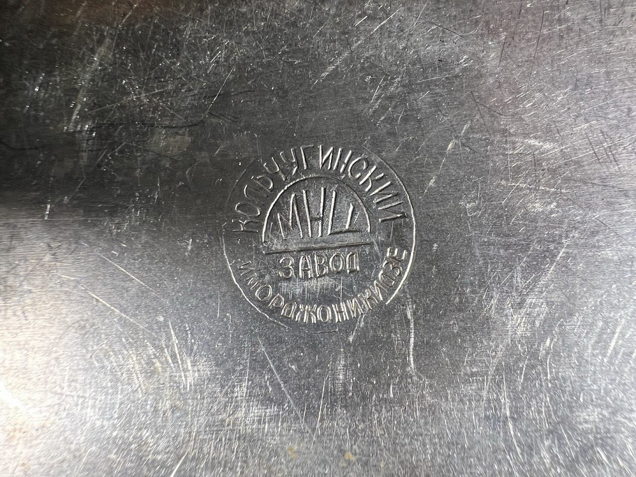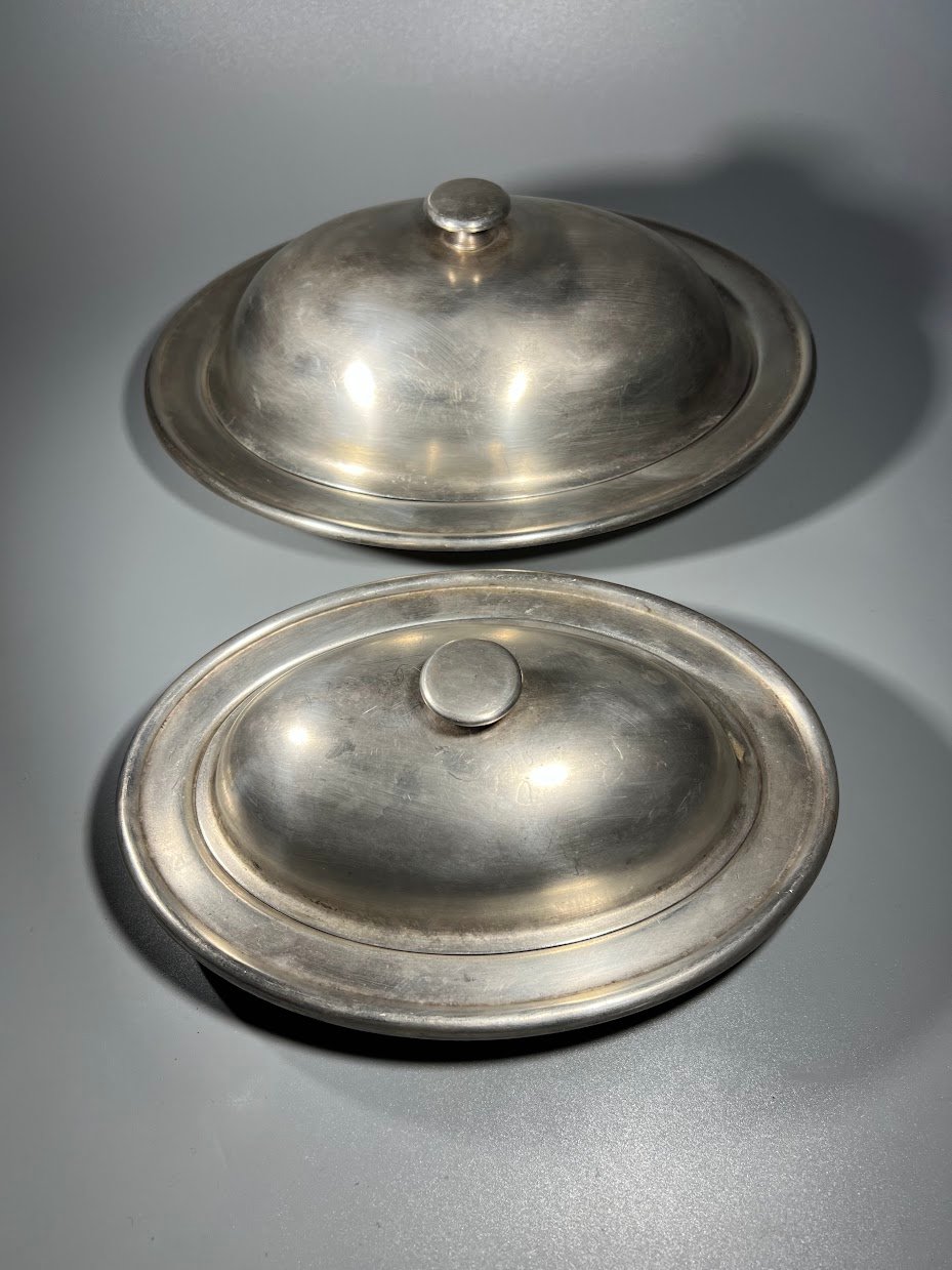 Lėkštė serviravimo su dangčiu, klošas (pranc. cloche – varpas). Indas naudojamas maistui uždengti ir patiekti. КОЛЬЧУГИНСКИЙ ЗАВОД, KOLCHUGINSKY ZAVOD. 1946–1962 m. Didesnis ir mažesnis, 2 vnt. Kaina 23 ir 21 Didesnis ir mažesnis, 2 vnt. Didesnis: 23 x 29 cm. Mažesnis: 14 x 23 cm. Kaina 23 ir 21