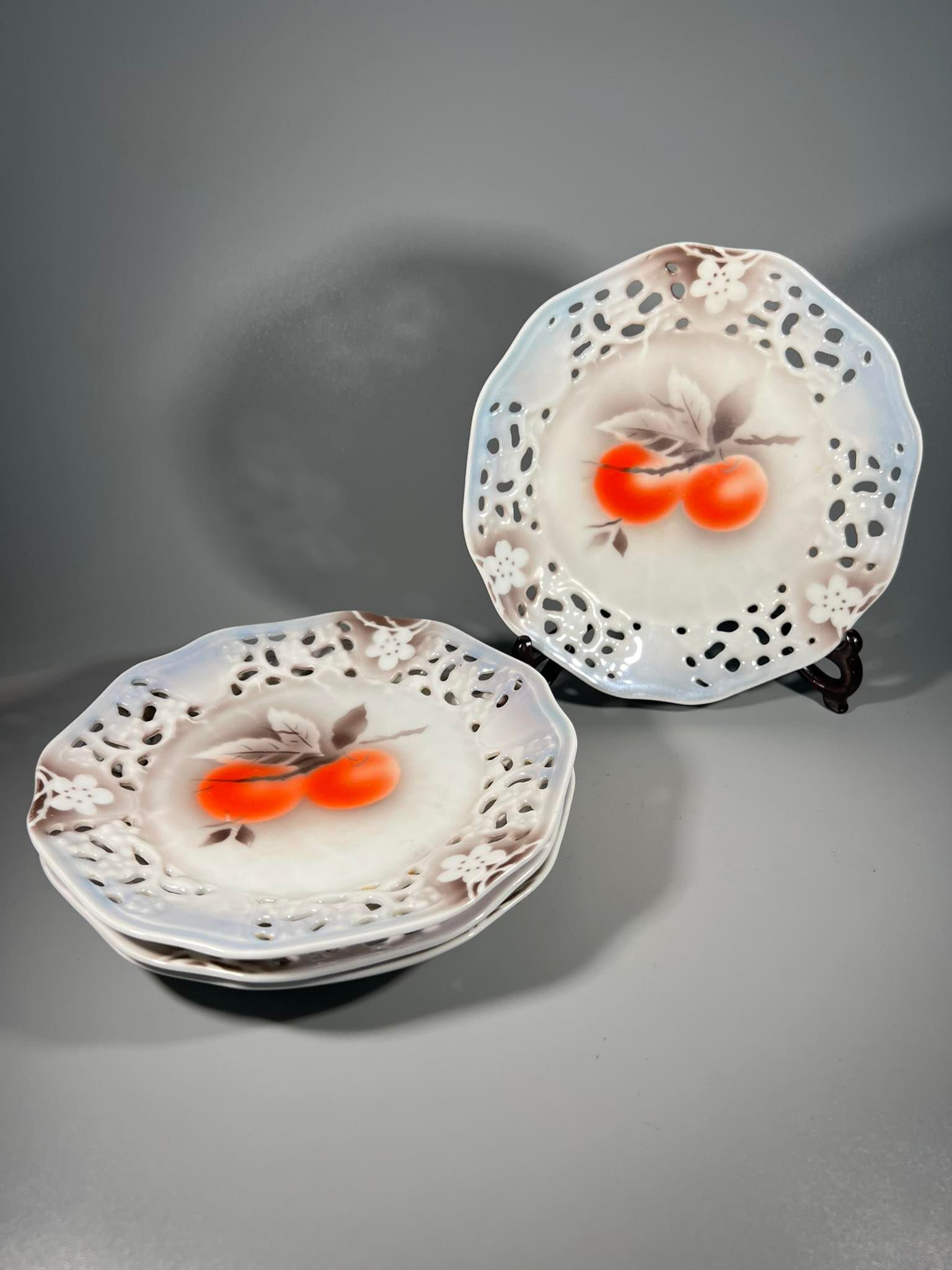 Lėkštutės porcelianinės, ažūrinės antikvarinės, tarpukario laikų Victoria China Czechoslovakia. Skersmuo 18 cm. 4 vnt. Kaina po 8