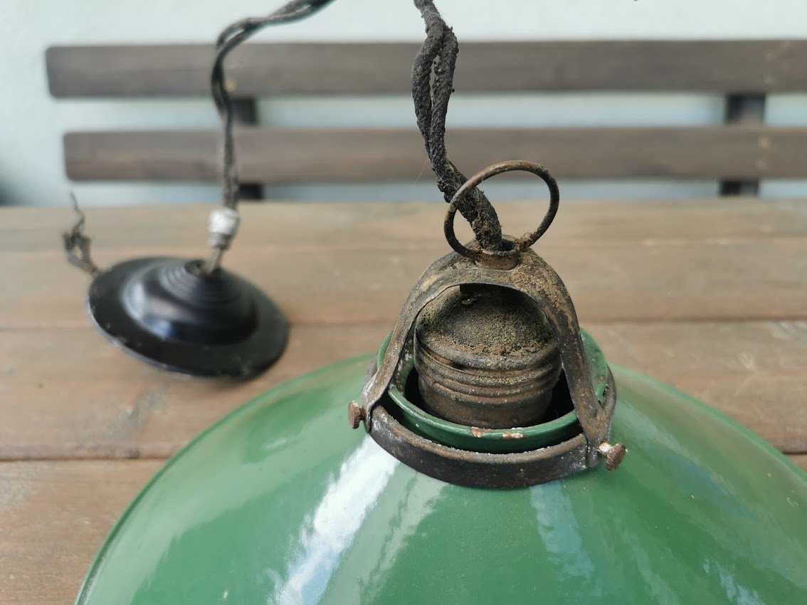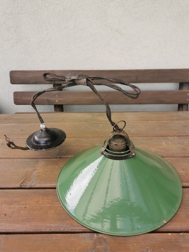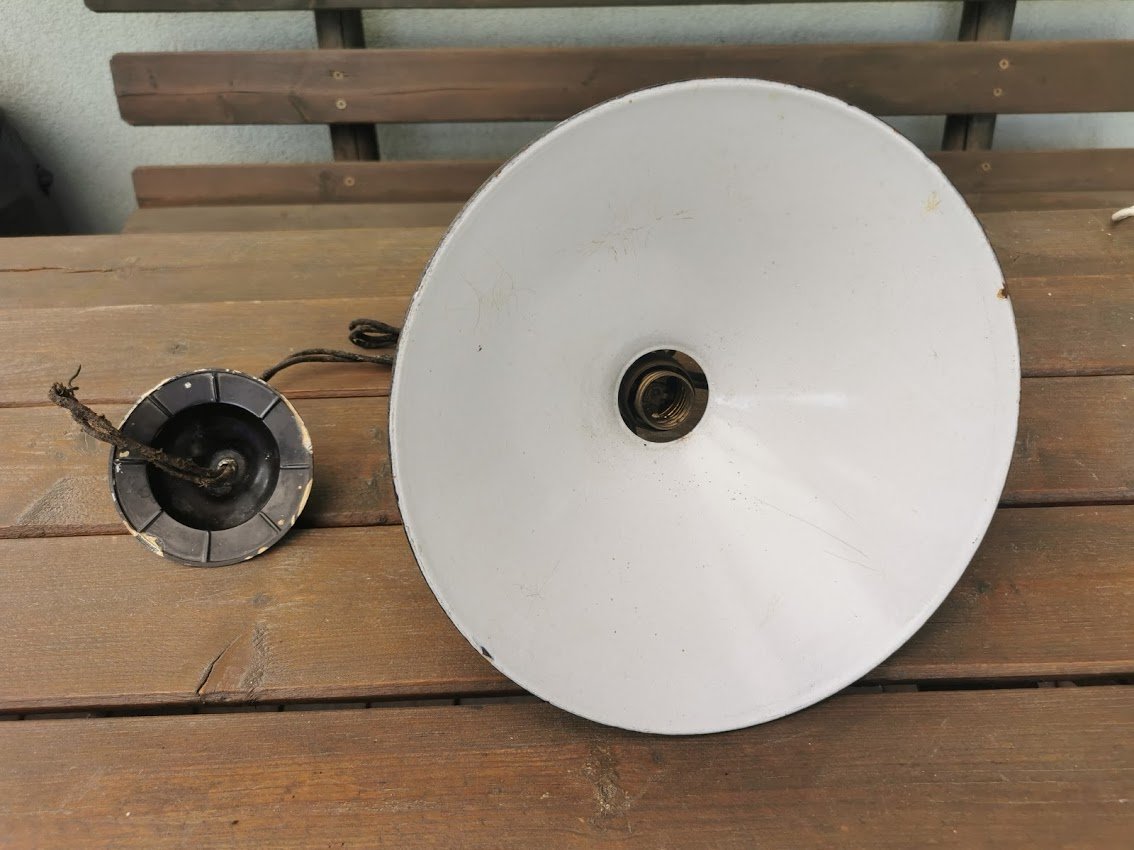 Lempa, šviestuvas emaliuotu skardiniu gaubtu, antikvarinis. Visos detalės originalios. Gaubto skersmuo 27 cm. Kaina 83