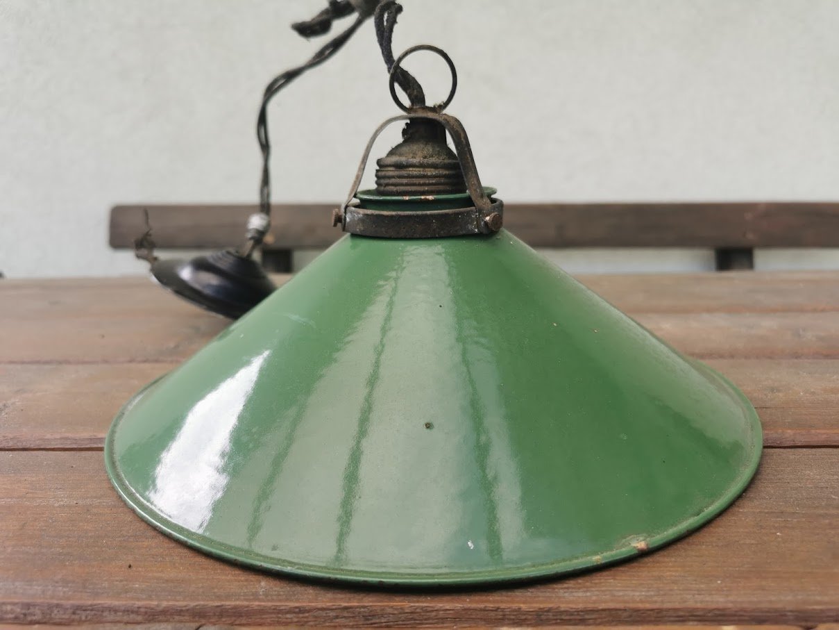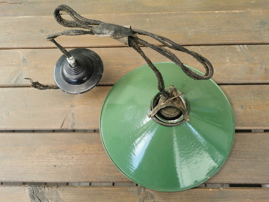 Lempa, šviestuvas emaliuotu skardiniu gaubtu, antikvarinis. Kaina 83