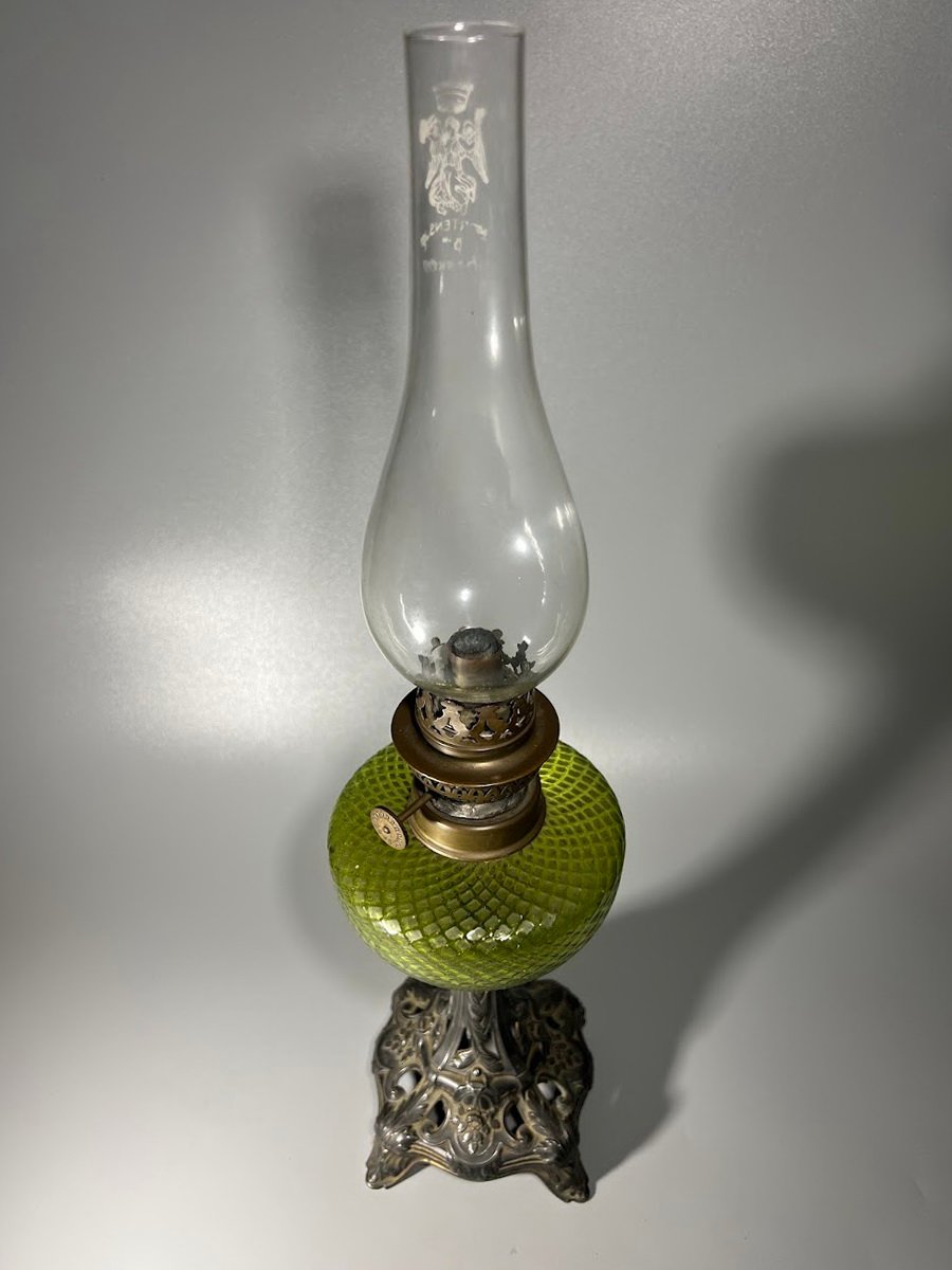 Lempa žibalinė, antikvarinė, prancūziška ažūriniu metaliniu pagrindu. Kaina 88
