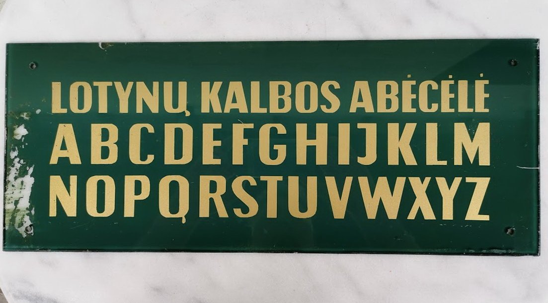 Lentelė stiklinė tarybinių laikų LOTYNŲ KALBOS ABĖCĖLĖ. Kaina 27