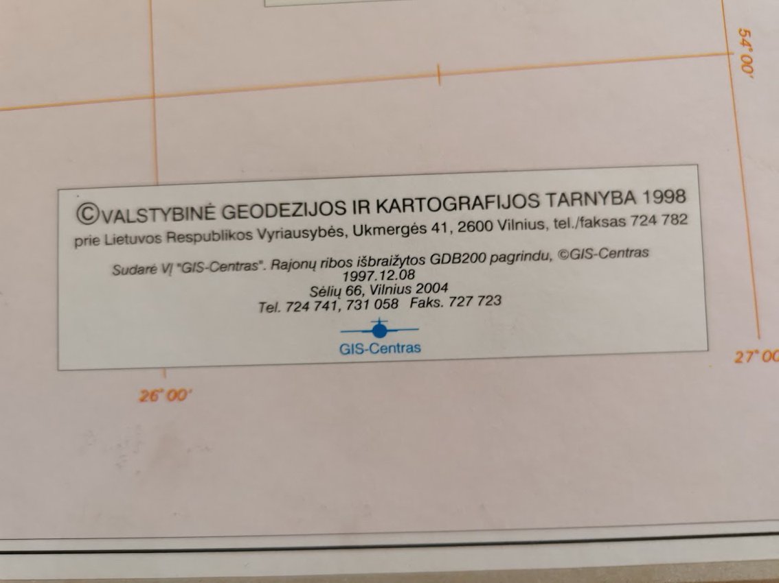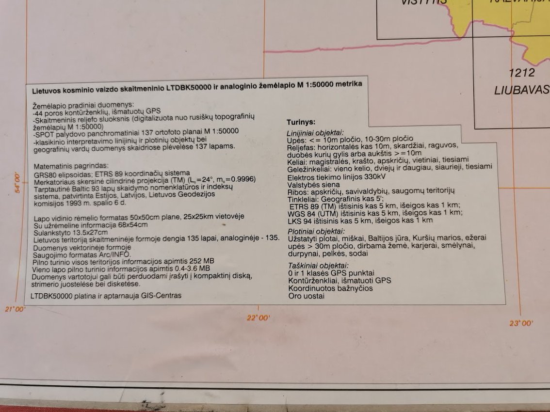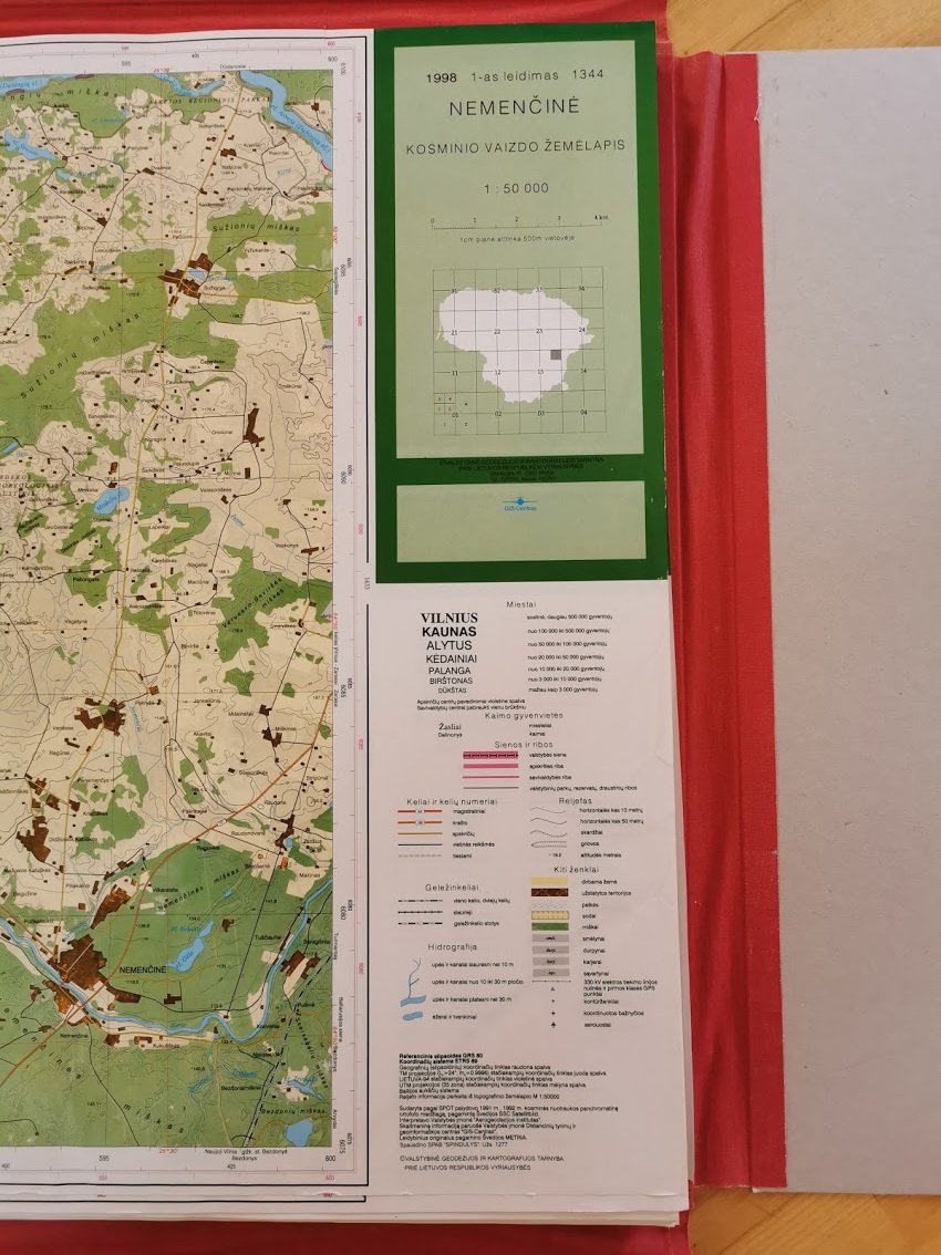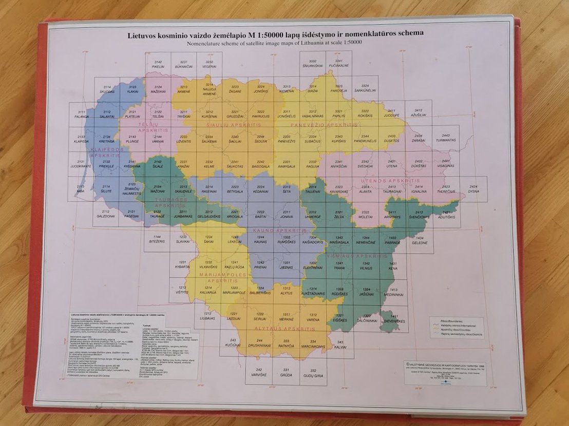 Lietuvos kosminio vaizdo žemėlapio M 1 : 50000 lapų išdėstymo ir nomenklatūros schema. Sudaro 137 žemėlapiai. 1998 m. Originalas. Kaina 365