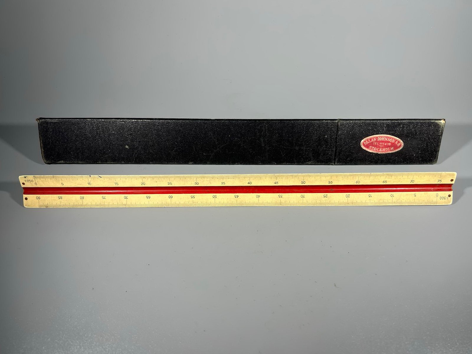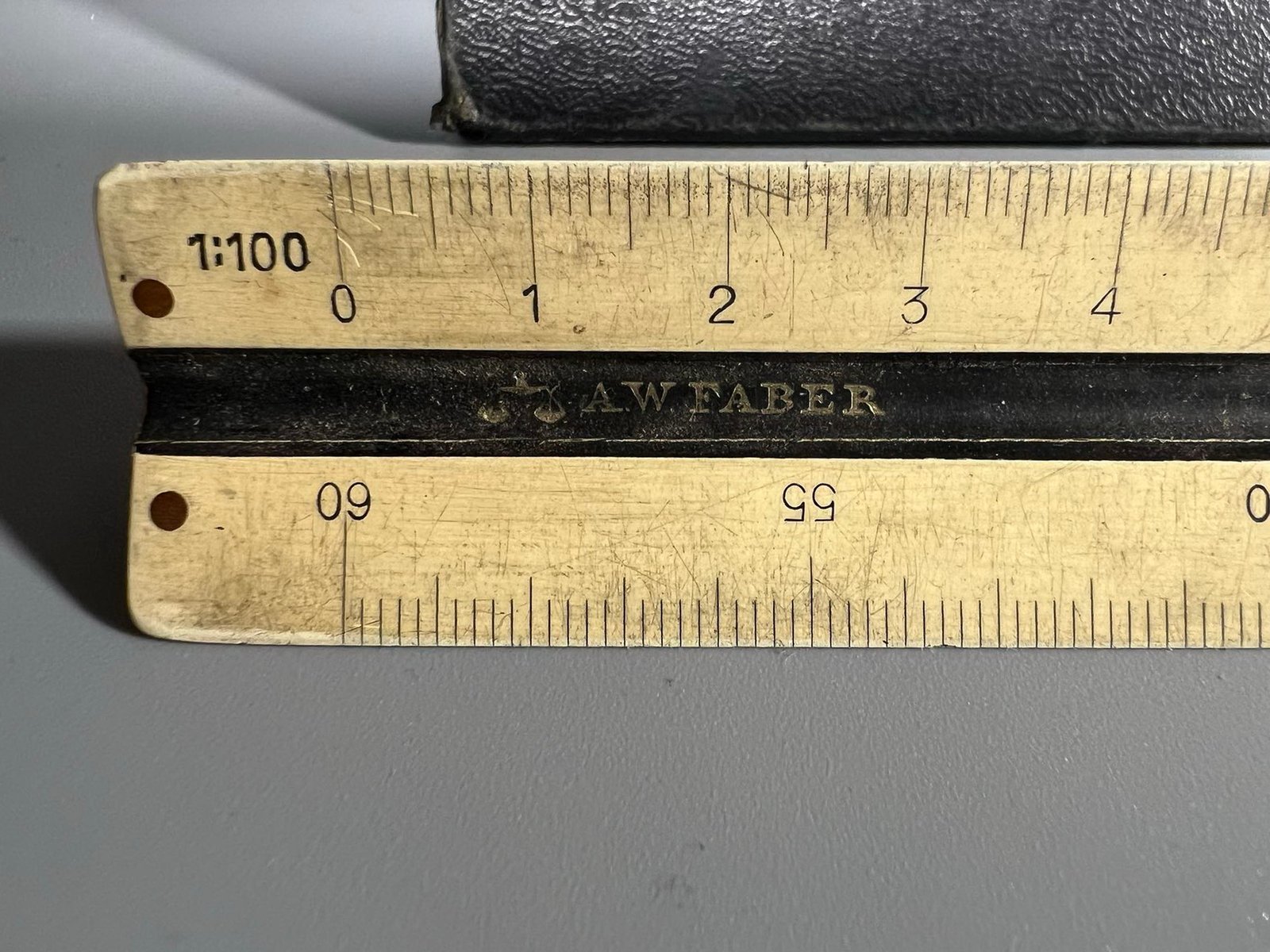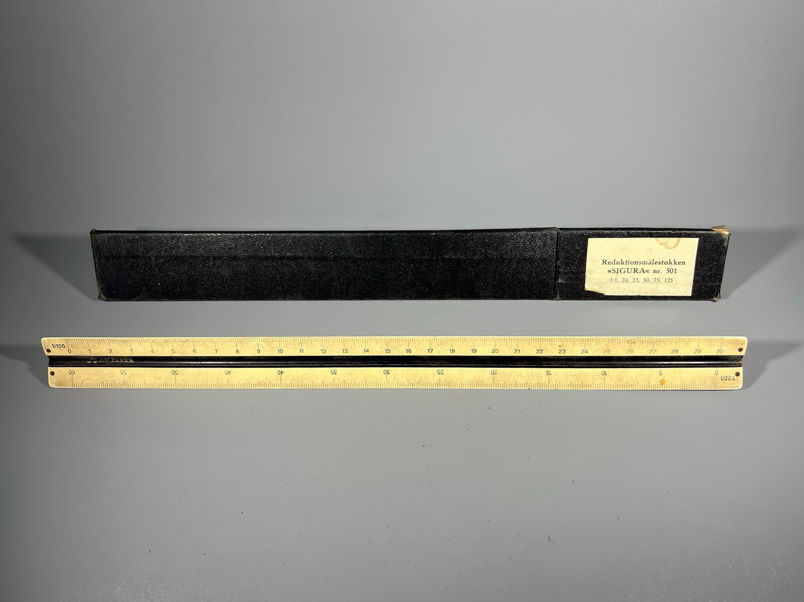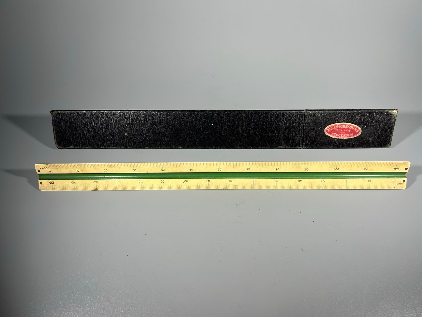 Liniuotė antikvarinė trikampė A. W. Faber. Vokietija. 1940 m. Dėžutės ilgis 33 cm. Liniuotė buvo pardavinėjama Švedijoje. Kaina 23