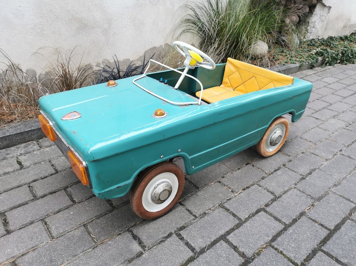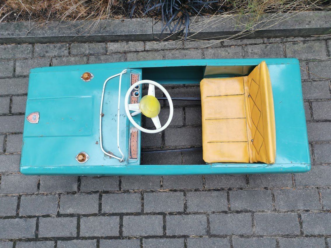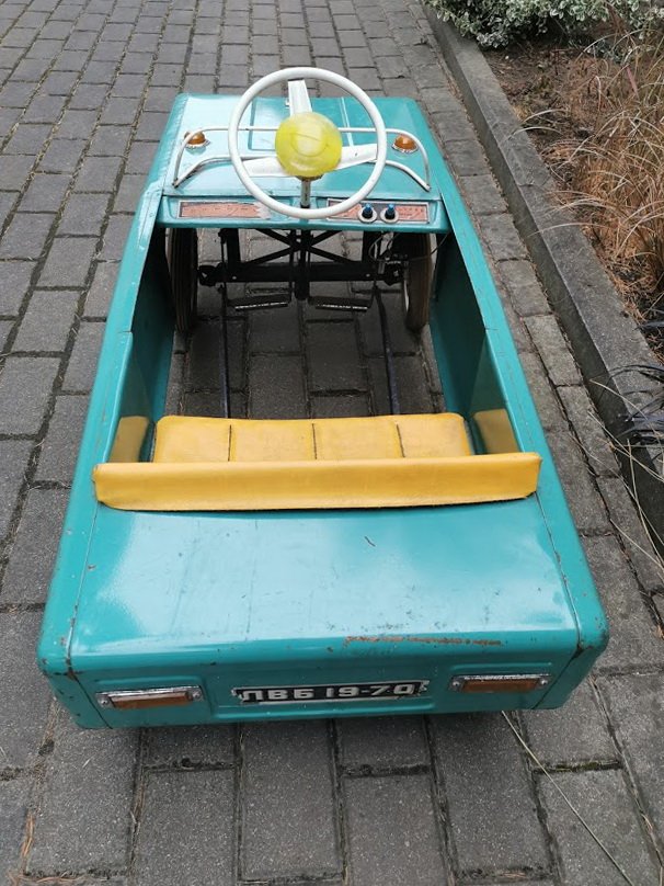 Mašina skardinė, pedalinė, minama, vaikiška, tarybinė, sovietinių laikų. Ilgis 107, plotis 42, aukštis su vairu 50 cm. Kaina 585