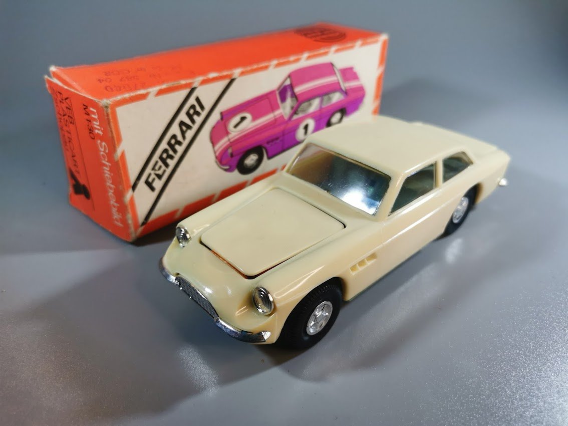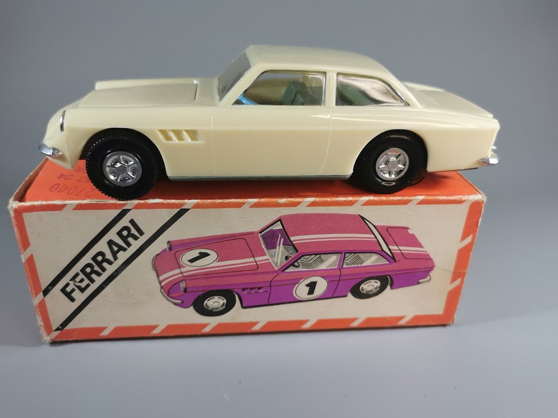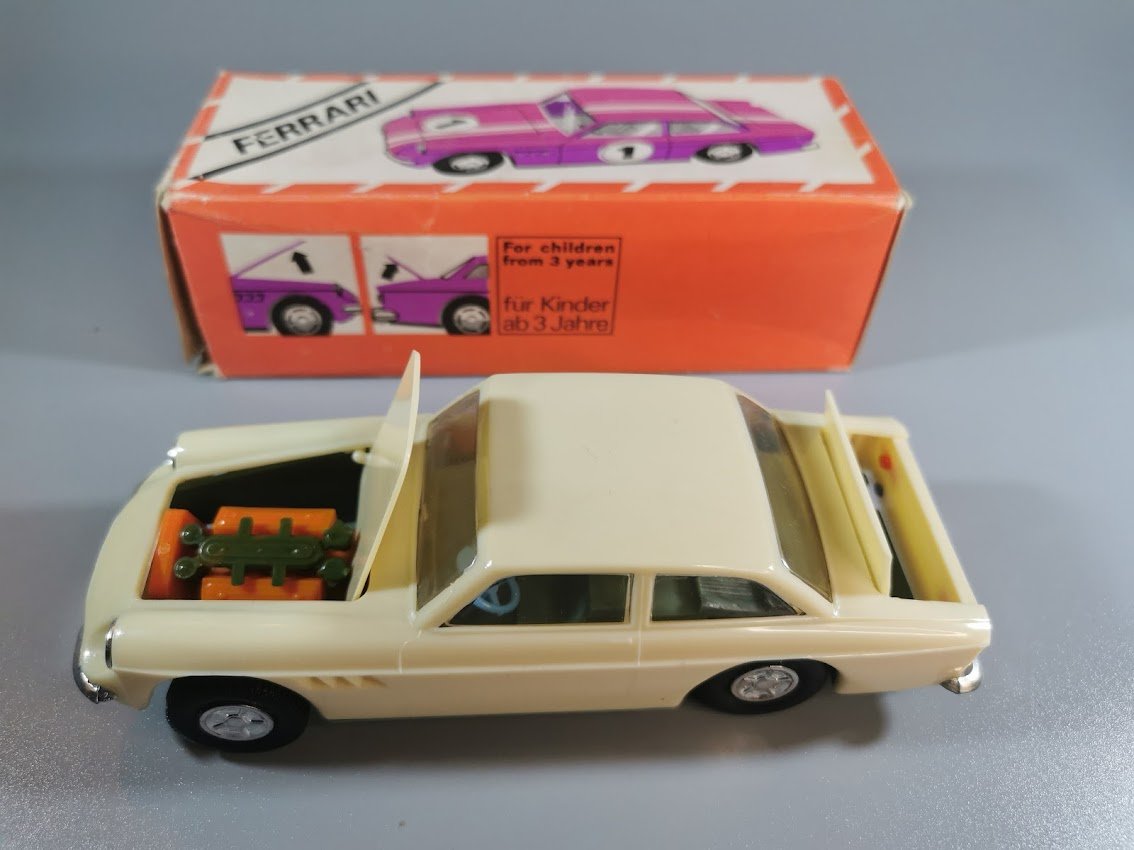Mašinėlė Ferrari originalioje dėžutėje tarybinių laikų. Atsidaro kapotas ir bagažinė. Dėžutės ilgis 17, plotis 5, aukštis 6,5 cm. Kaina 38